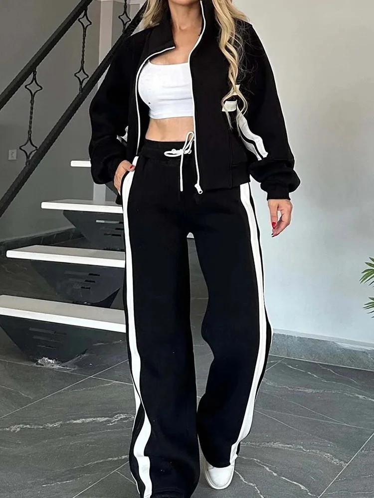 Women Casual 2025 Long Sleeve Simple Outfit, Spring Autumn Wide Leg Pants Fashion Suits, Turn-Down Collar Patchwork Ladies Sets