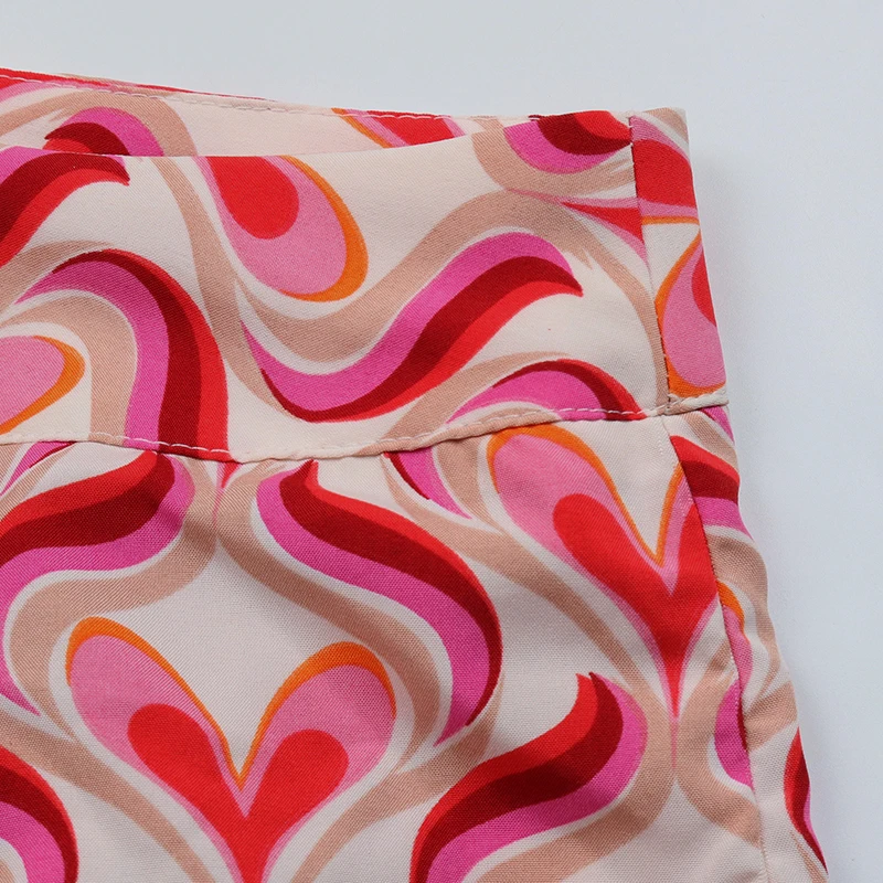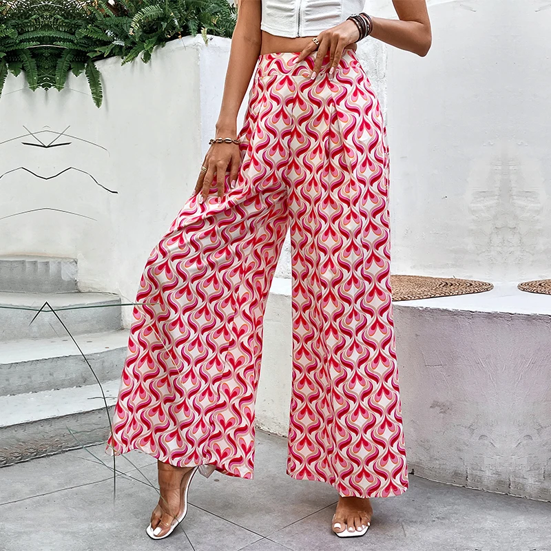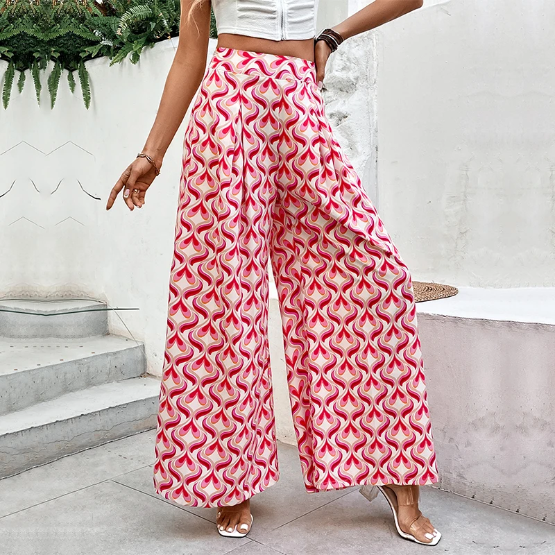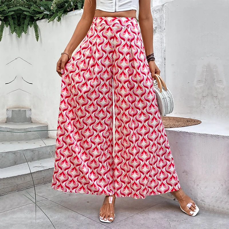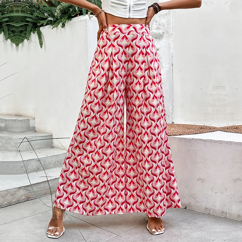 Women Casual Bohemian Wide Leg Trousers Pink Floral Print Elastic Waist Outdoor Wear Yoga Long Pants