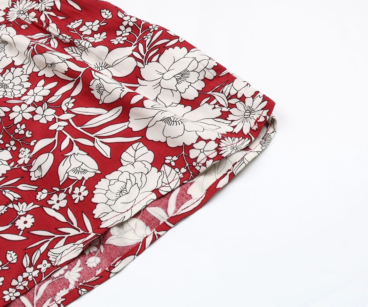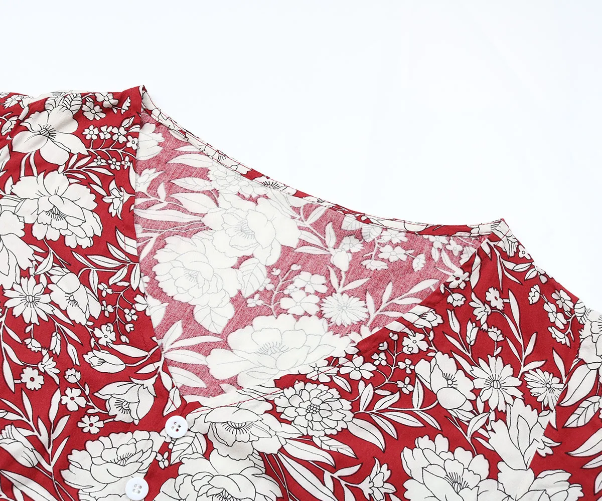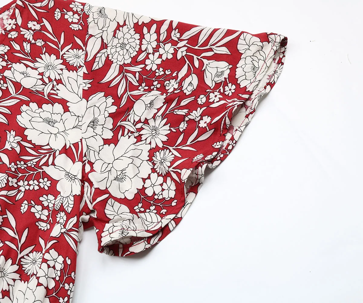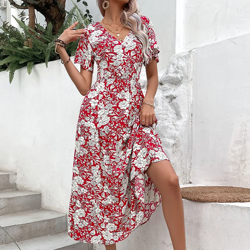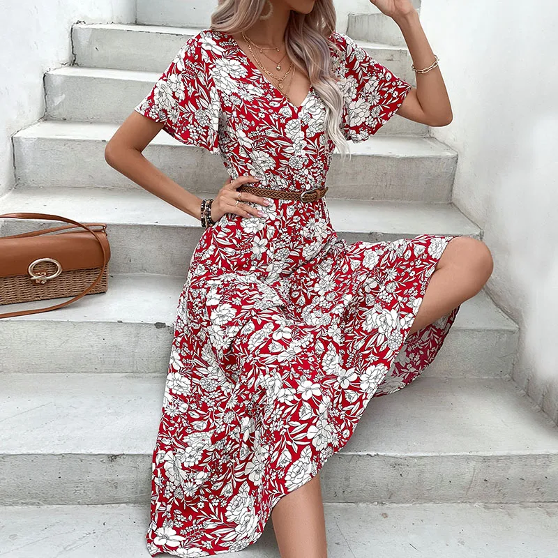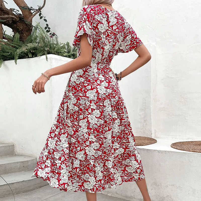 Women Casual Holiday Wear Floral Print Short Sleeve V Neck Midi Dress Summer Beach Dresses