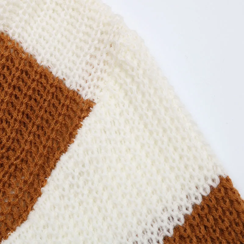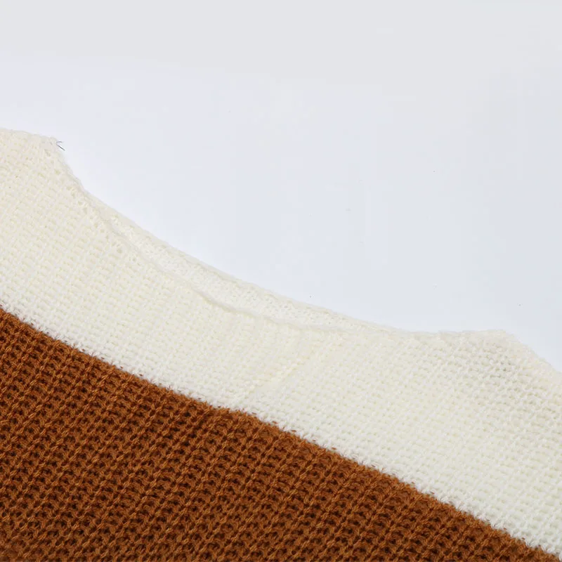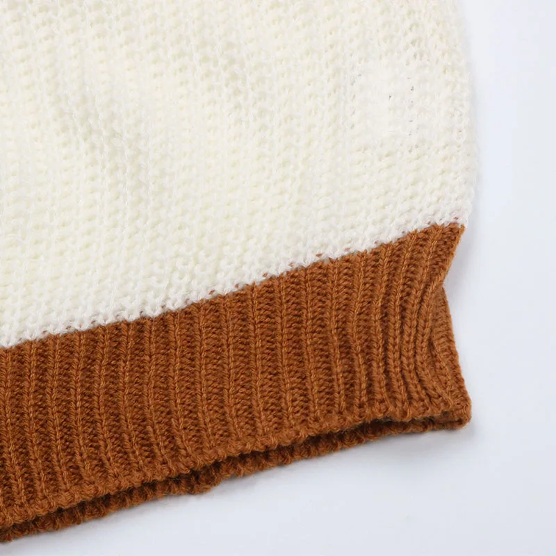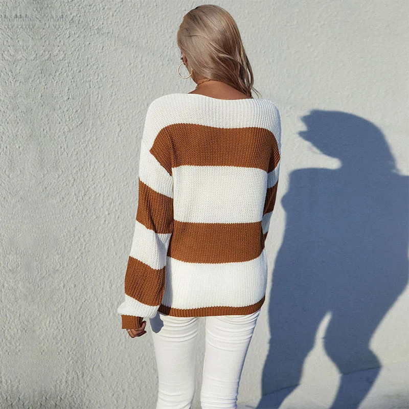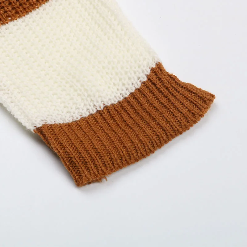 Women Casual Knit Sweater With Color Matching Long Sleeve Pullover Sweater