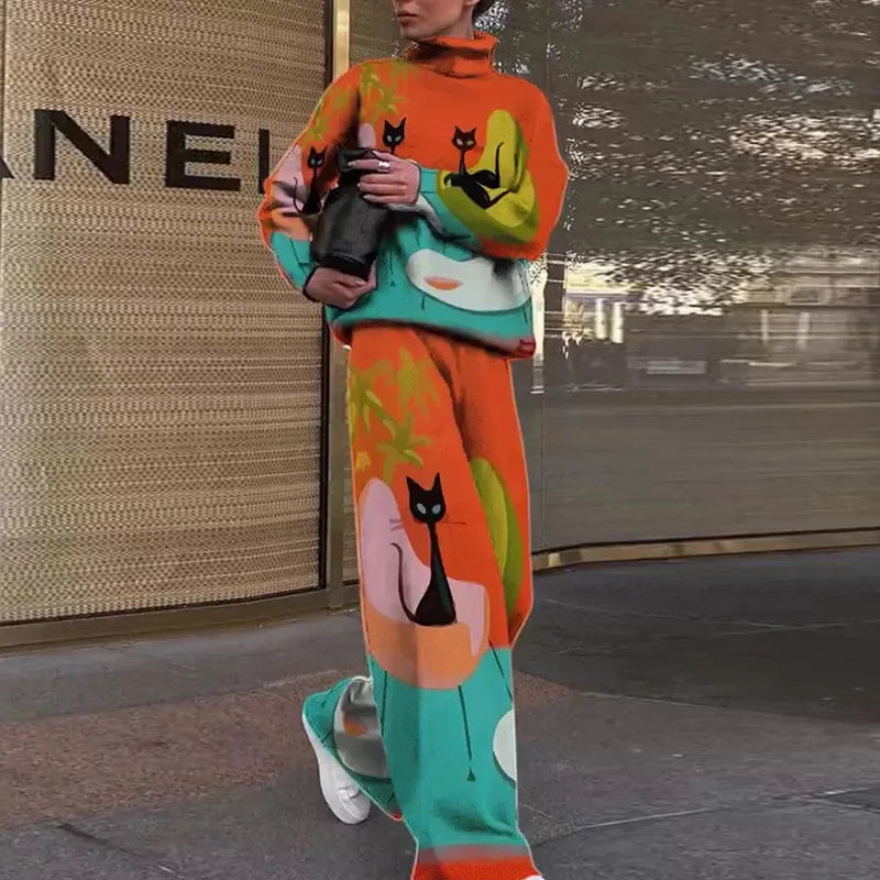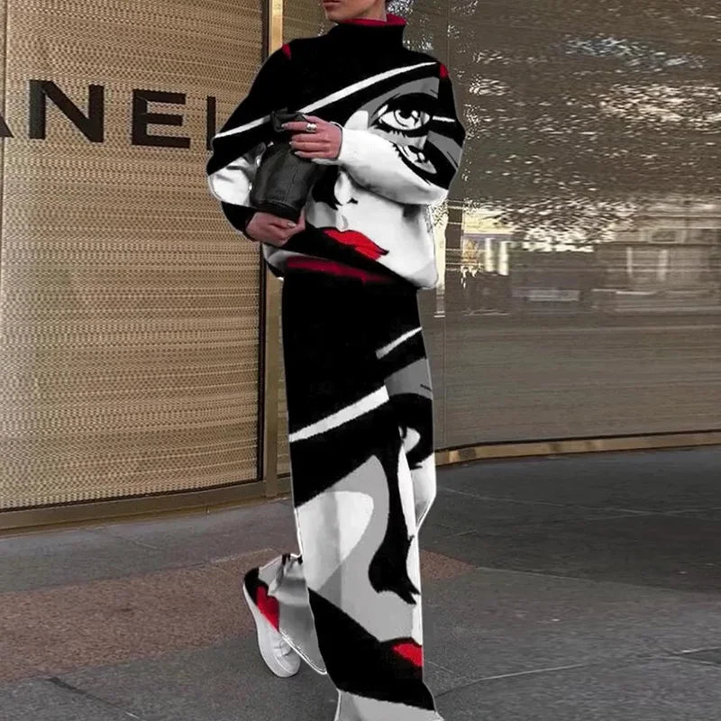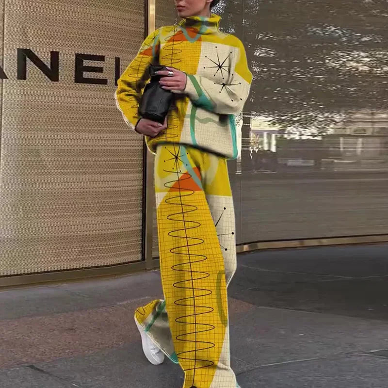Women Casual Loose Printing Elastic Waist Suits Turtleneck Wide Leg Pants Ladies Outfit Patchwork Sportswear Loungewear Set