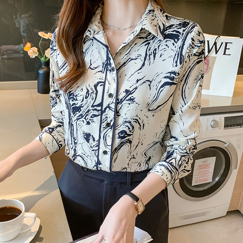 Women Casual OL Shirts Female Turn Down Collar Slim Print Blouse Ladies Chic Work Shirts