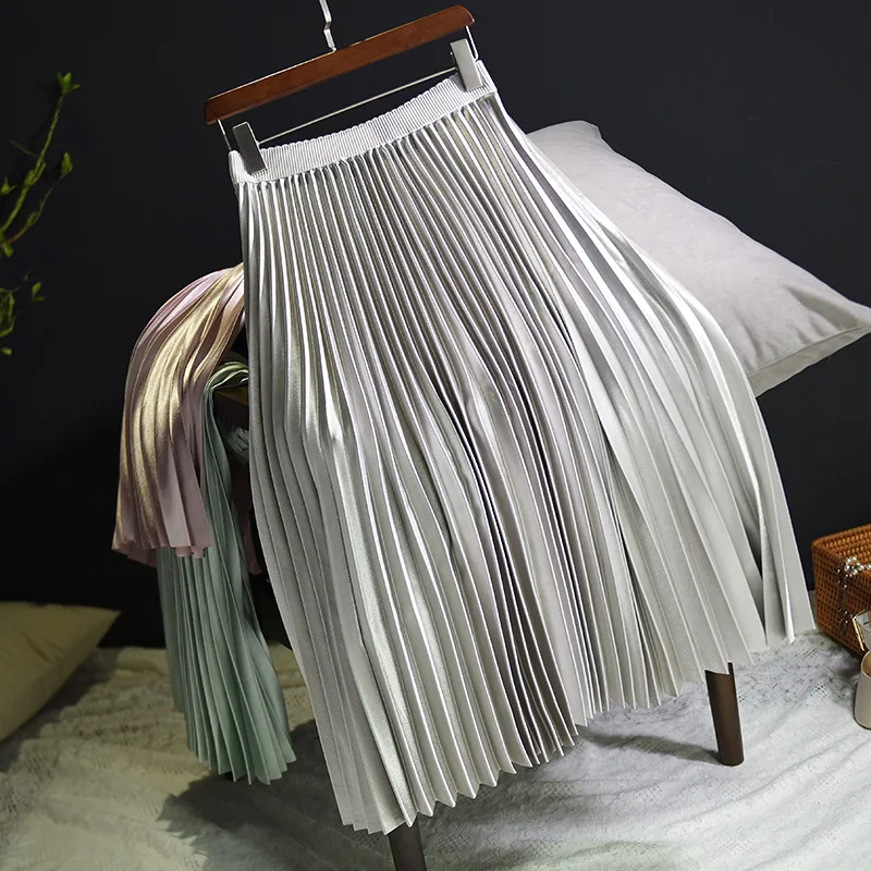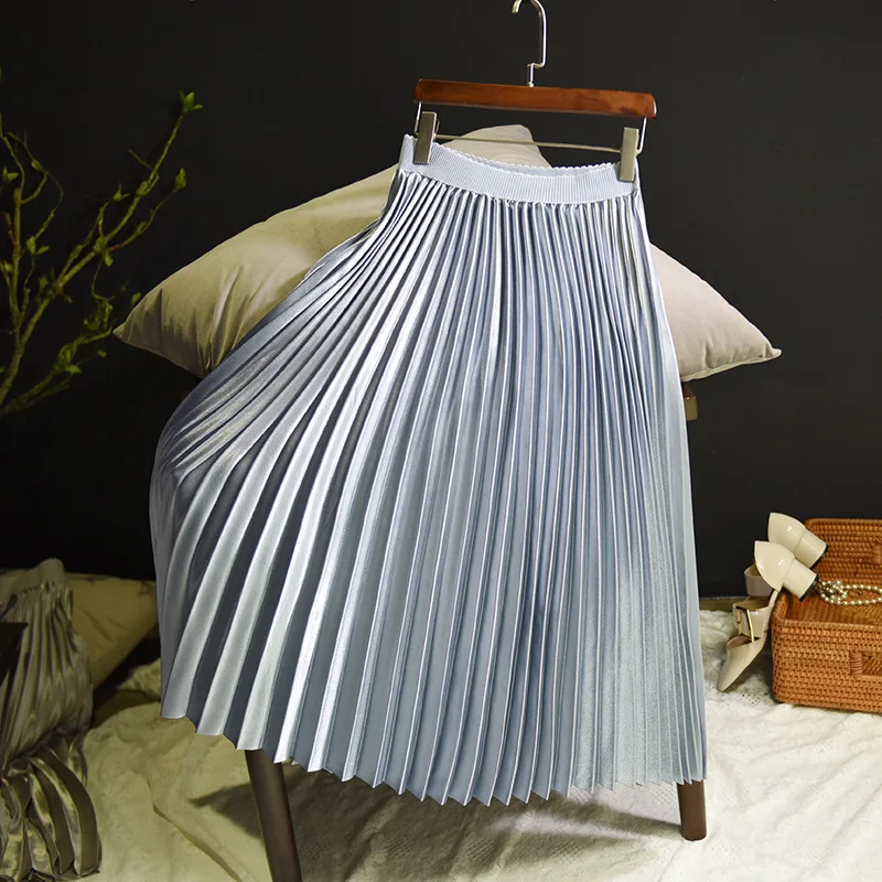 Women Casual Pleated Long Skirts Street Wear Elastic Waist Soild Colour Fashion Skirt
