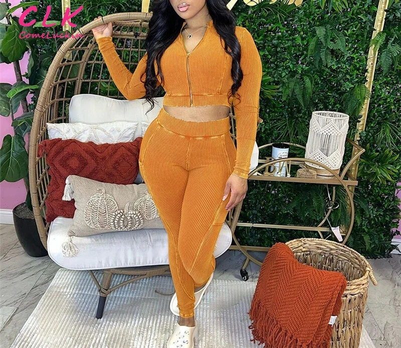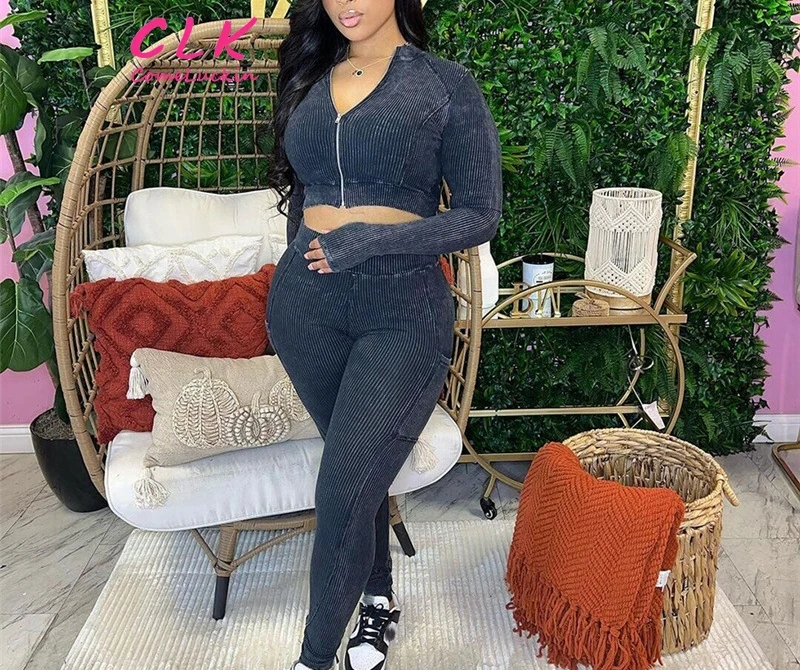 Women Casual Pure Cotton Two Piece Set Solid Mock Neck Zipper Crop Jacket+pocket Pencil Pants Outfits