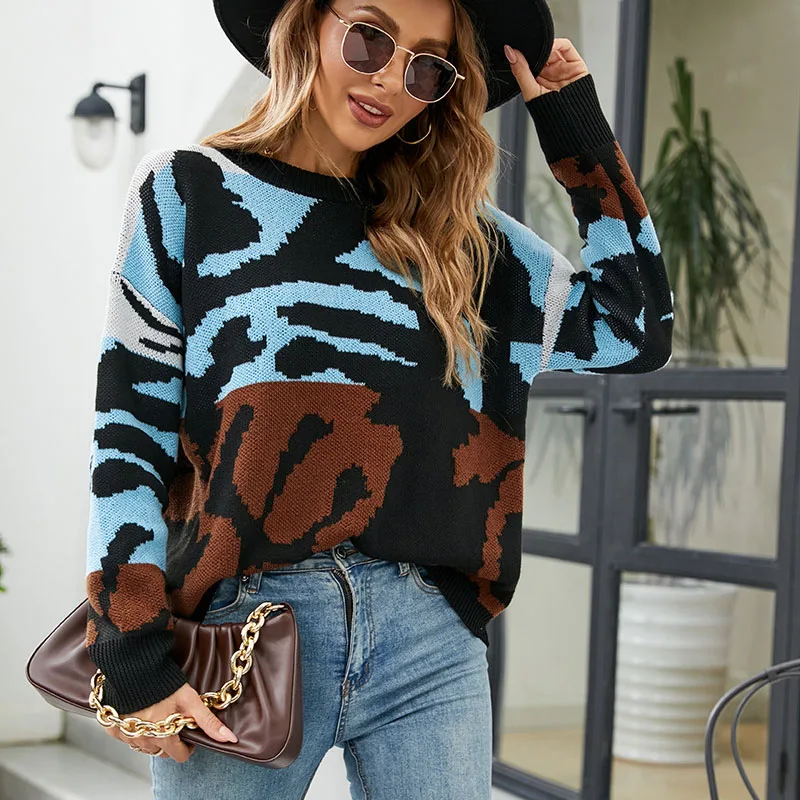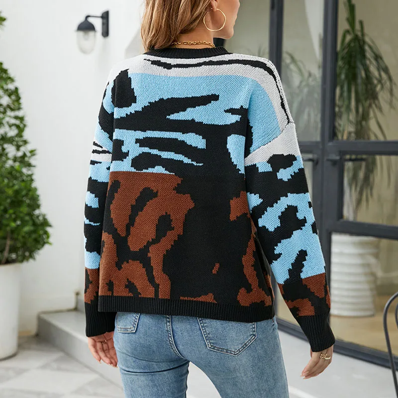 Women Casual Round Collar Tiger Stripe Pullover Sweater Tops Ladies Simple Drop-Shoulder Sleeve Daily Knit Jumper