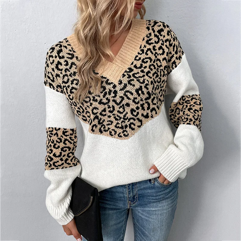 Women Casual V Neck Drop Shoulder Leopard Patchwork Pullover Knit Blouse Womens Simple Contrast Color Outerwear Sweater Ladies