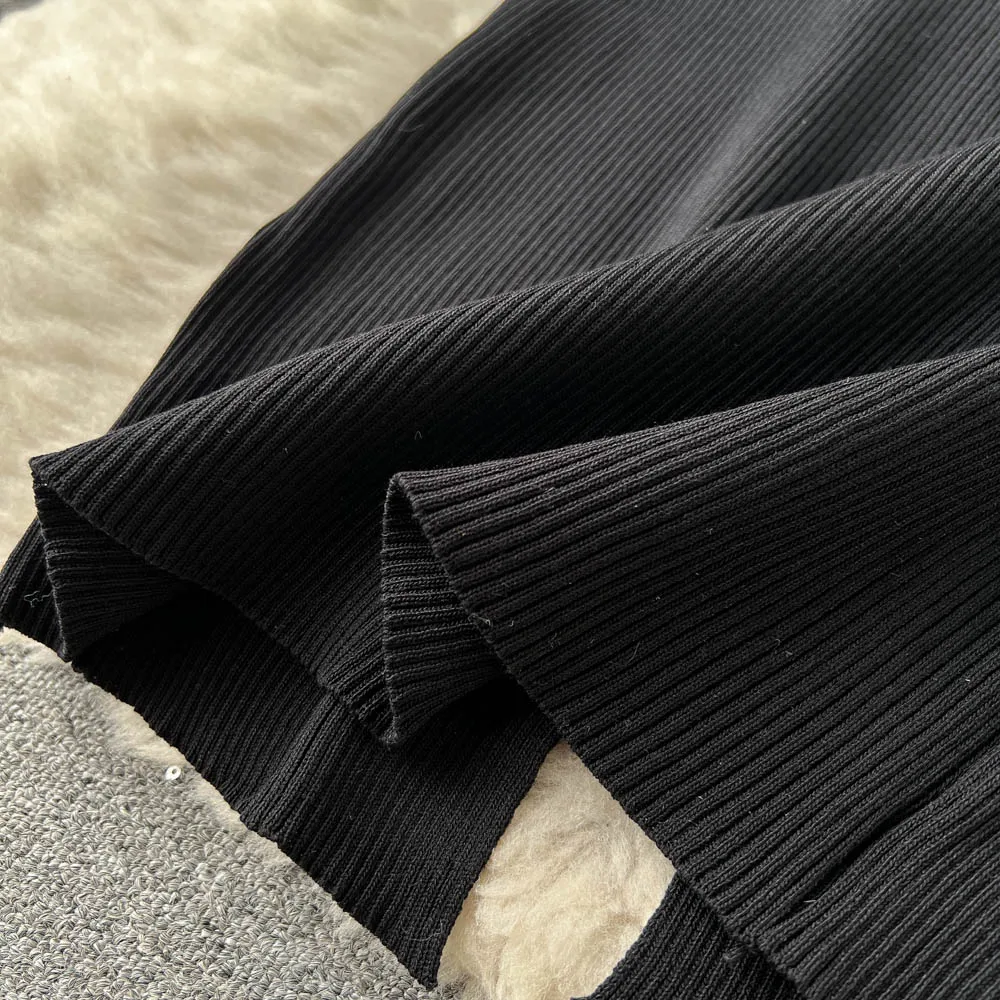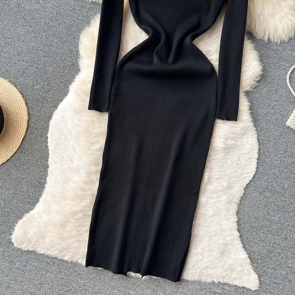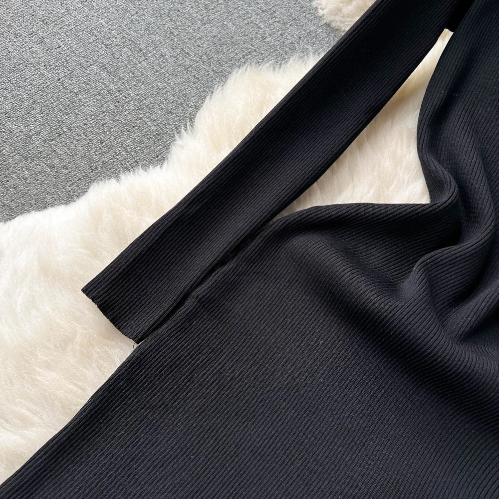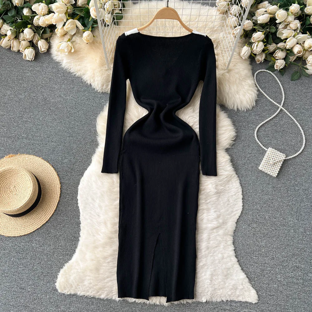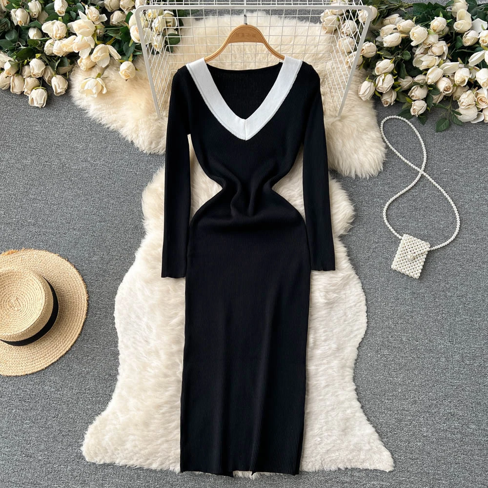 Women Casual V Neck Patchwork Bodycon Knit Dress Ladies Elegant Plain Tight Sweater Dresses