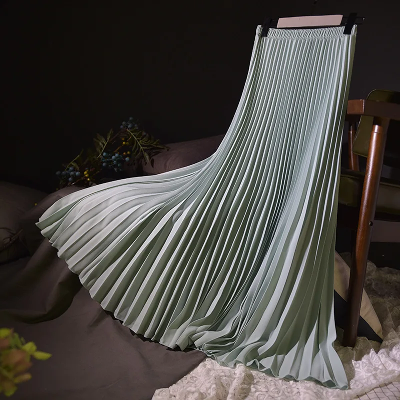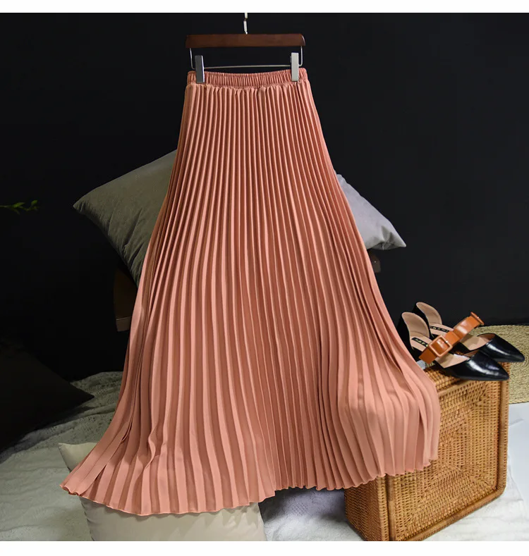 Women Chic Party Wear Long Skirt Elastic Waist Soild Pleated Elegant Skirts