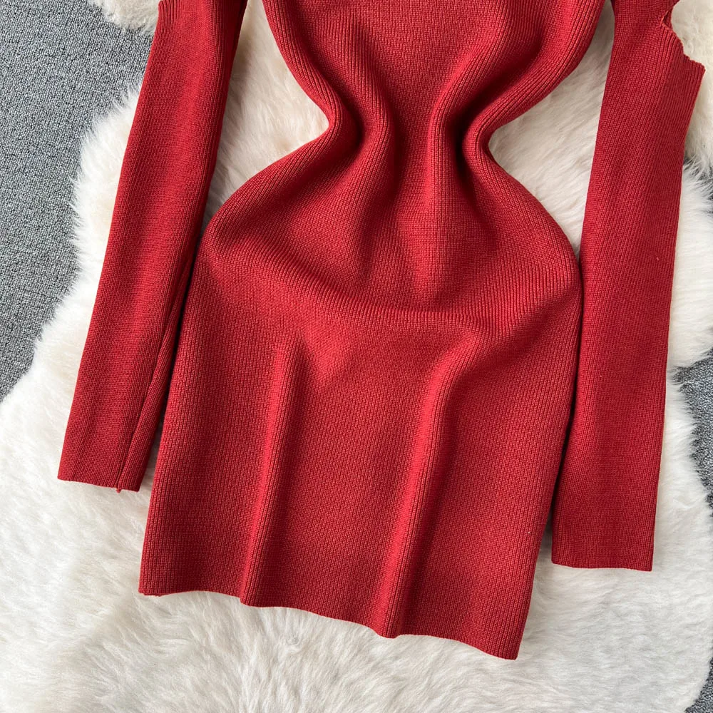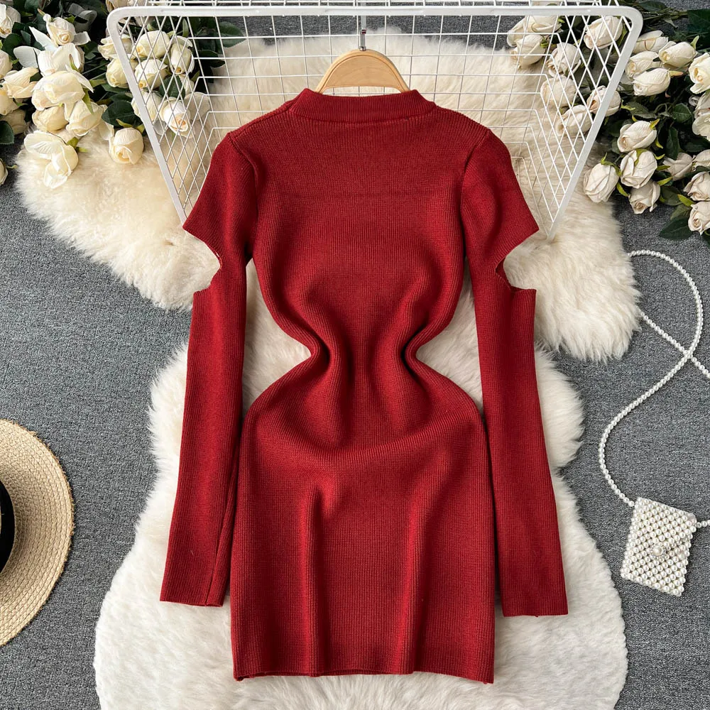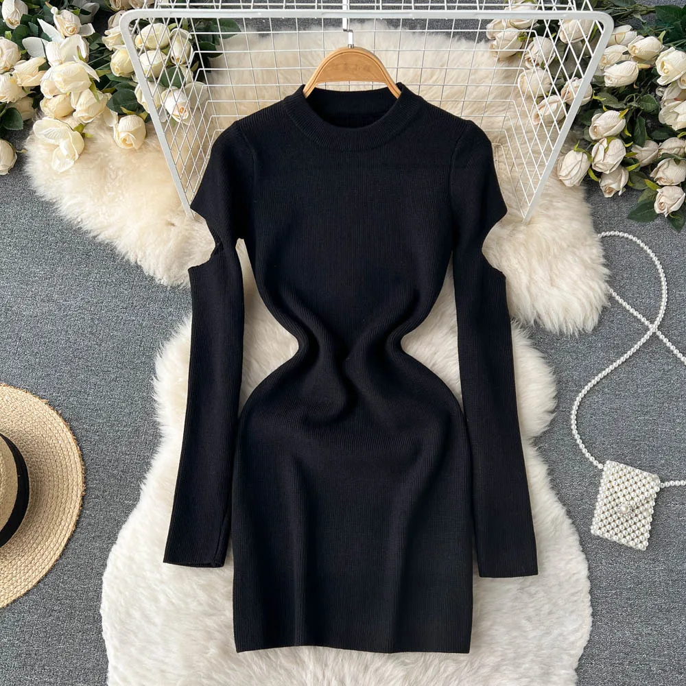 Women Chic Peter Collar Hollow Out Long Sleeve Knit Bodycon Dress Ladies Casual Plain Sweater Mini Dresses