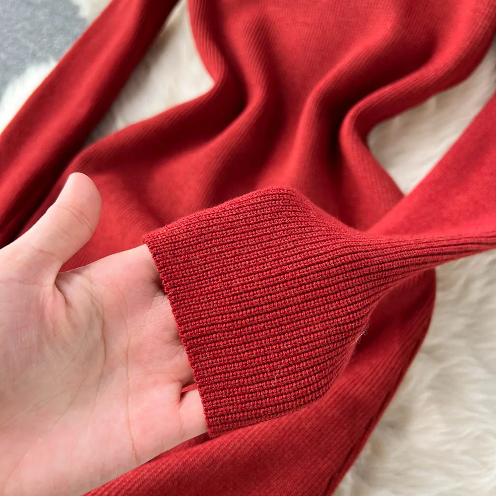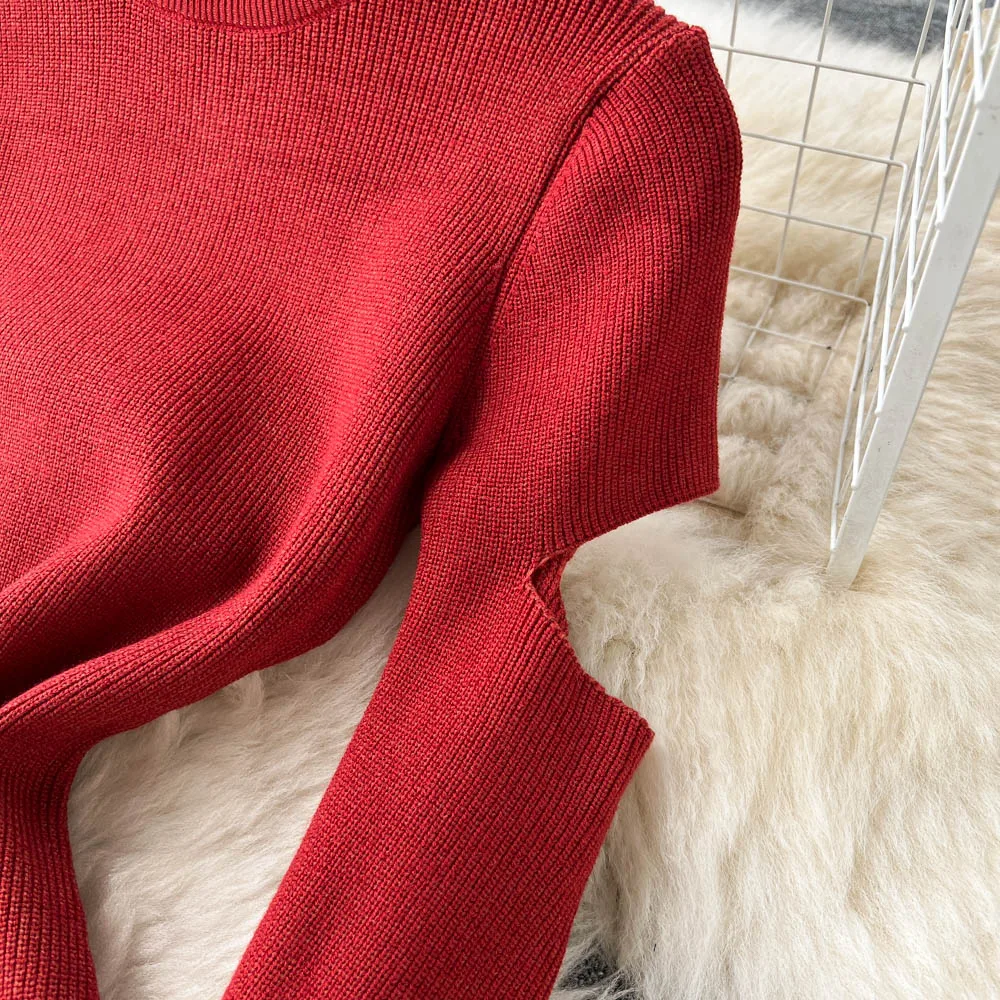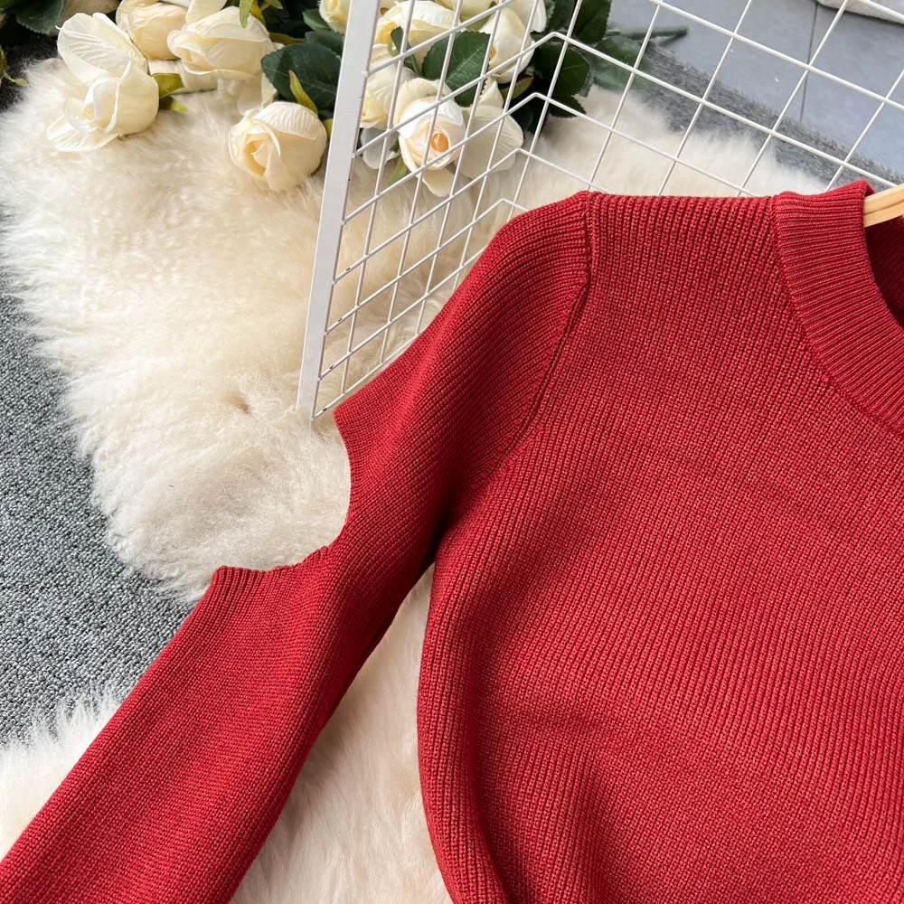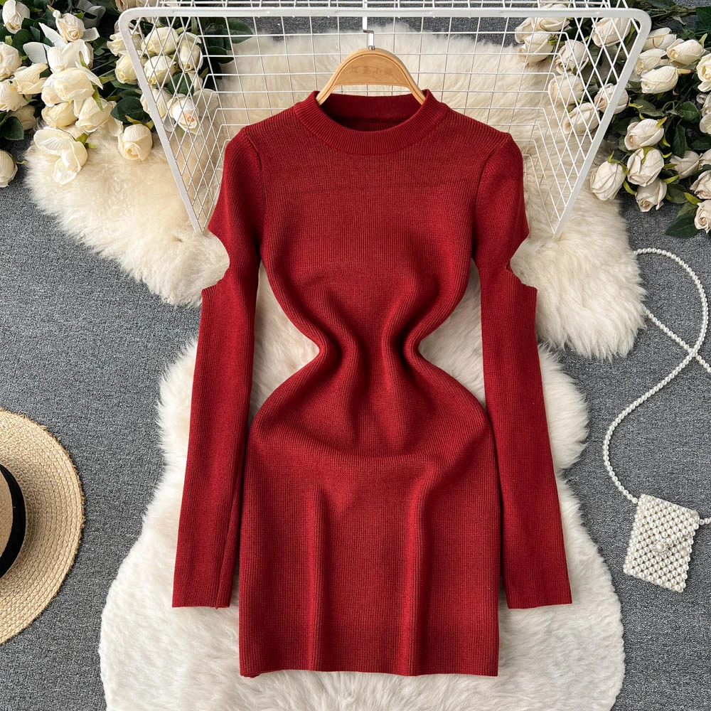 Women Chic Peter Collar Hollow Out Long Sleeve Knit Bodycon Dress Ladies Casual Plain Sweater Mini Dresses