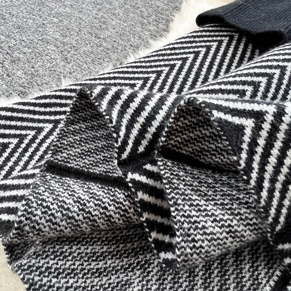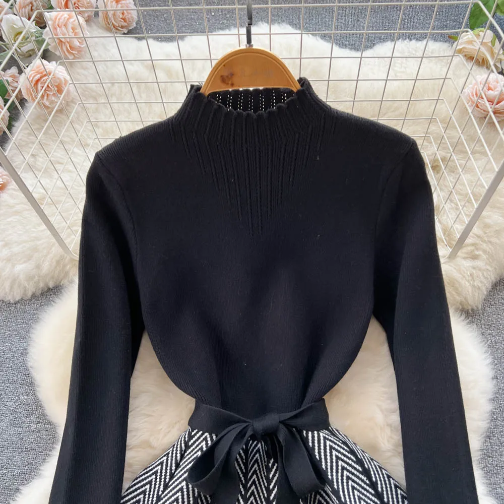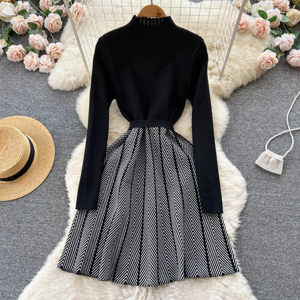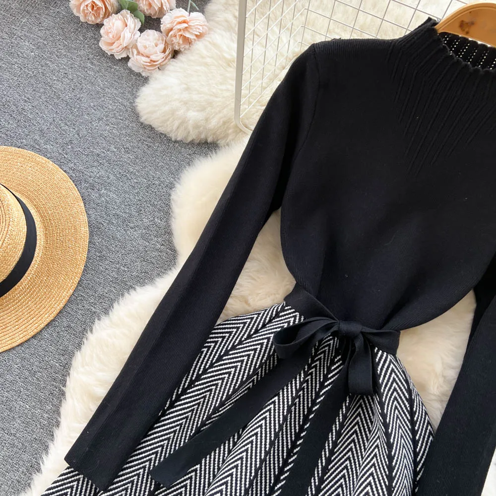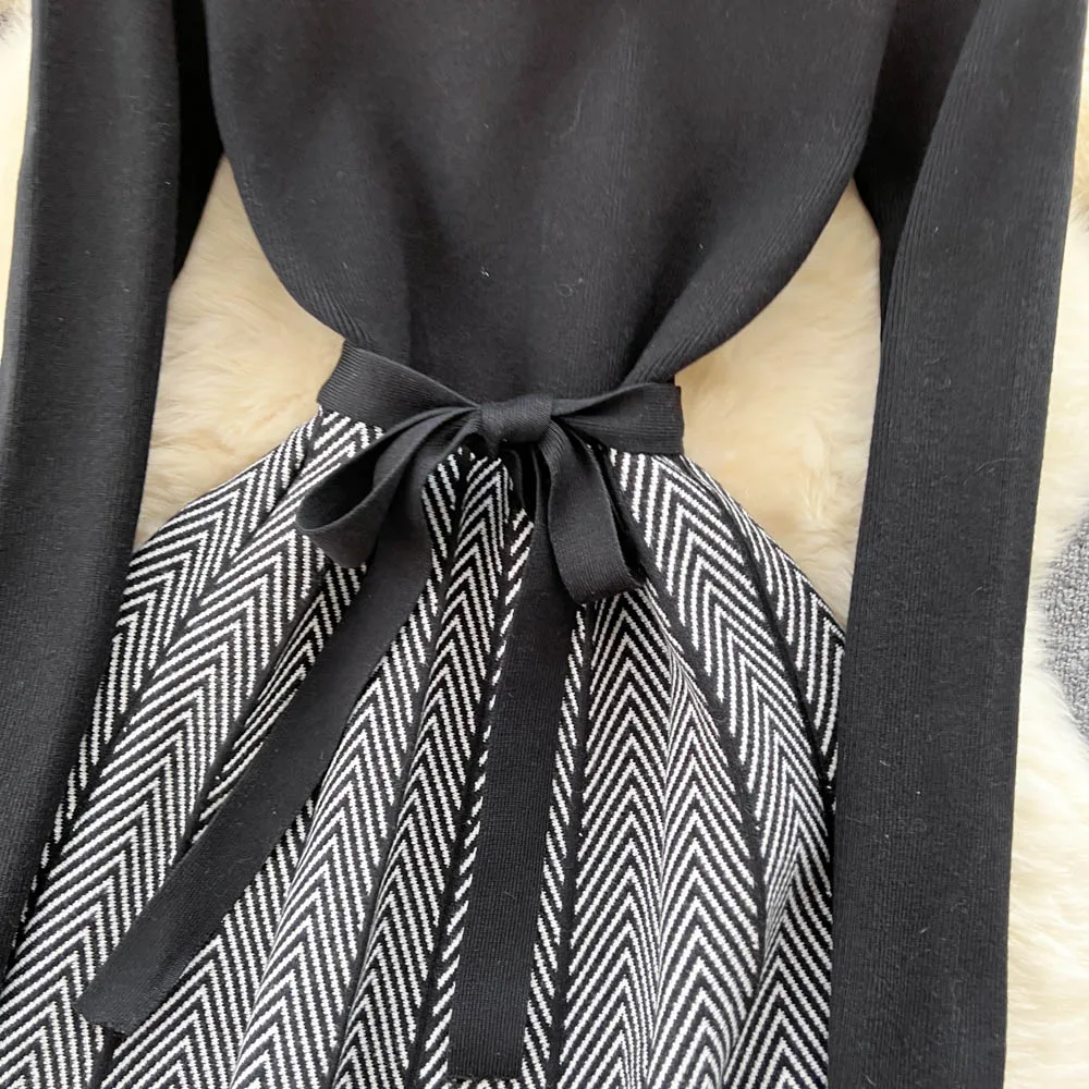 Women Chic Peter Pan Collar Patchwork Bandage Knitting A-Line Dresses Ladies Elegant Office Sweater Dresses