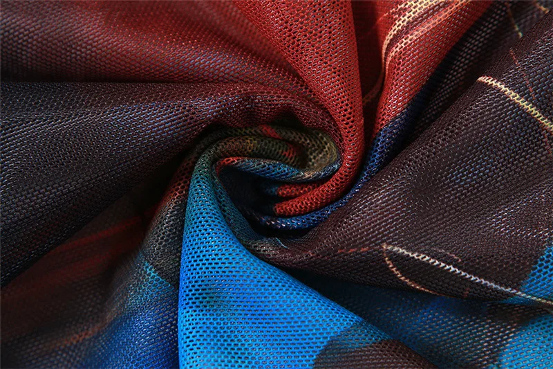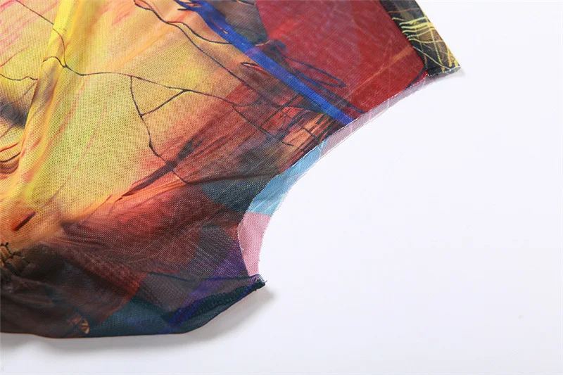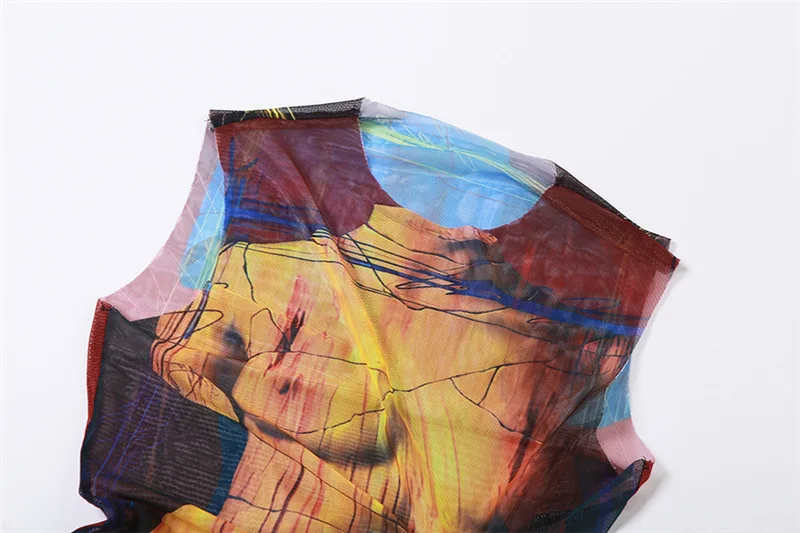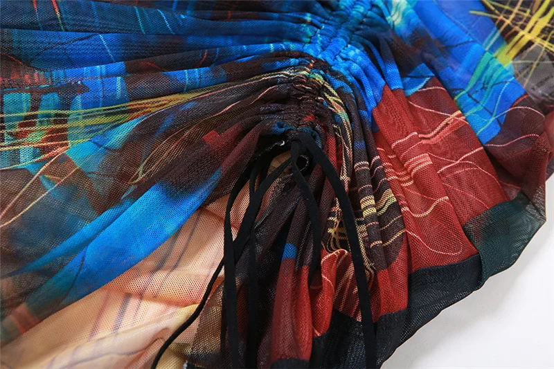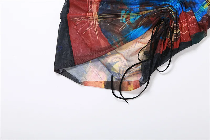 Women Digital Print Lace Up Mesh See Through Bodycon Streetwear Beach Vacation Drawstring Irregular Midi Dress Party Dresses