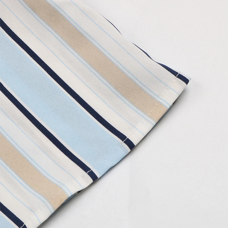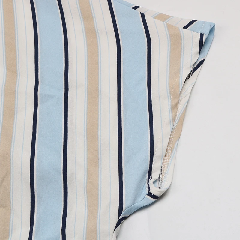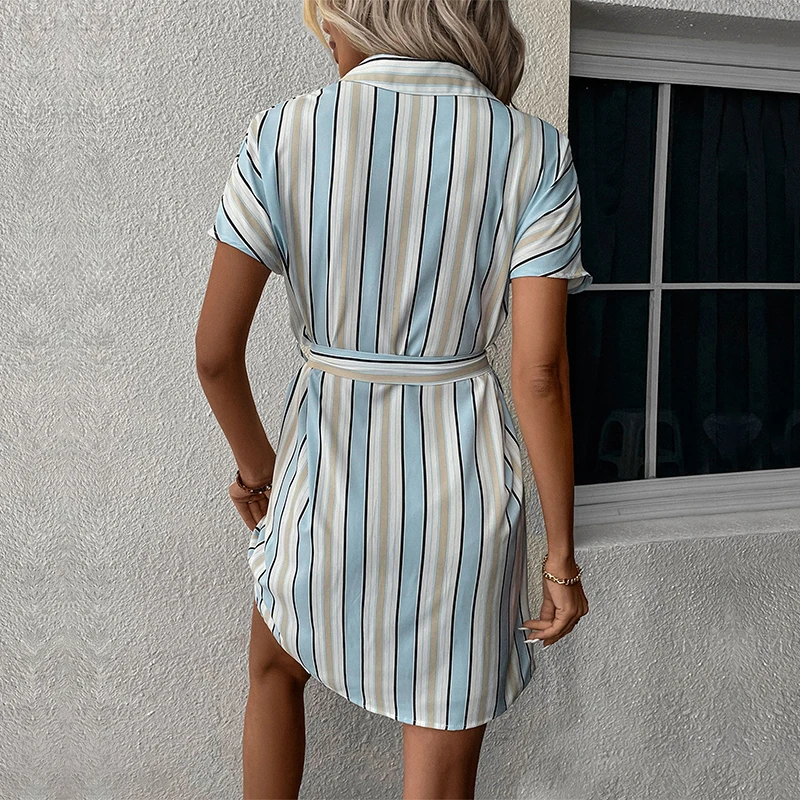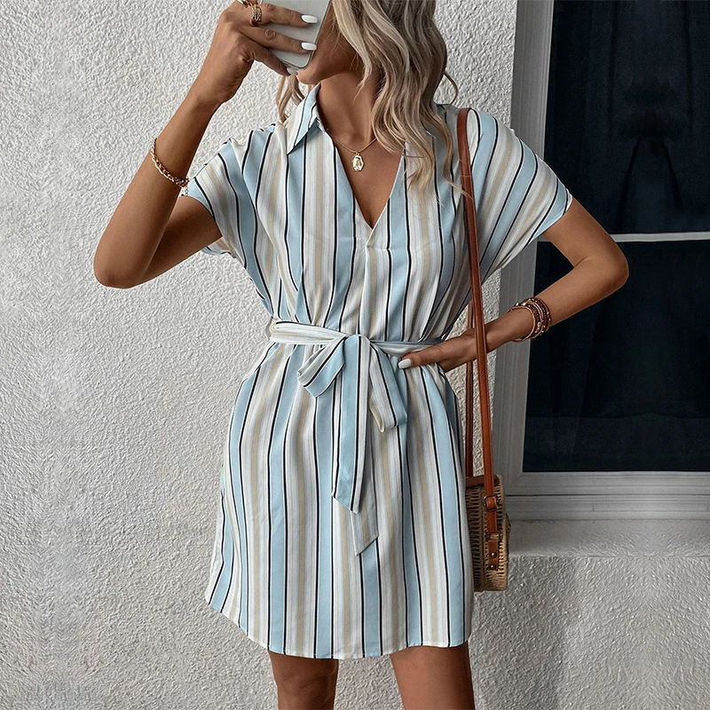 Women Elegant Polo Collar Short Sleeve Stripe Printed Mini Dress Casual Office Wear Dresses