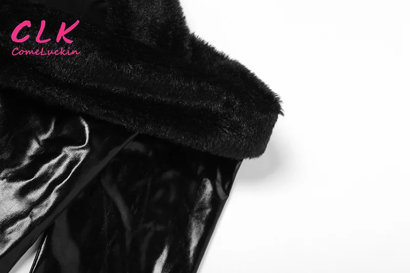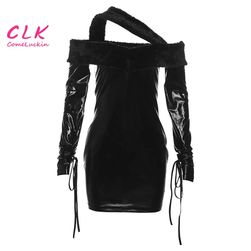 Women Faux Leather Long Sleeve Off Shoulder Faux Fur Collar Bodycon Midi Dress 2023 Autumn Vestido Sexy Party Dresses