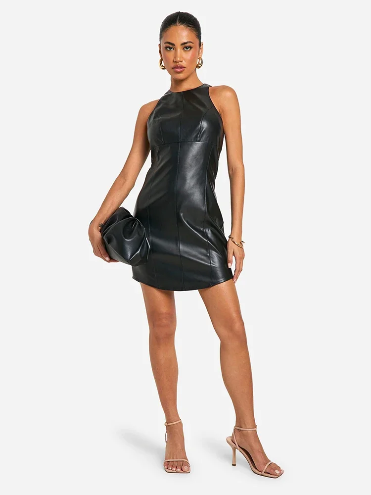 Women Faux Leather Tank Dress Stretch PU Bodycon Dress Party Ladies Sleeveless Round Neck Mini Dress Clubwear Custom New