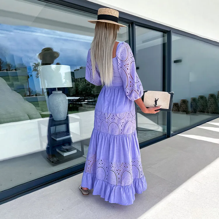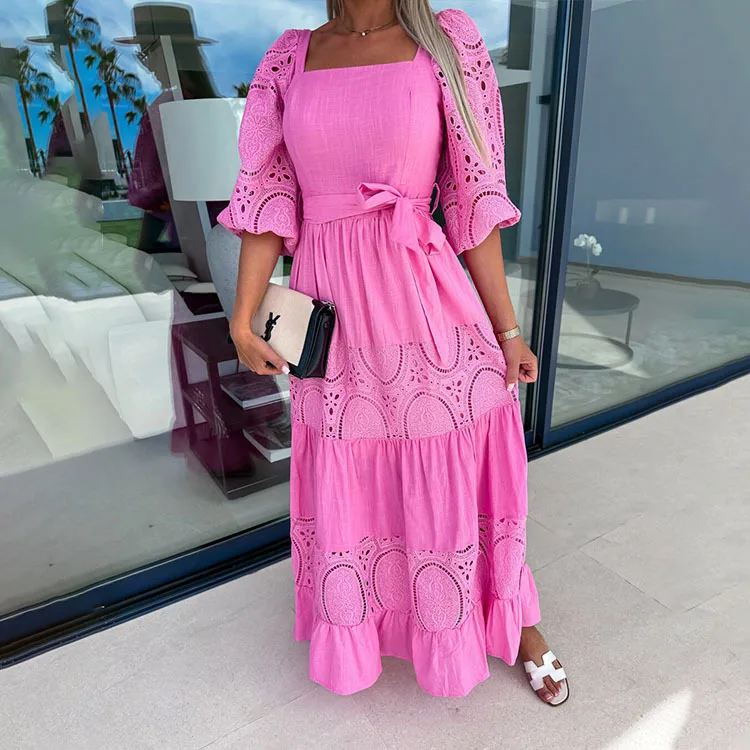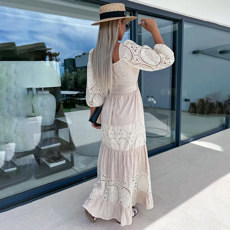 Women Half Puff Sleeve Square Neck Lace Hollow Out Bohemian Maxi Dress Vintage Patchwork Lady Dresses