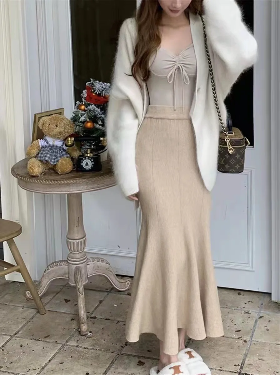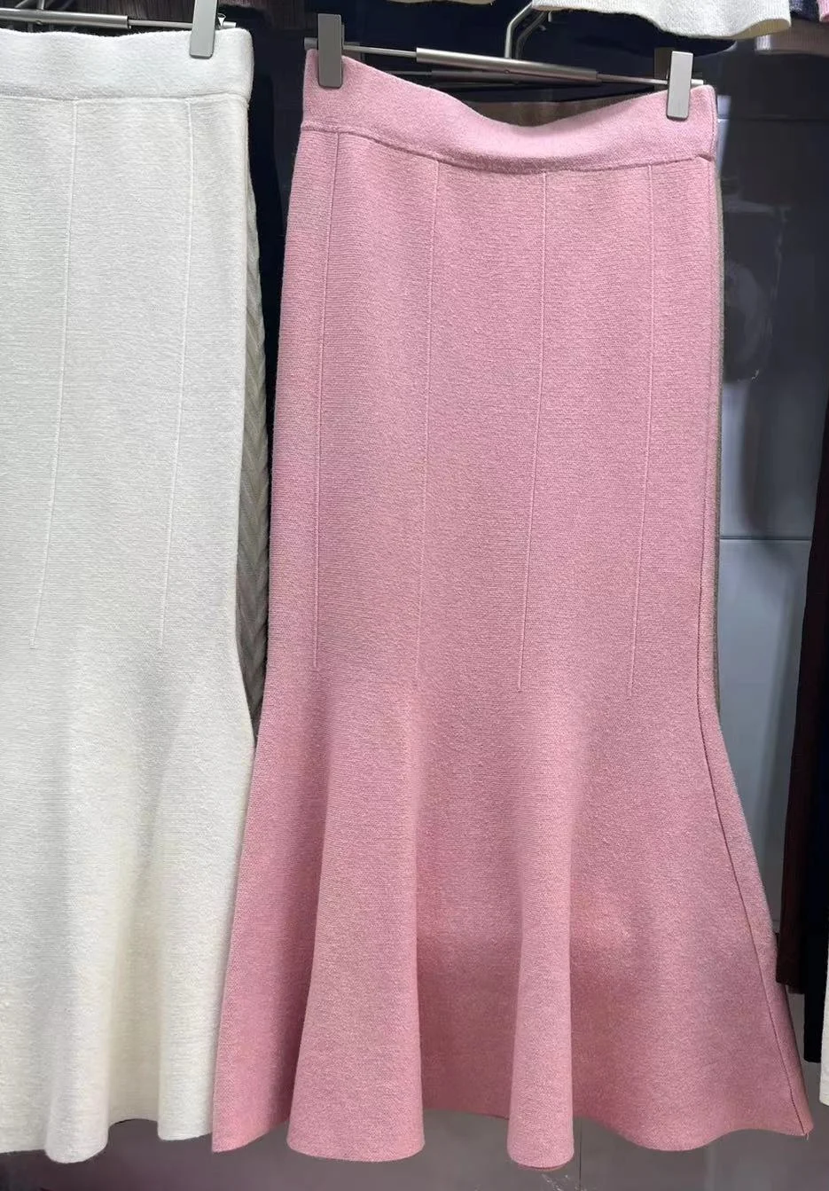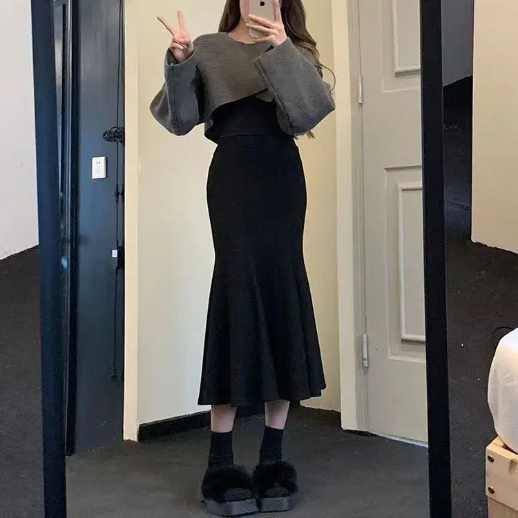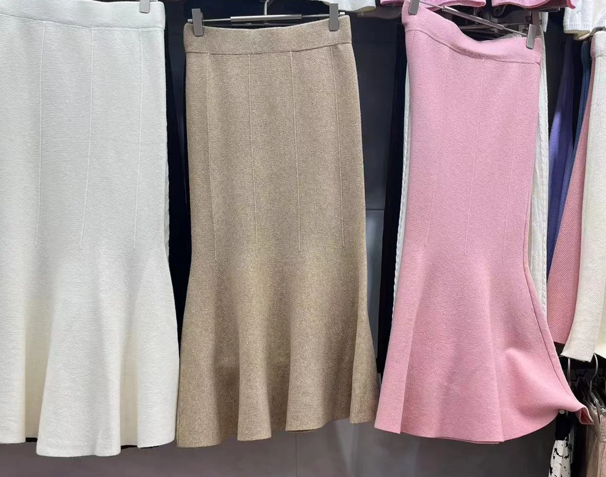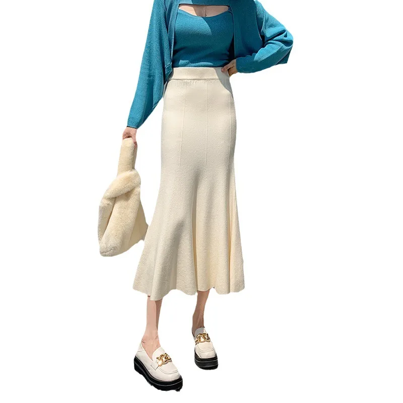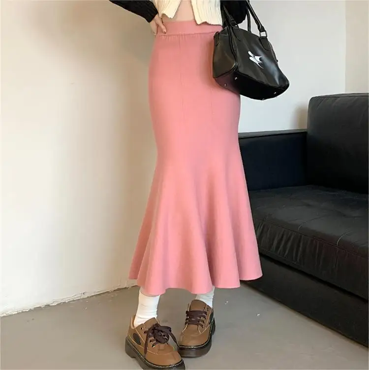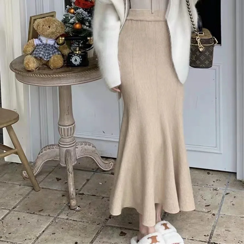 Women Lady Elegant Knit Fishtail Long Skirt Dress Autumn Winter Korean Style Knitwear Solid Color Pencil Pleated Casual Skirt