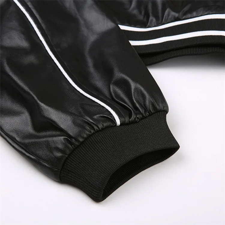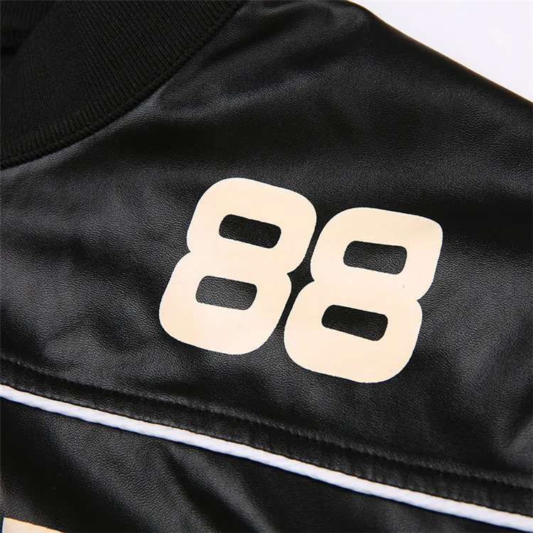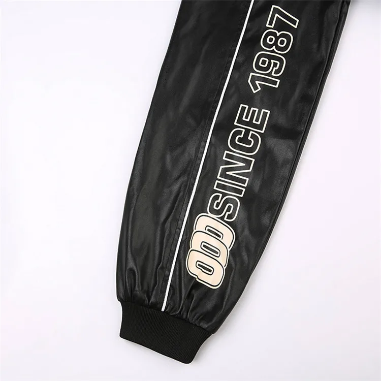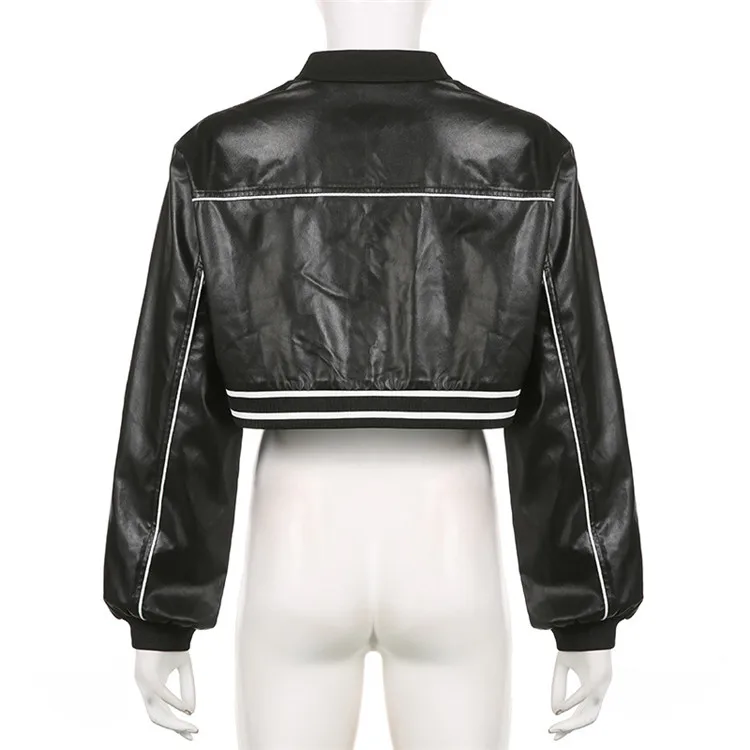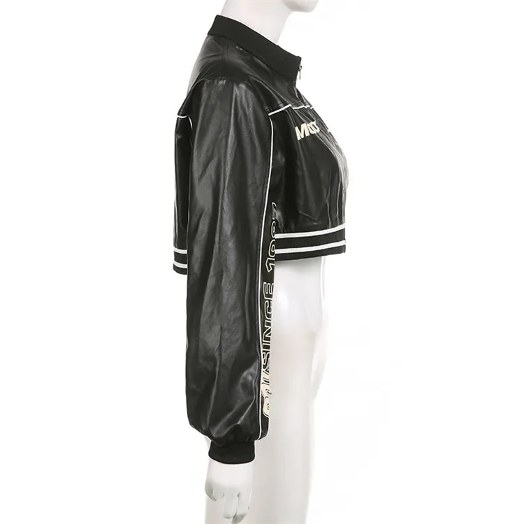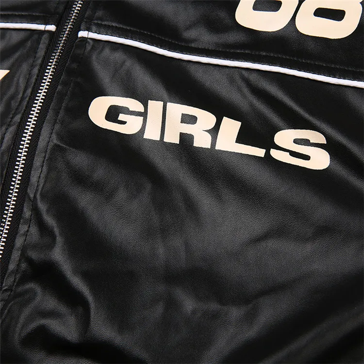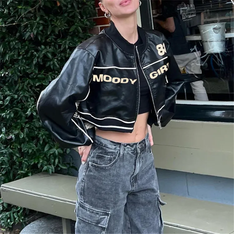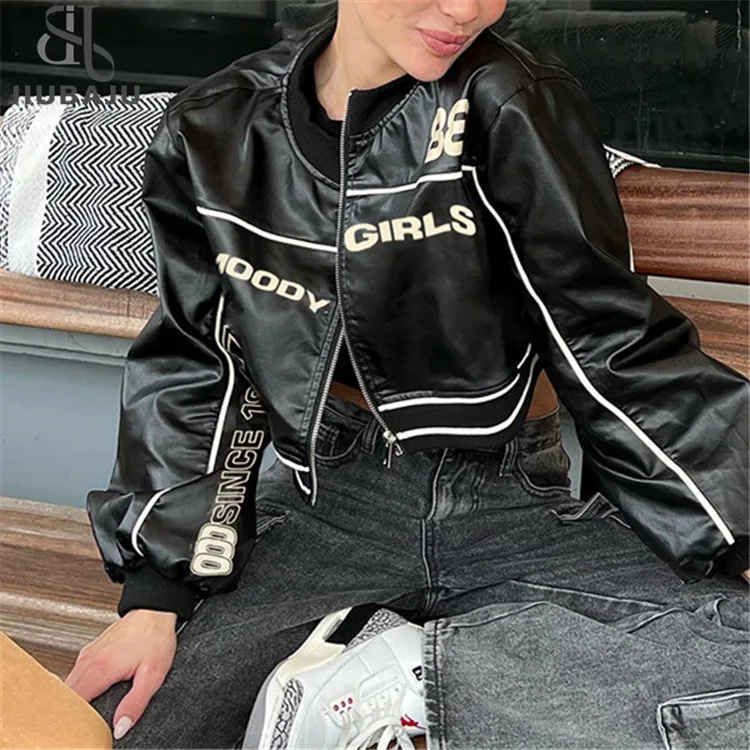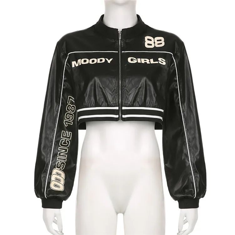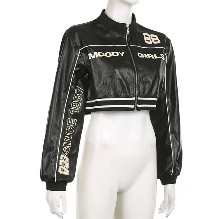 Women Leather Jacket Letter Fashion Zip Up Racing PU Crop Top High Street Gothic Slim Coat