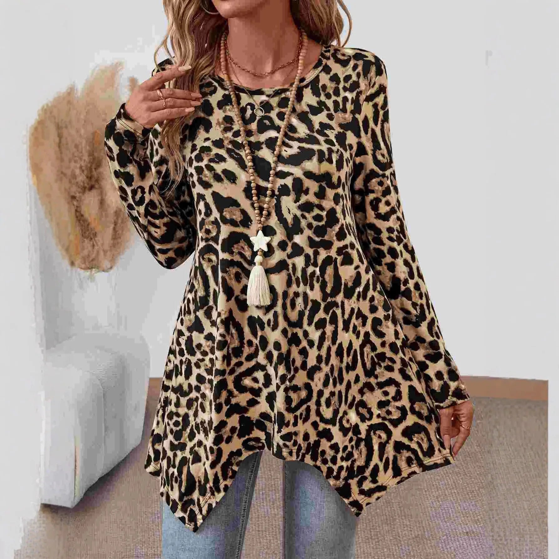 Women Leopard Print Tunic Top Long Sleeve Loose Fit Swing Blouse Irregular Hem Casual Flowy A-Line Shirt Streetwear