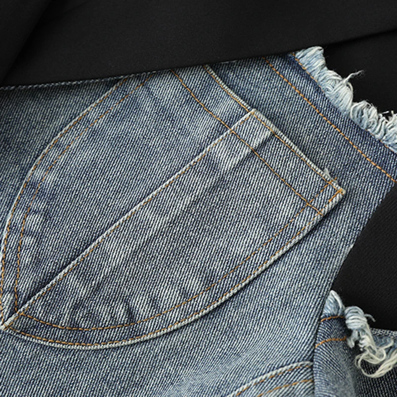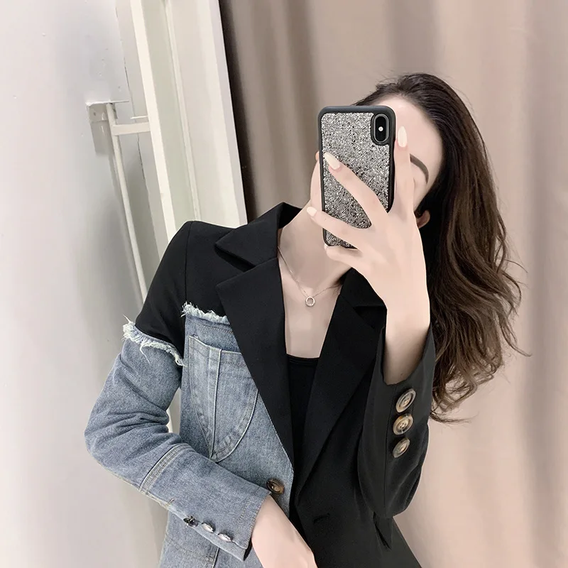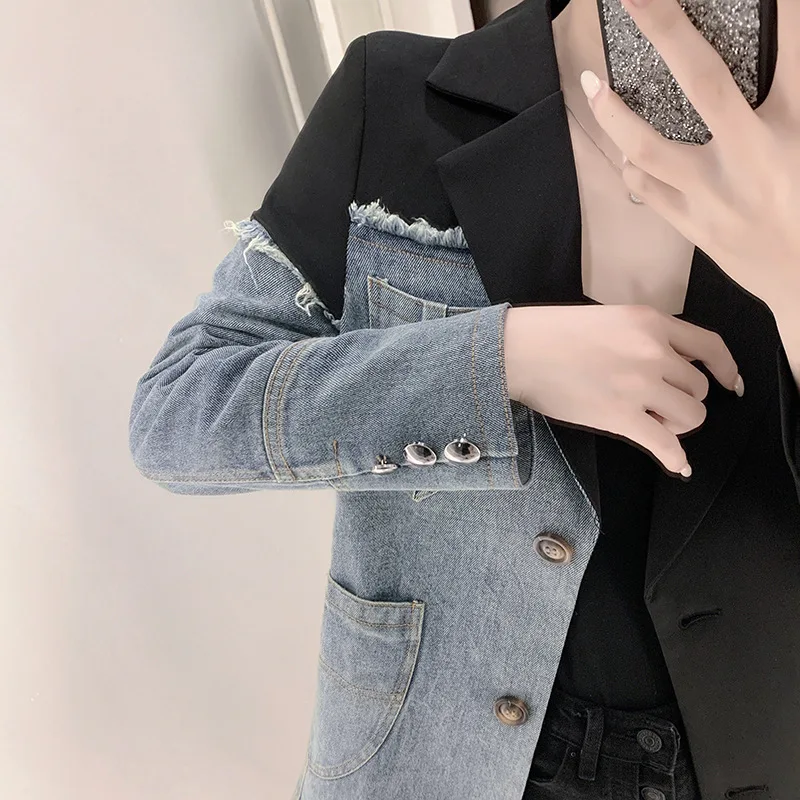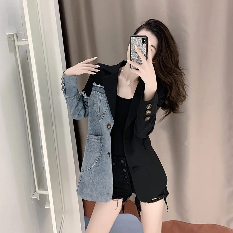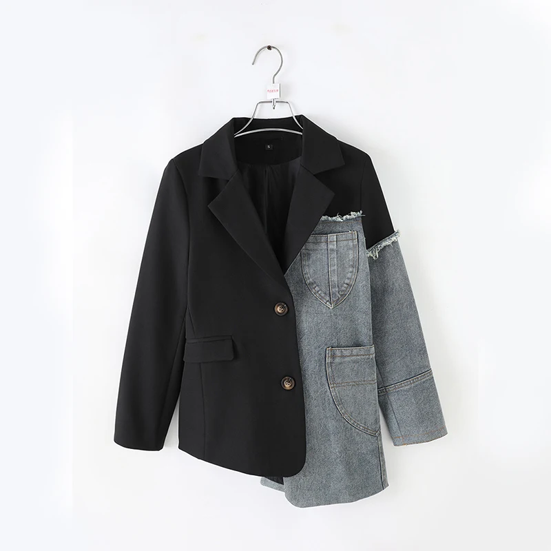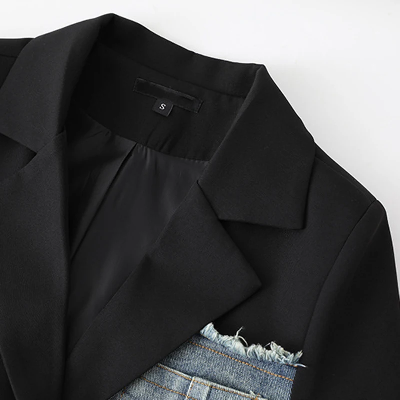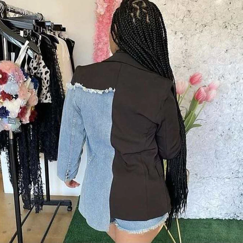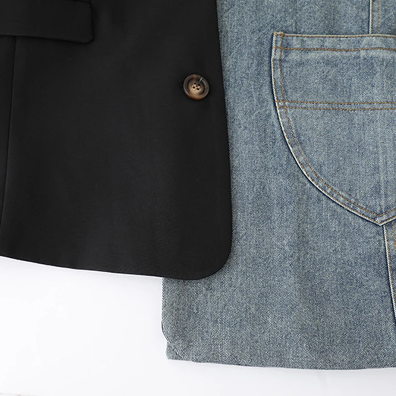 Women Long Sleeve Loose Blazer Jackets Fashion Single Button Patchwork Black And Denim Blazer