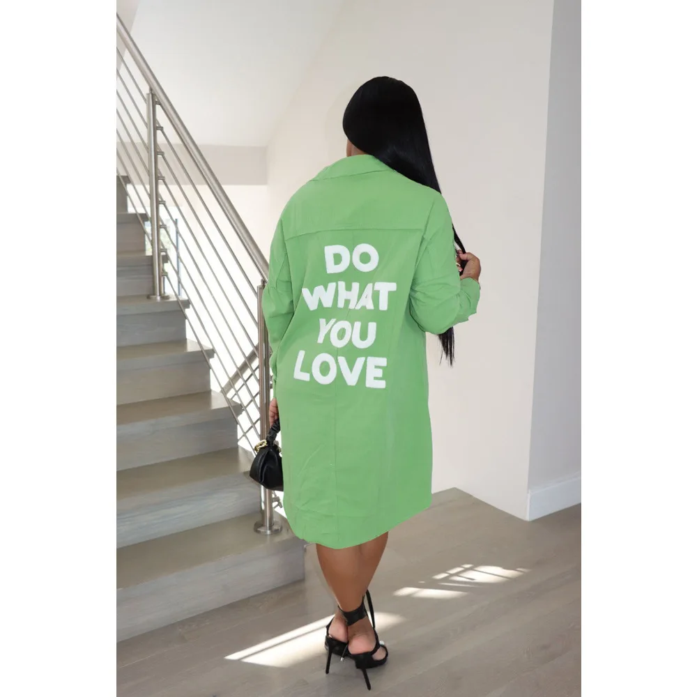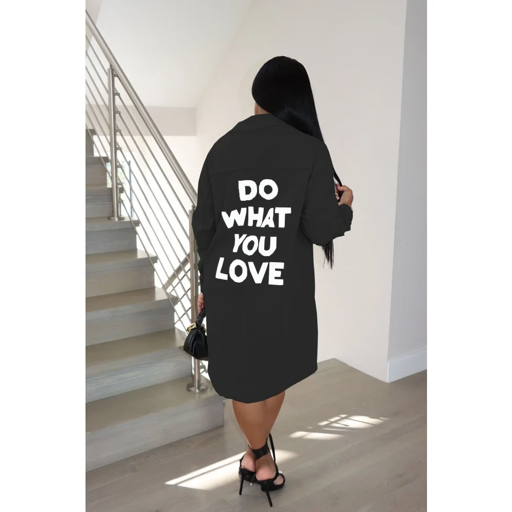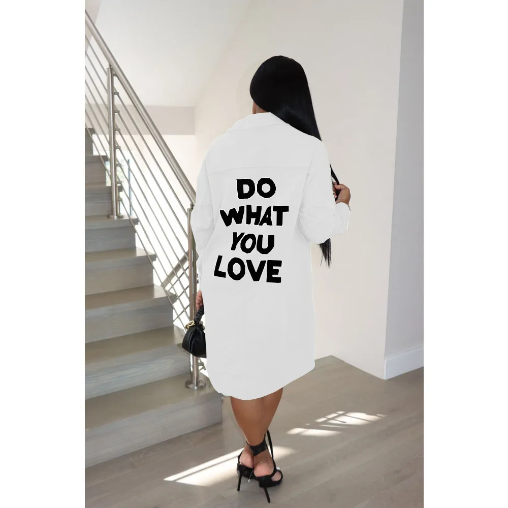 Women Long Sleeves Shirt Dress Loose Thin Letter Printing Single-breasted Mid-length Lapel Shirt Spring Autumn