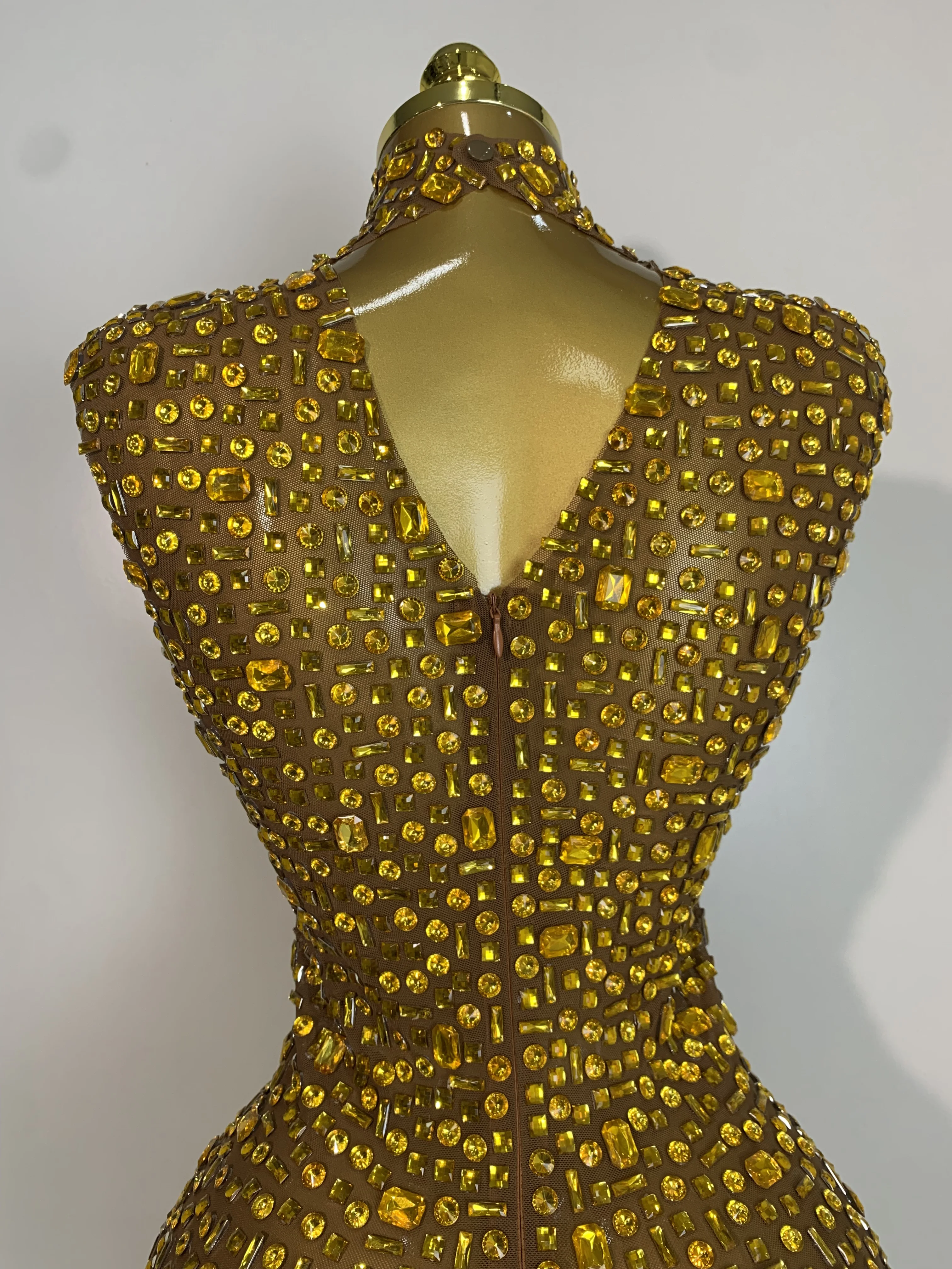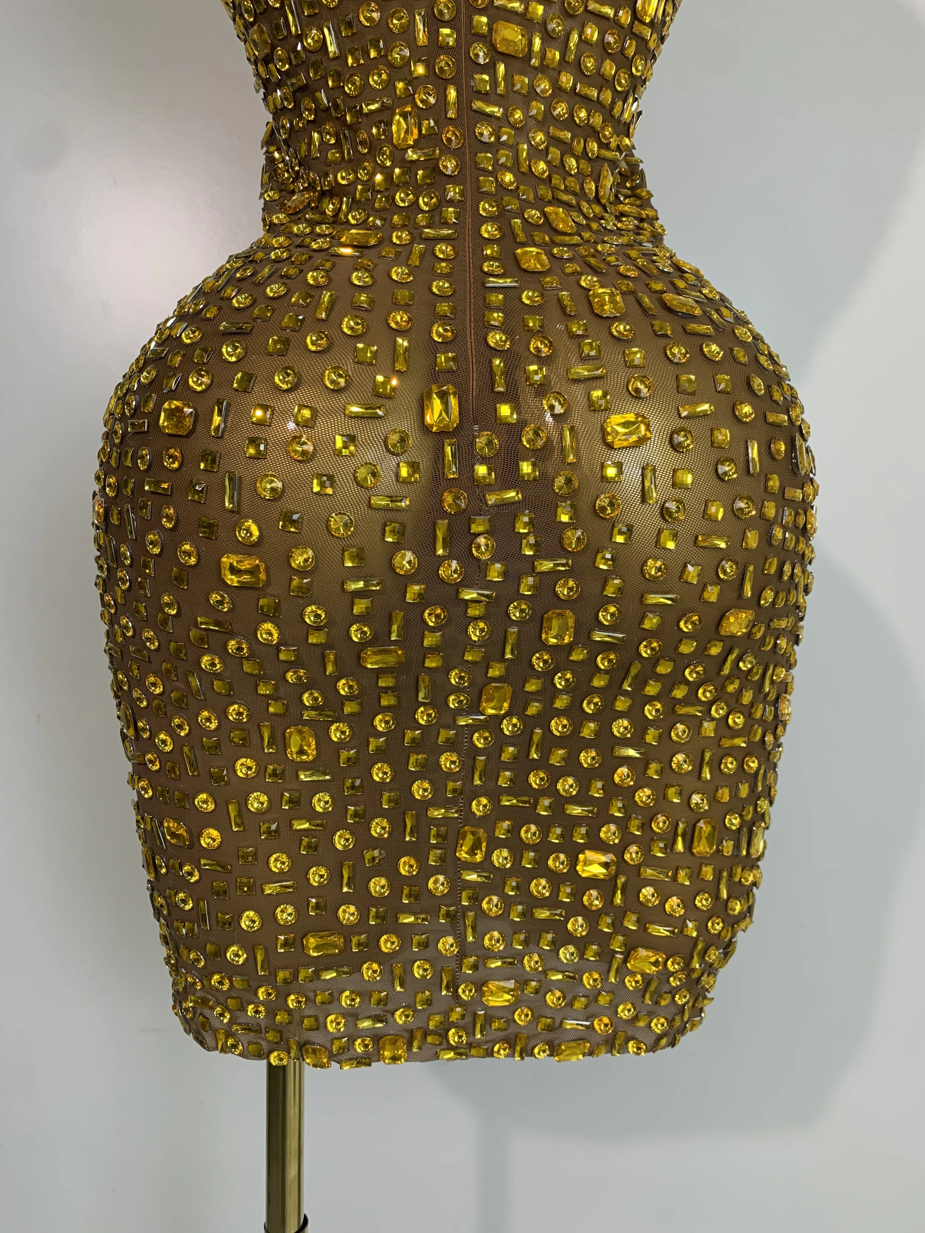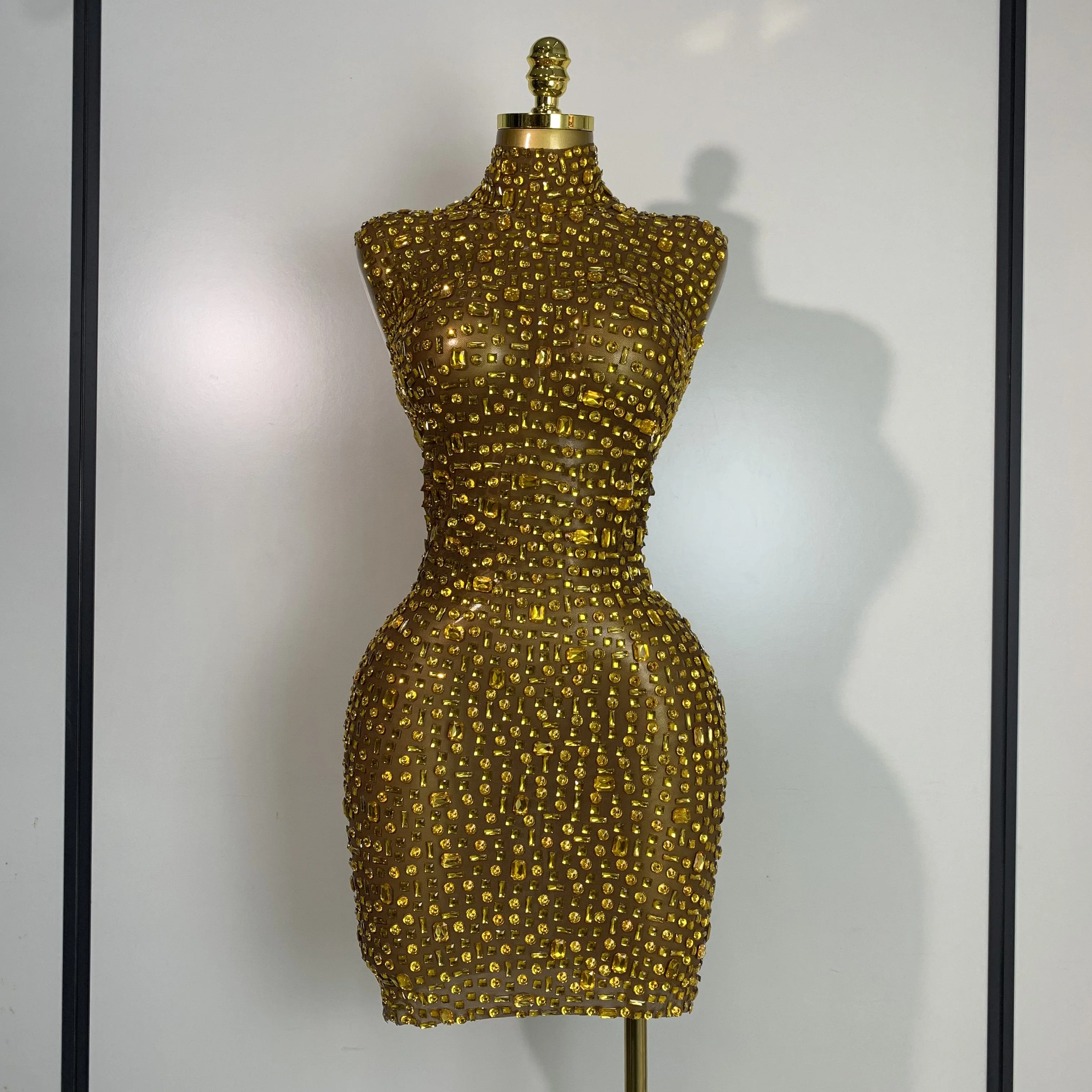 Women Luxury Gold Rhinestone Sexy Mesh Short Dress Sparkly Stage Costume Elegant Party Birthday Dresses Nightclub Singer Outf