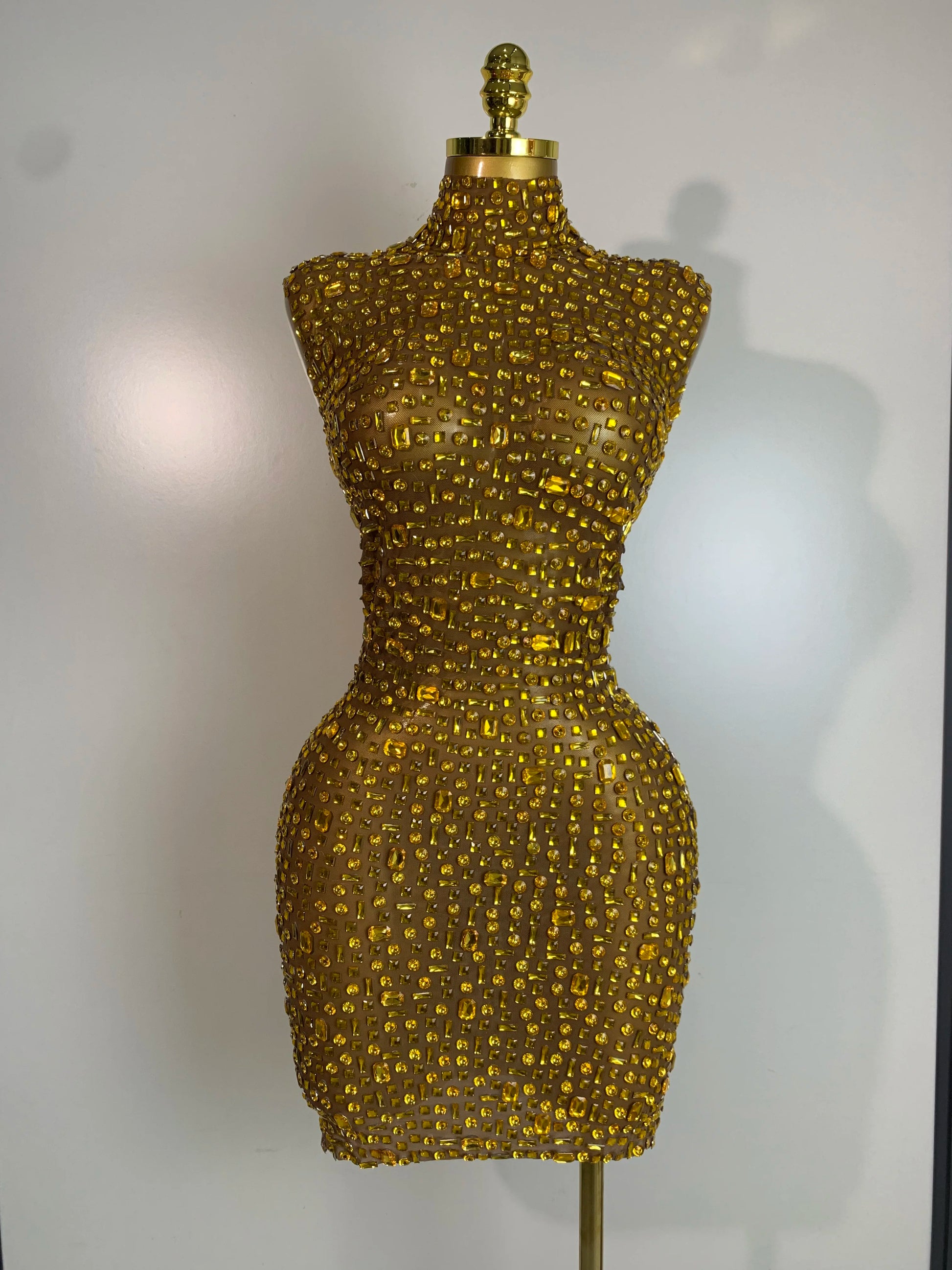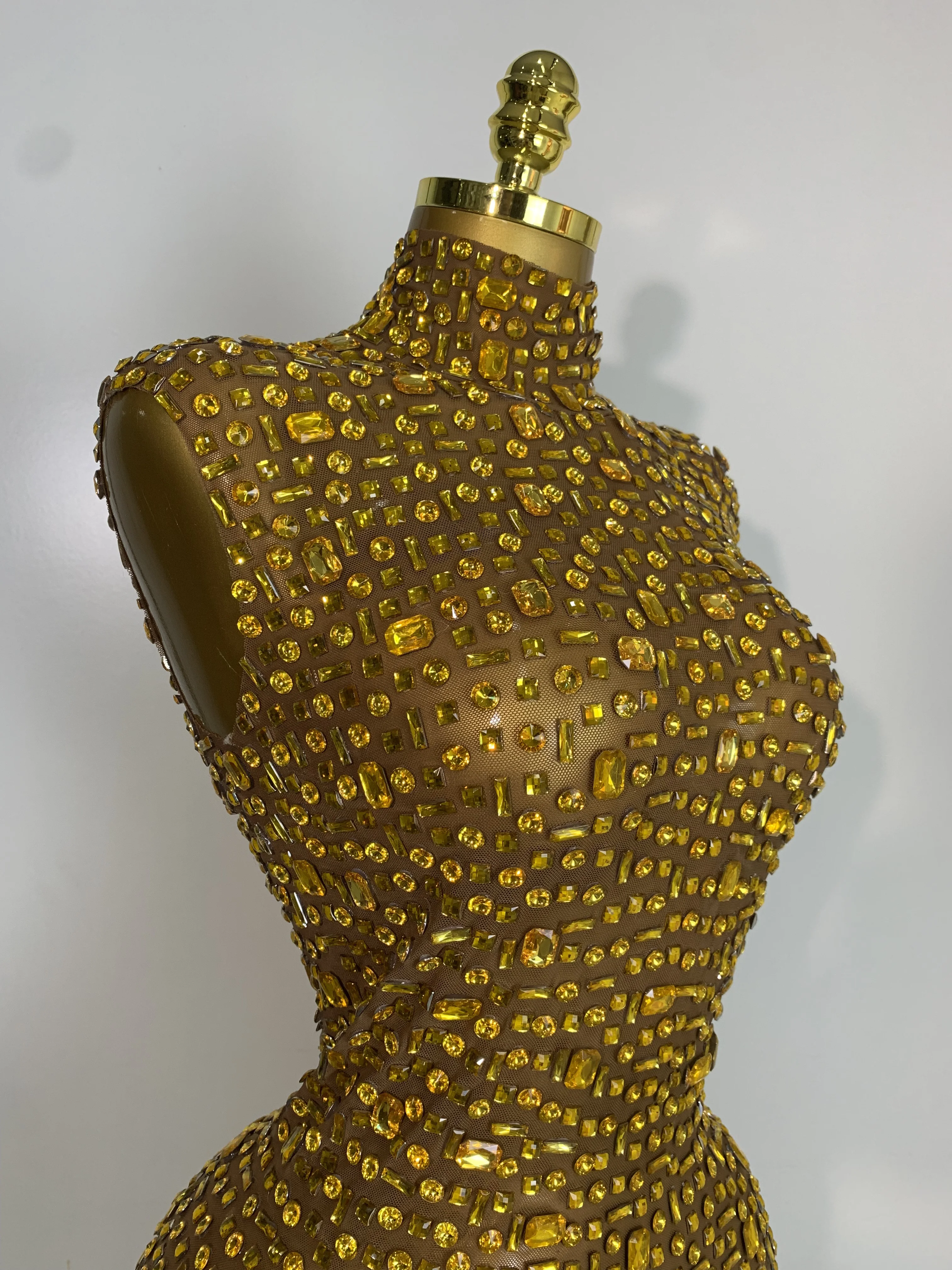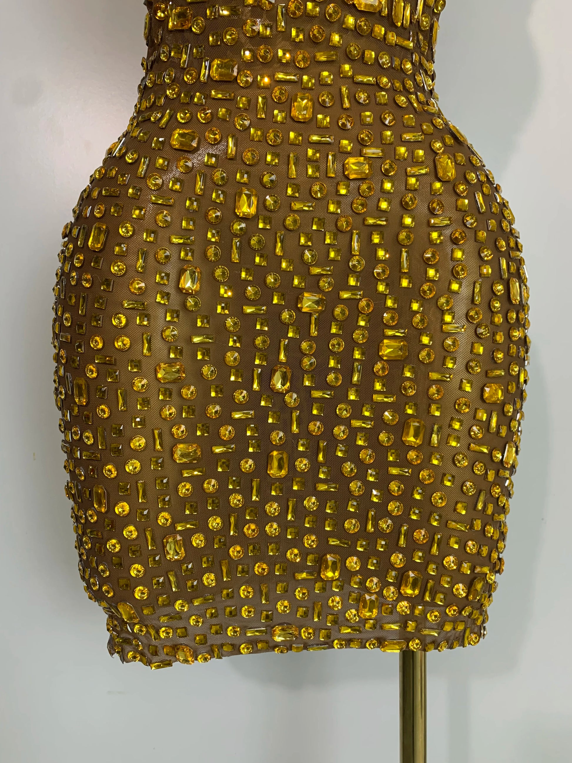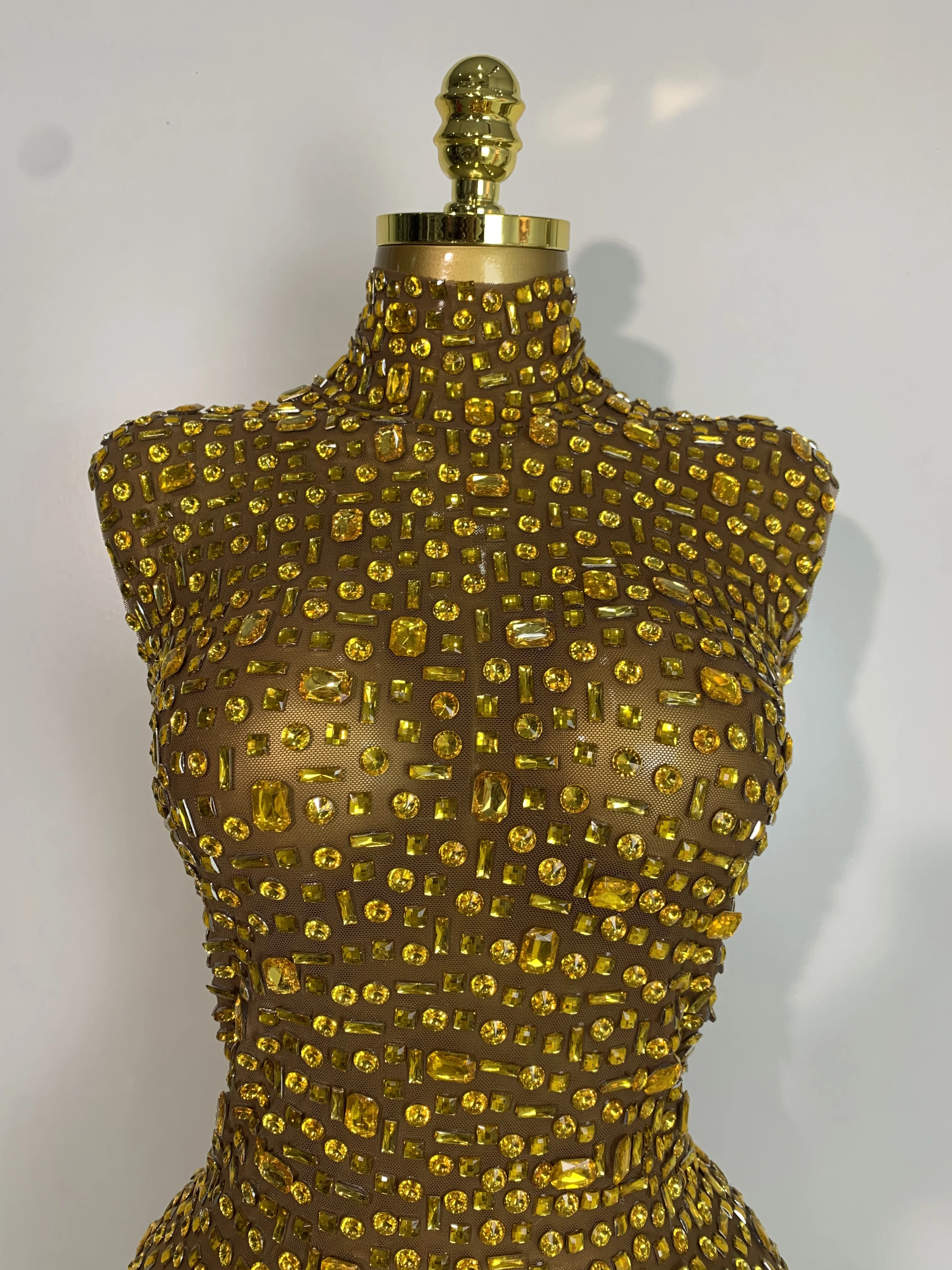 Women Luxury Gold Rhinestone Sexy Mesh Short Dress Sparkly Stage Costume Elegant Party Birthday Dresses Nightclub Singer Outf