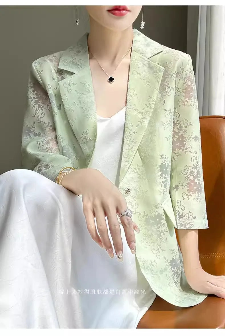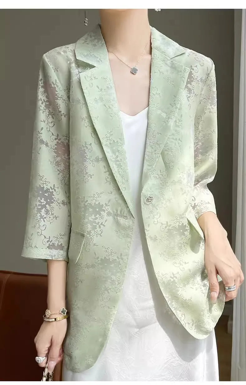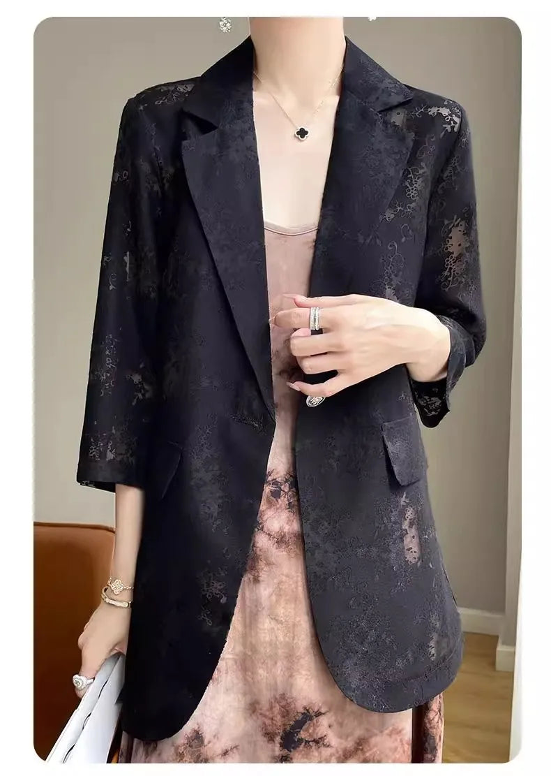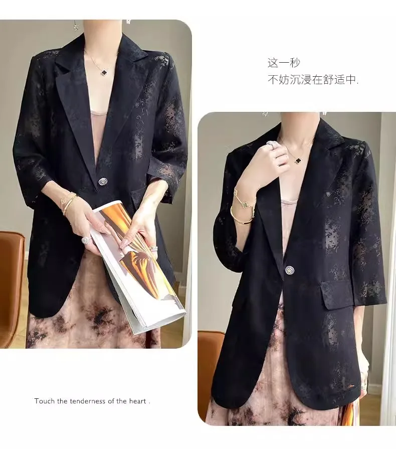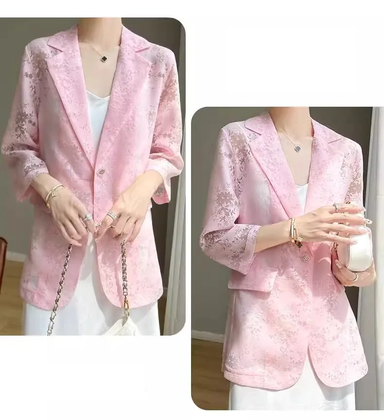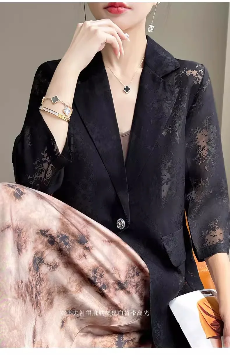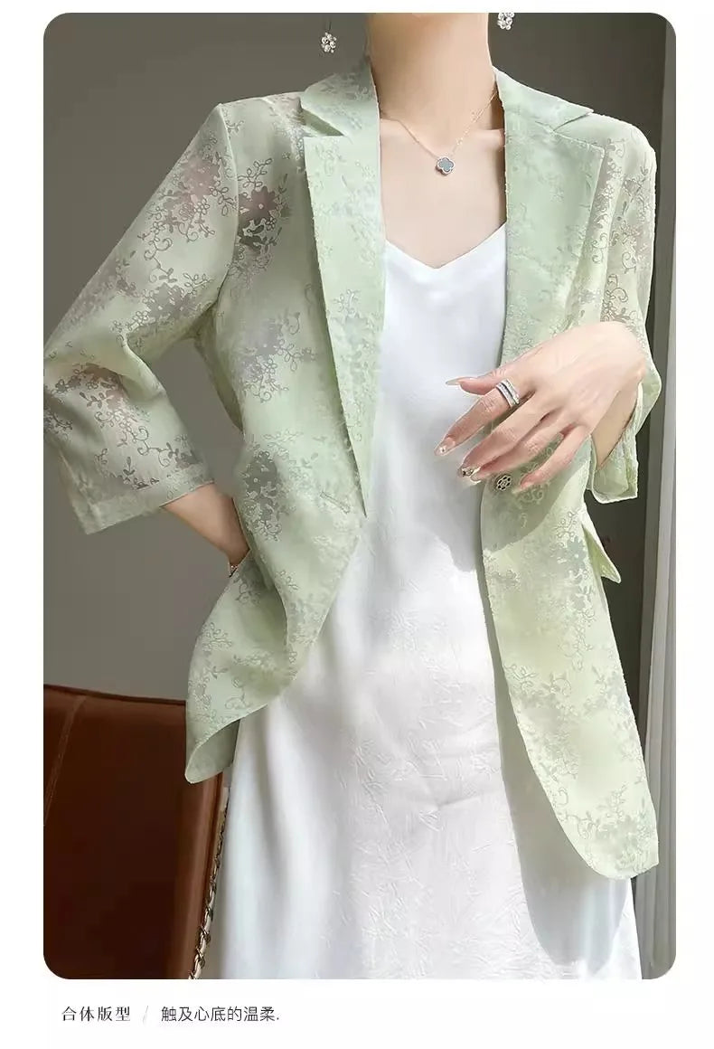 Women New Chinese Style 7/8 Sleeve Blazer Satin Jacquard Slim Fit Office Casual Elegant Sun Protection Lightweight Free Shipping
