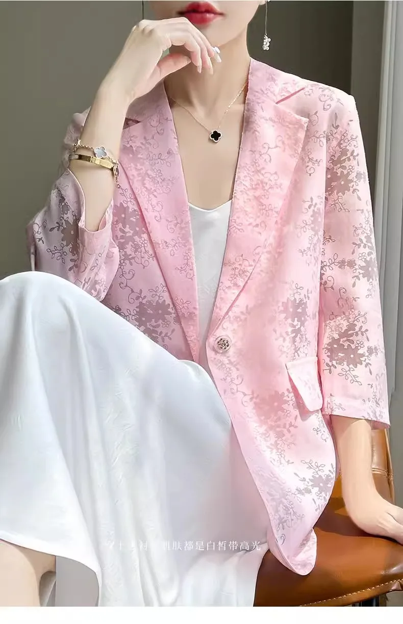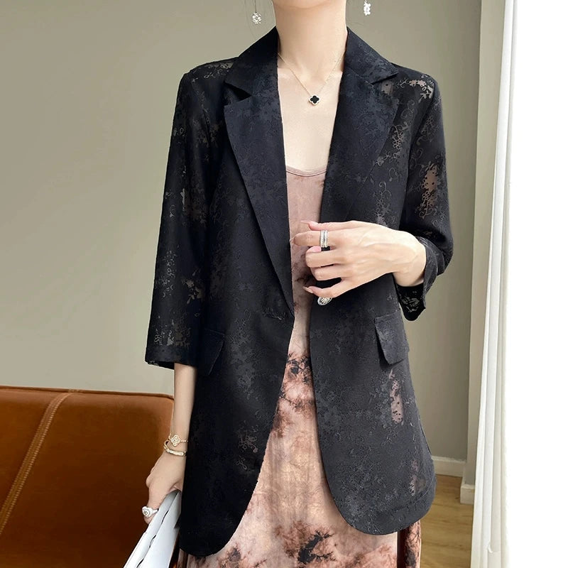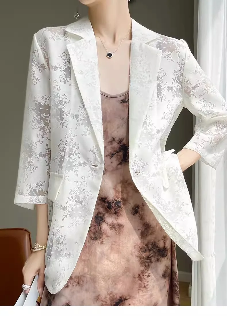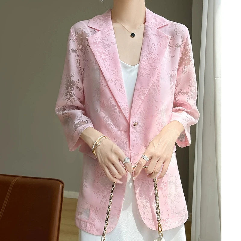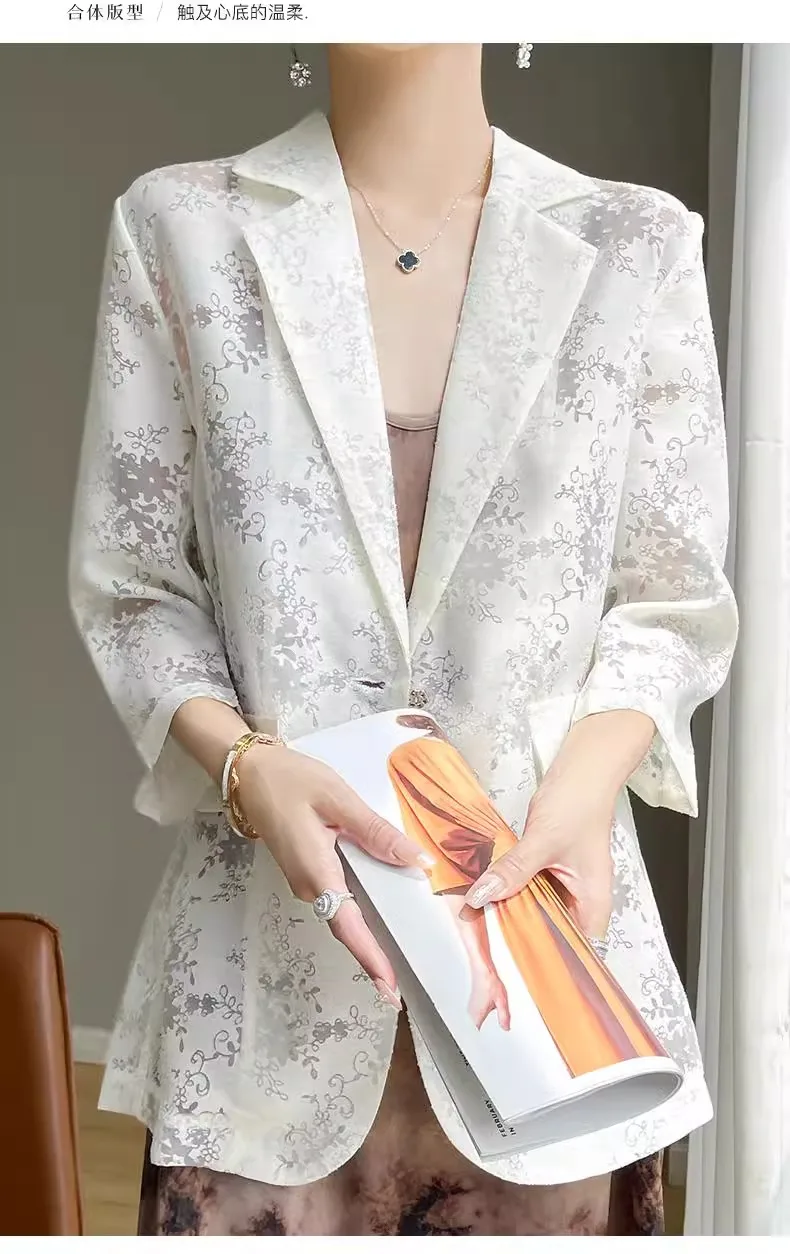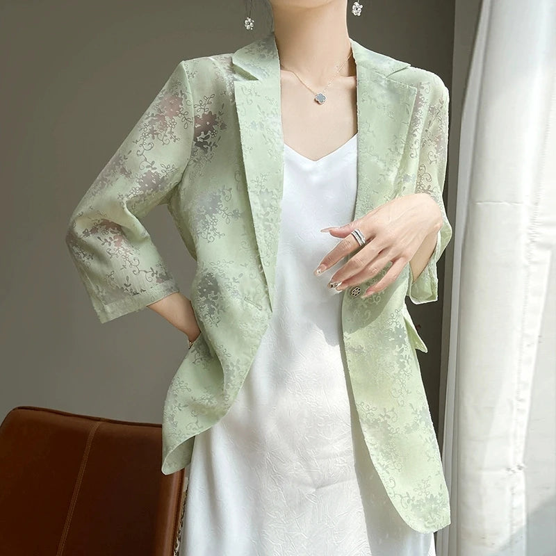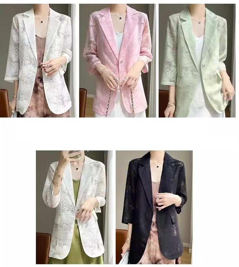 Women New Chinese Style 7/8 Sleeve Blazer Satin Jacquard Slim Fit Office Casual Elegant Sun Protection Lightweight Free Shipping