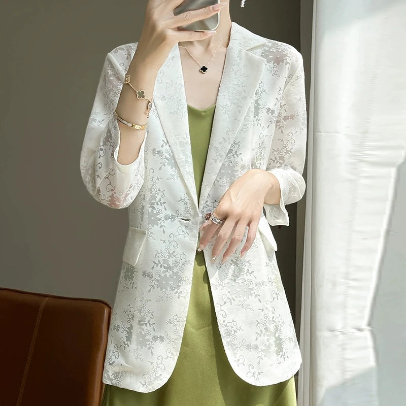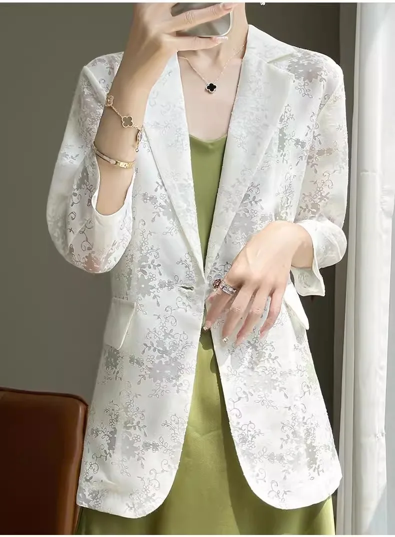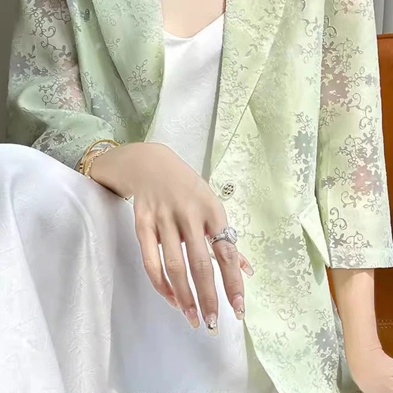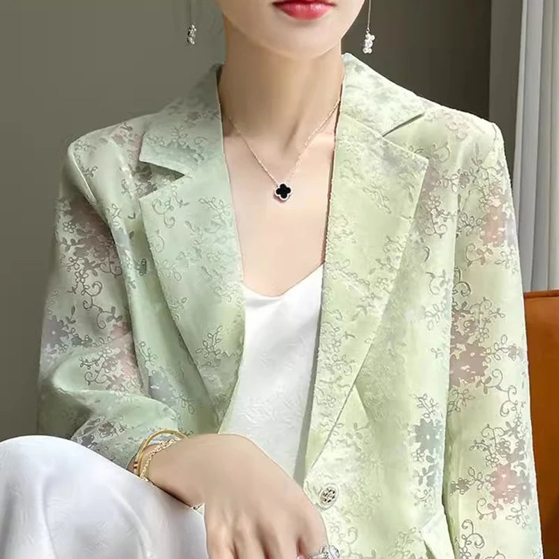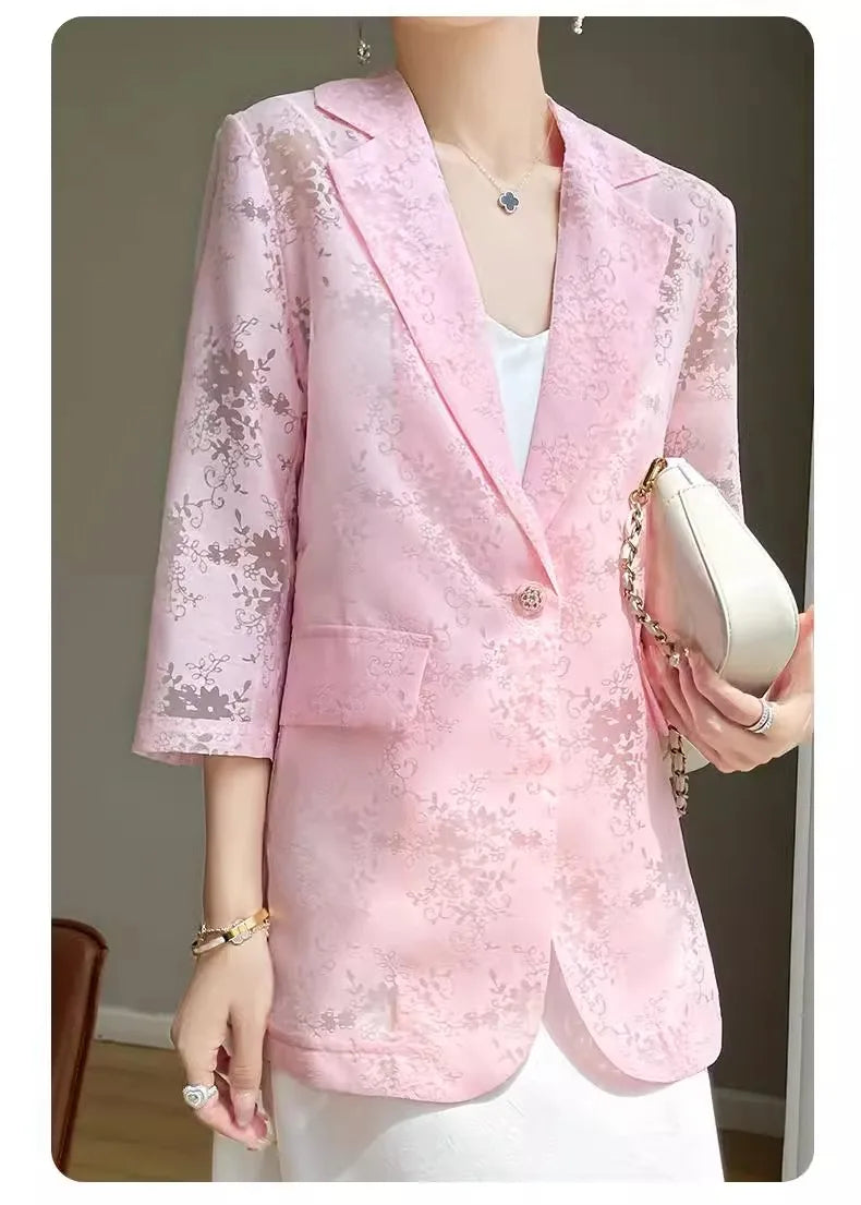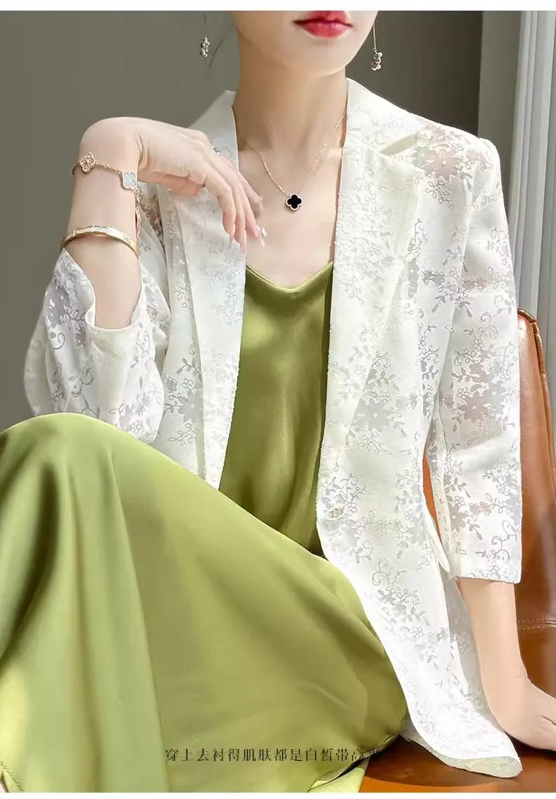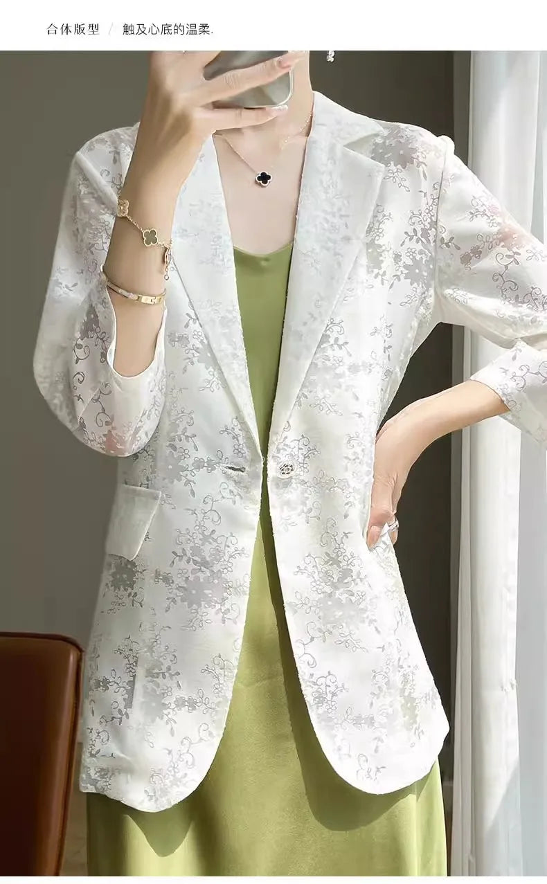 Women New Chinese Style 7/8 Sleeve Blazer Satin Jacquard Slim Fit Office Casual Elegant Sun Protection Lightweight Free Shipping
