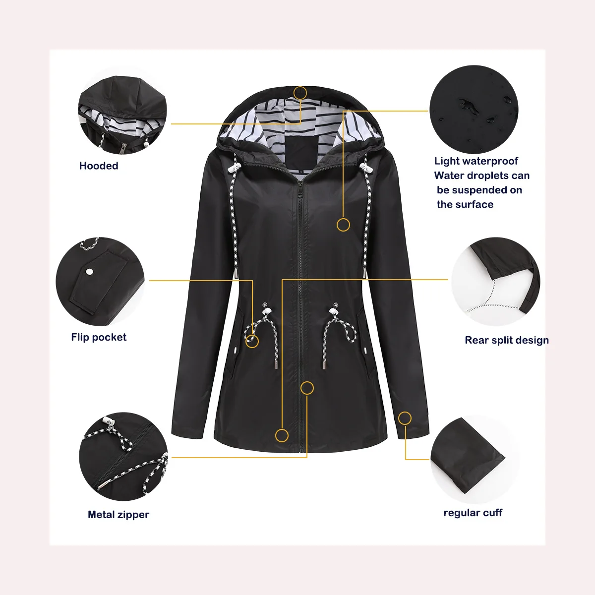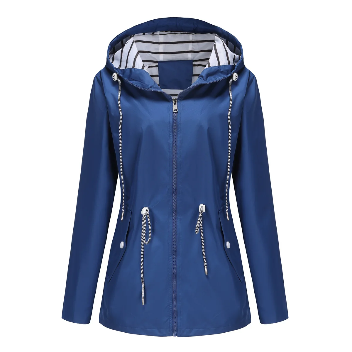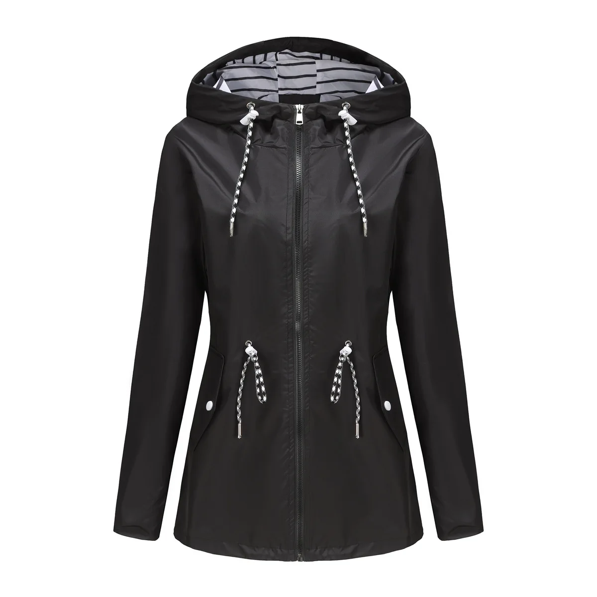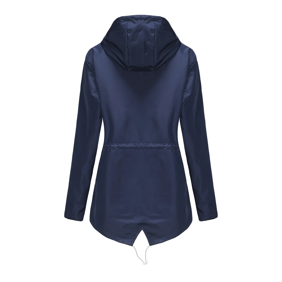 Women Outdoor Windbreaker Casual Loose Hooded Waterproof Raincoat Long Sleeve Solid Color Mid-length Zipper Hiking Jackets