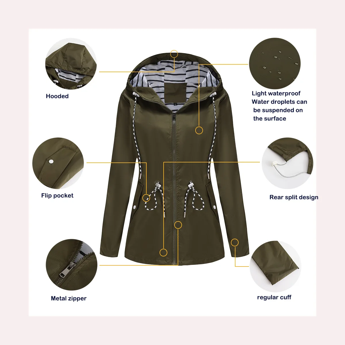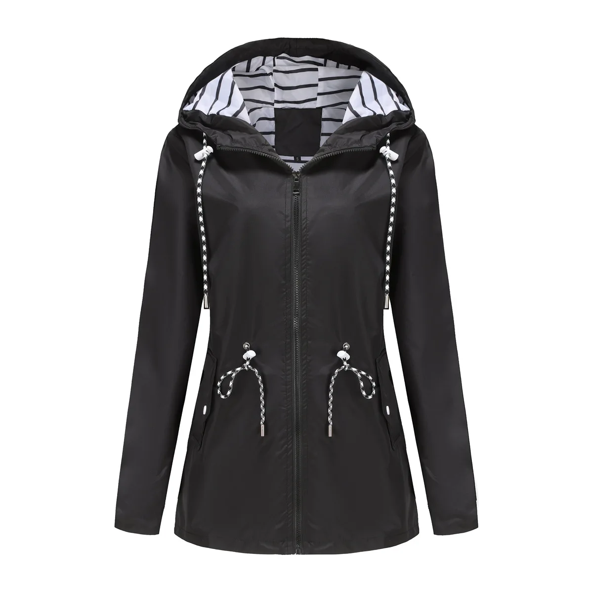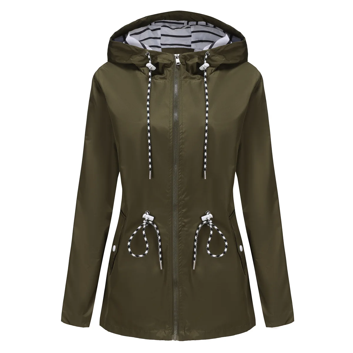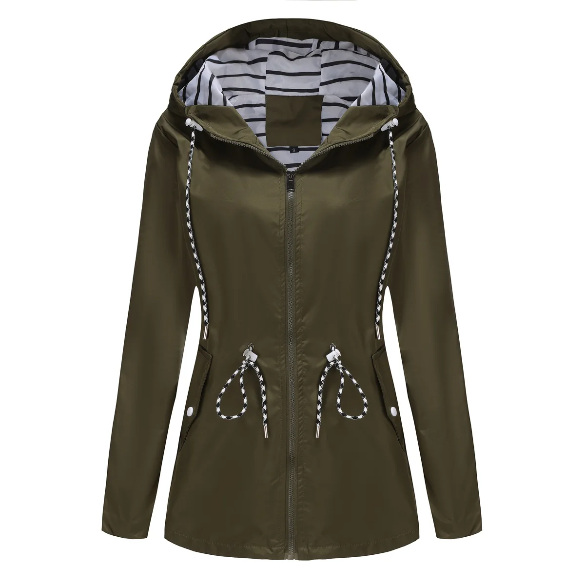 Women Outdoor Windbreaker Casual Loose Hooded Waterproof Raincoat Long Sleeve Solid Color Mid-length Zipper Hiking Jackets