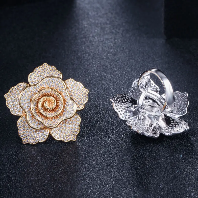 Women Party Engagement Jewelry Dubai Design Gold Plated Shiny Cubic Zircon Crystal Bridal Wedding Chunky 3D Big Rose Flower Ring