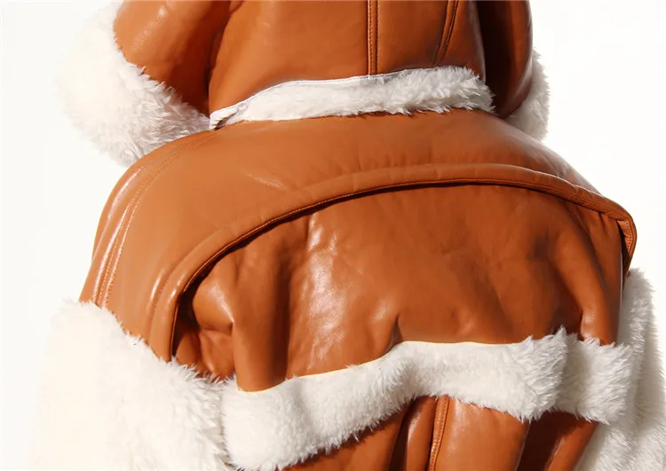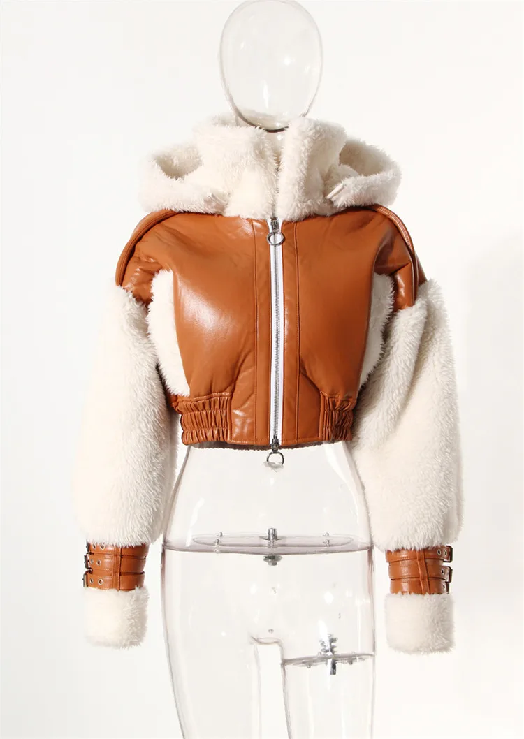 Women PU Coat 2023 Winter Lambswool Stitched Hooded Color Matching Short Leather Jacket Fashion High Waist Warm Tops