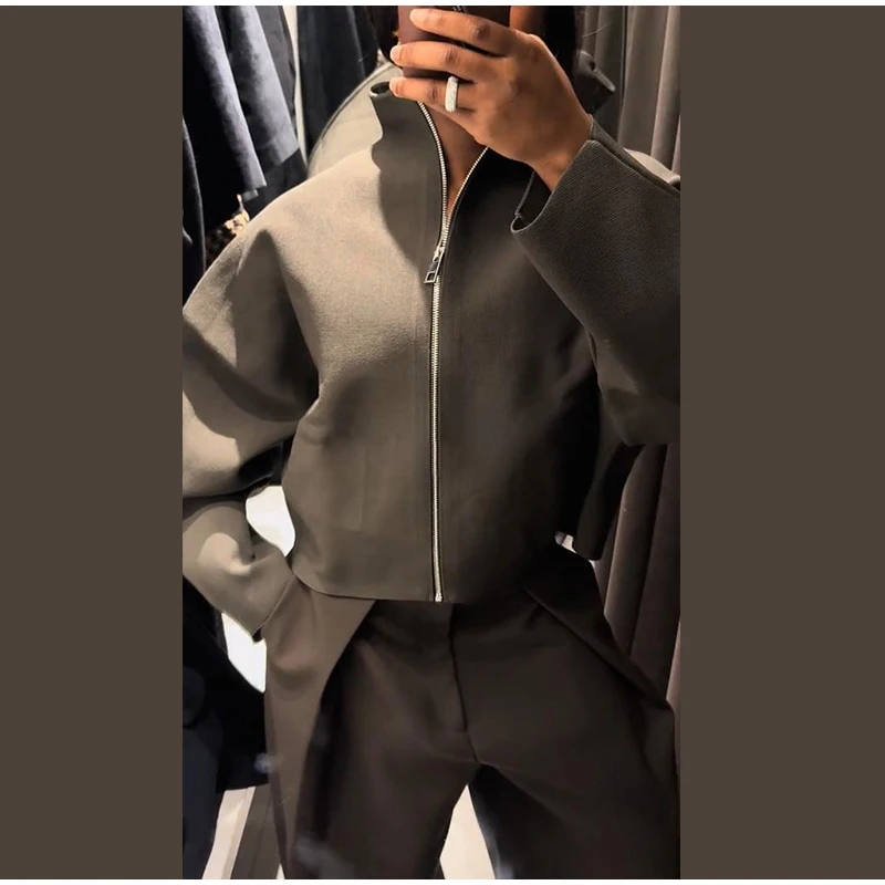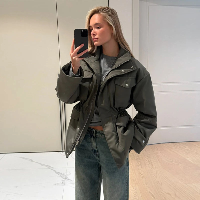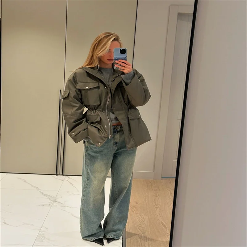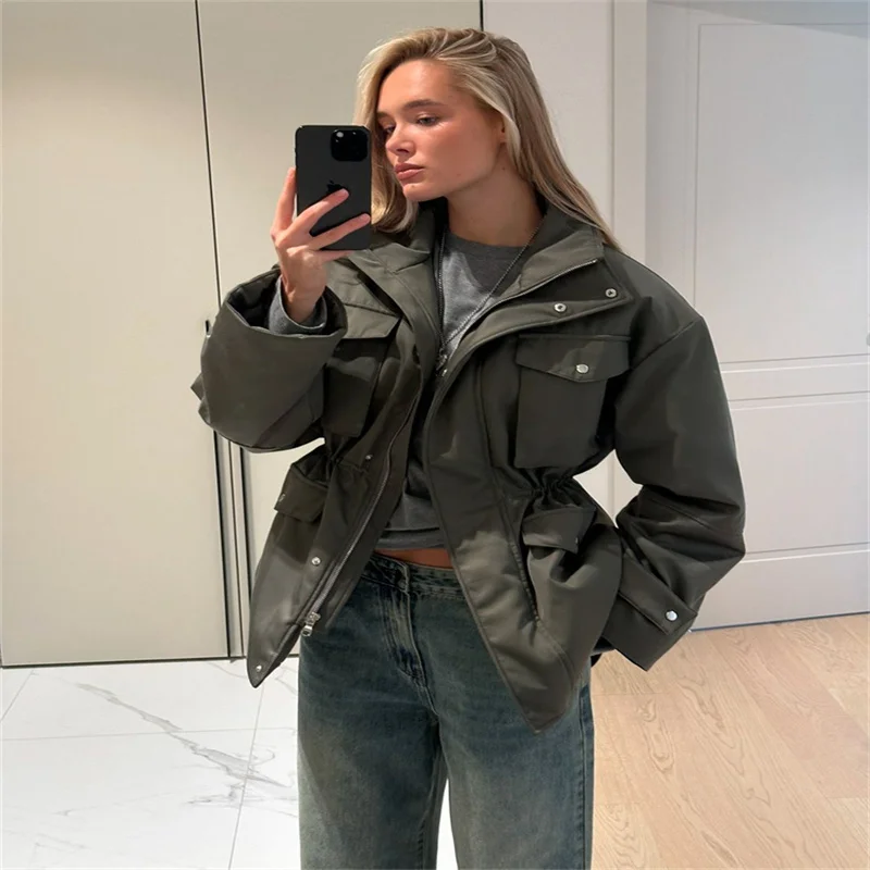 🔹Oversized Design: This army-green jacket features a loose, oversized fit that offers both a trendy silhouette and comfortable wear.
