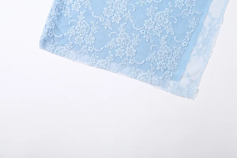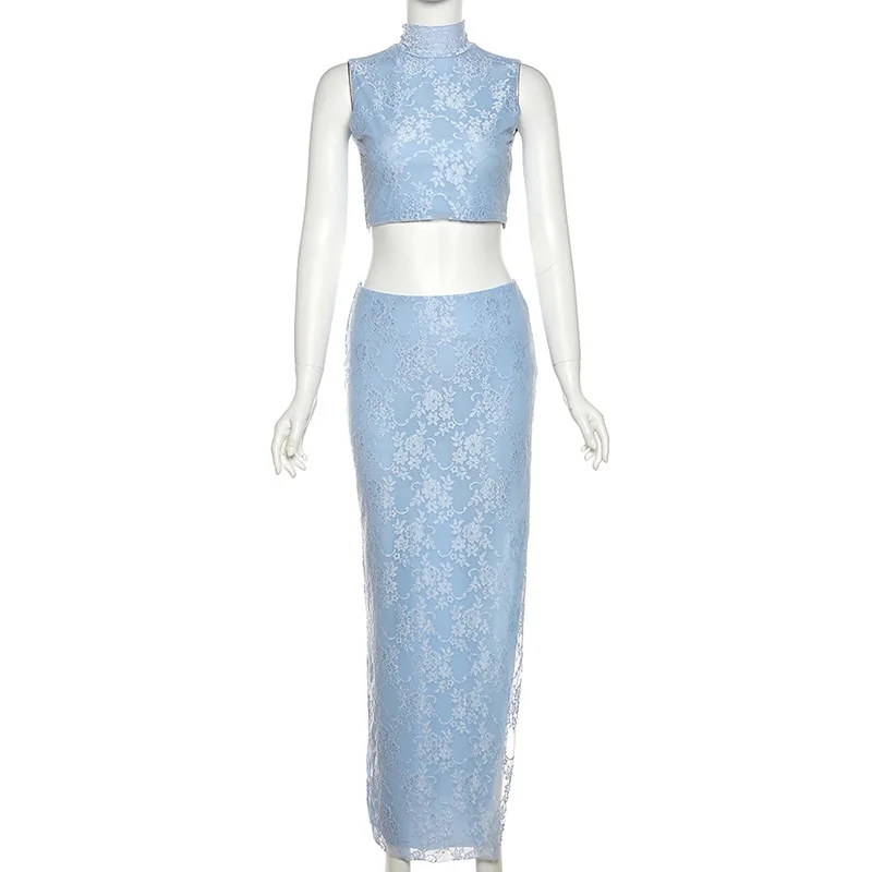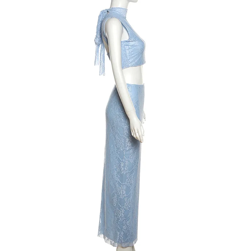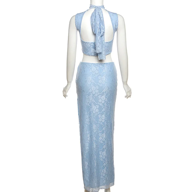 Women Sexy Halter Lace Two Piece Set Bandage Sleeveless Crop Top And Slim Side Split Skirt Sexy Lace Skirt Backless Pencil Skirt
