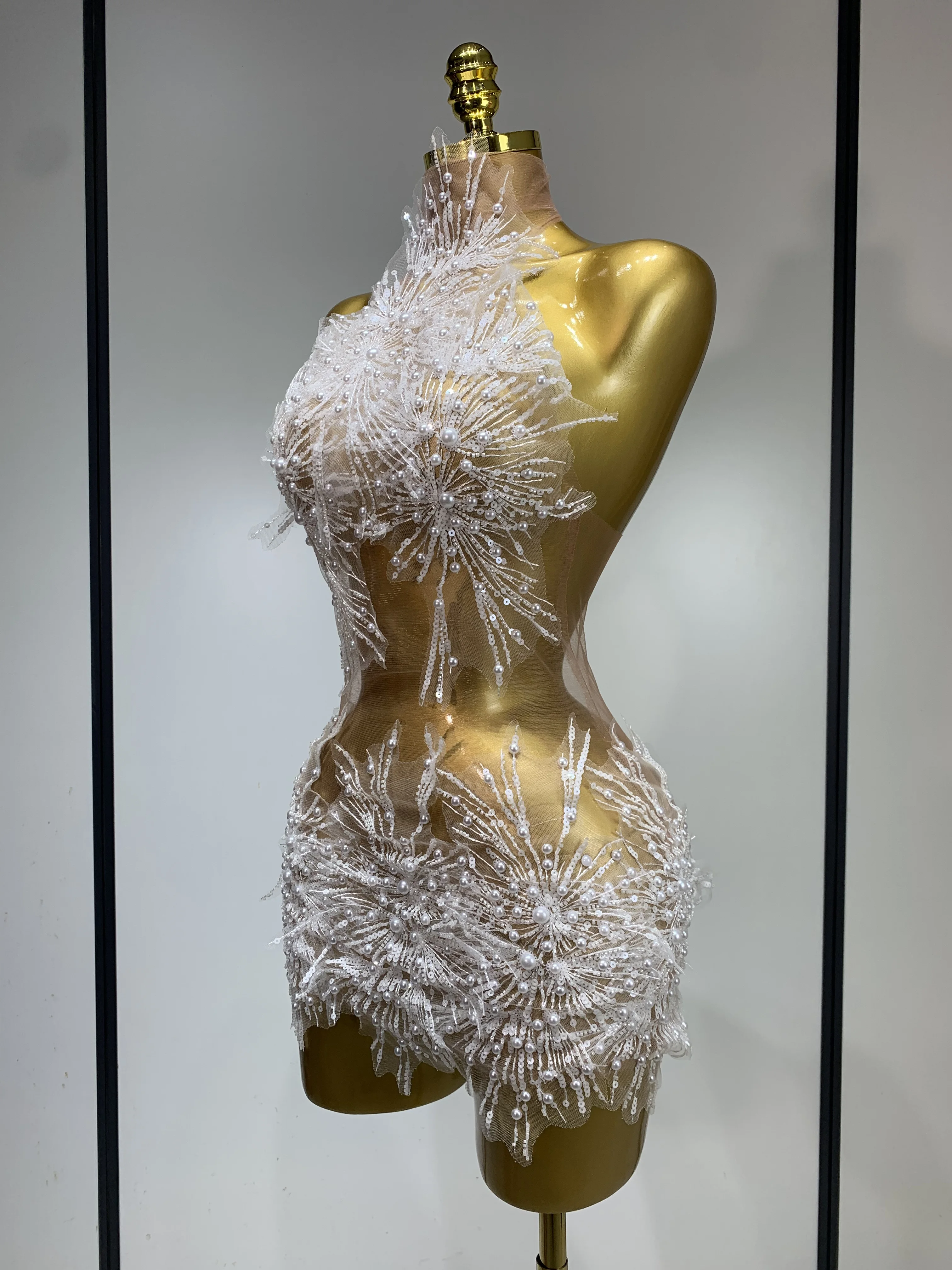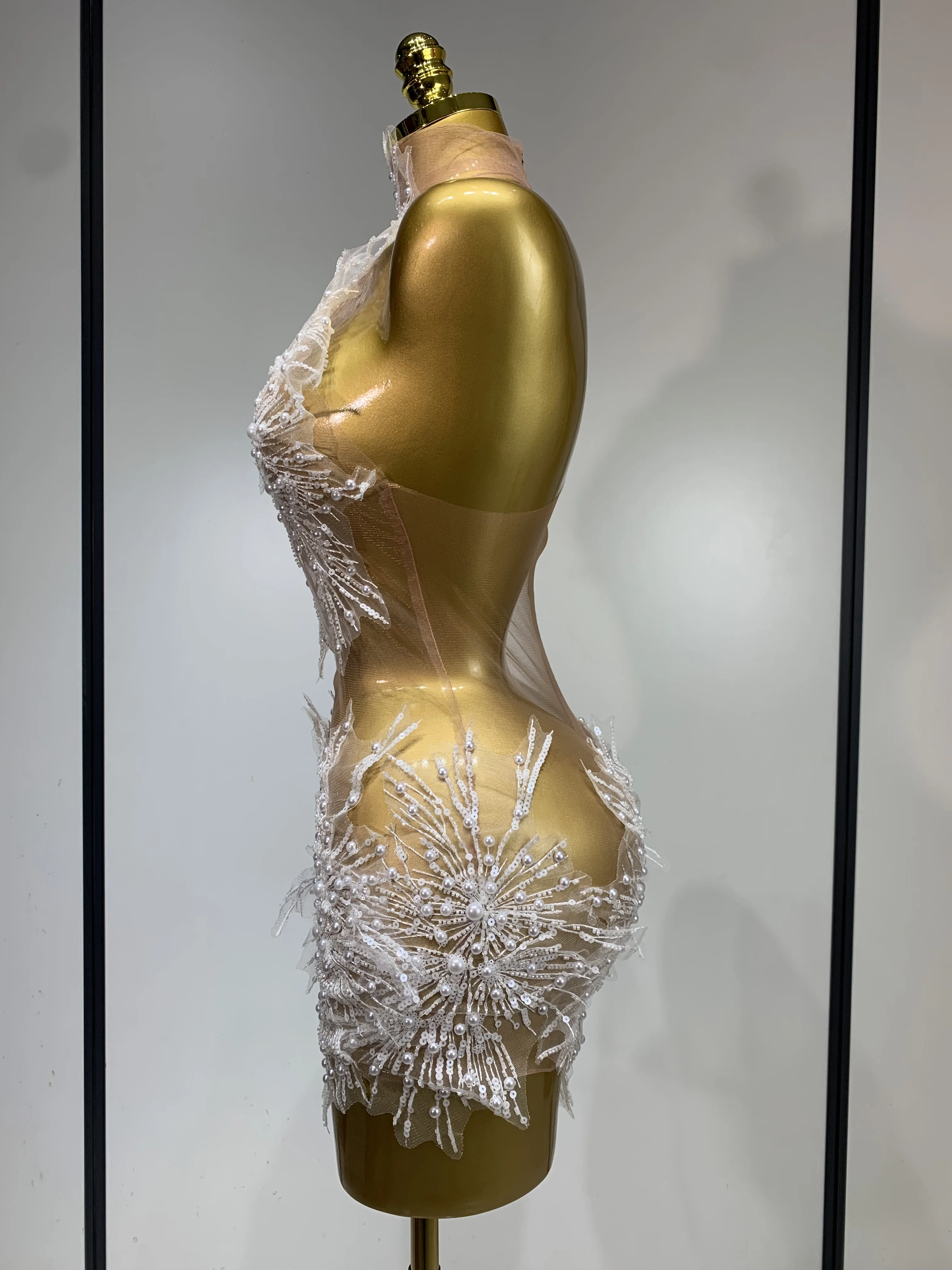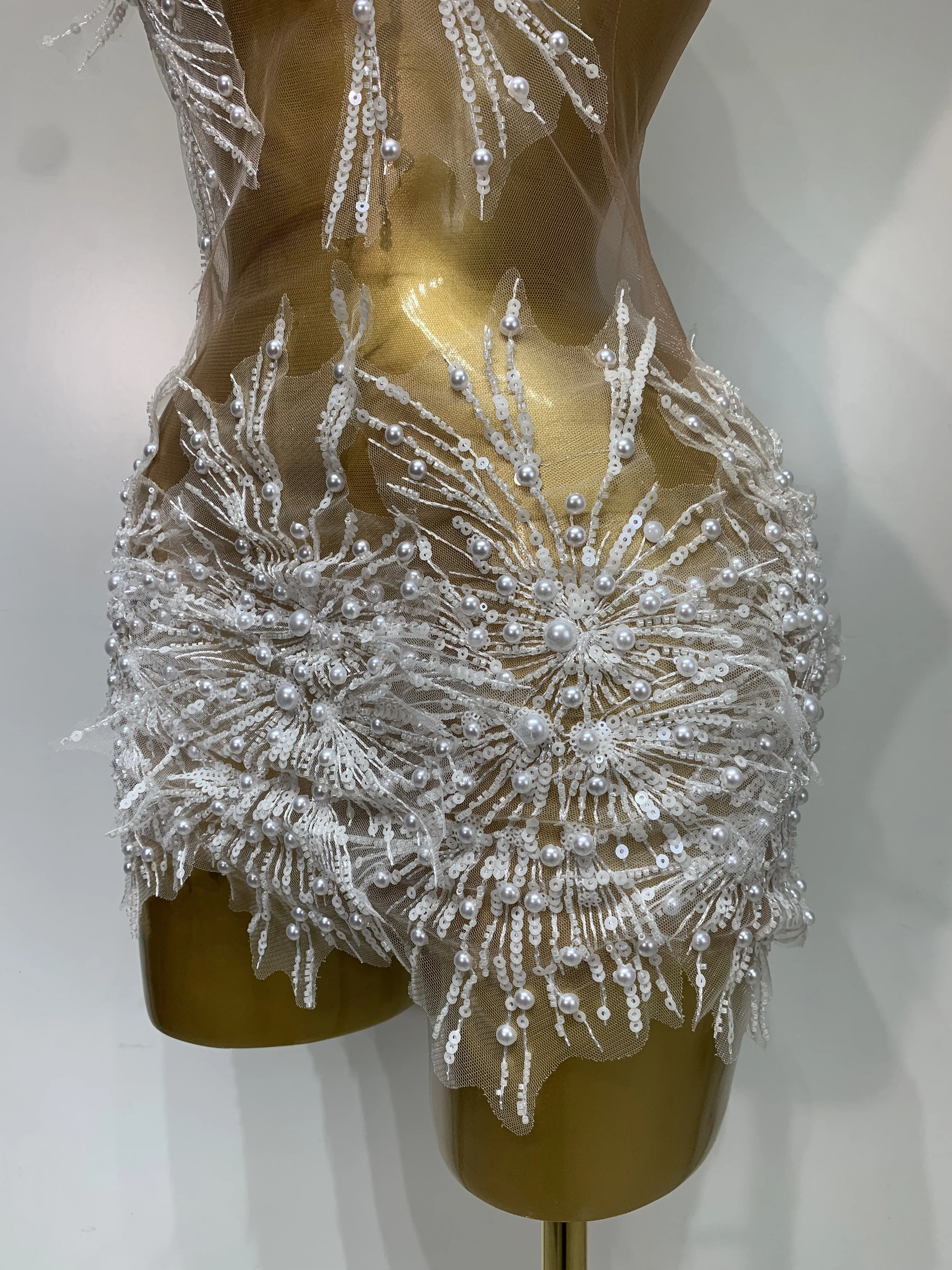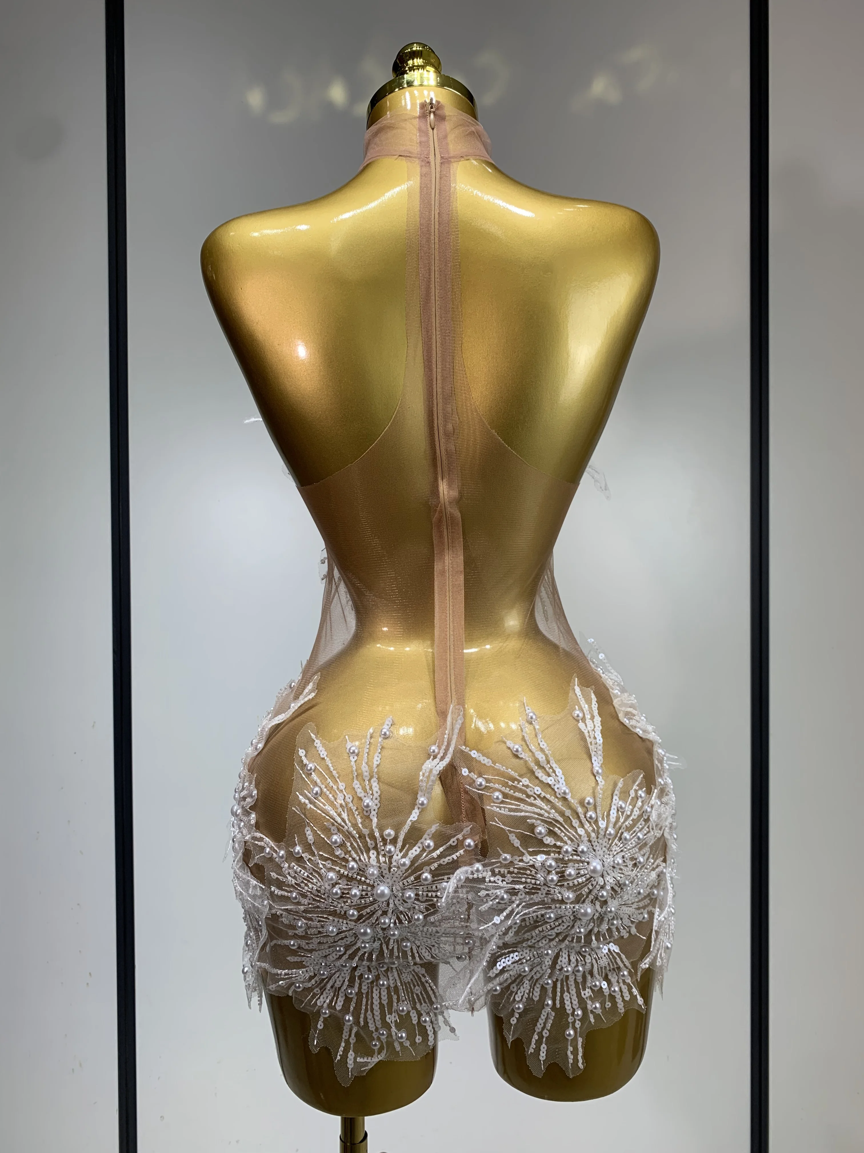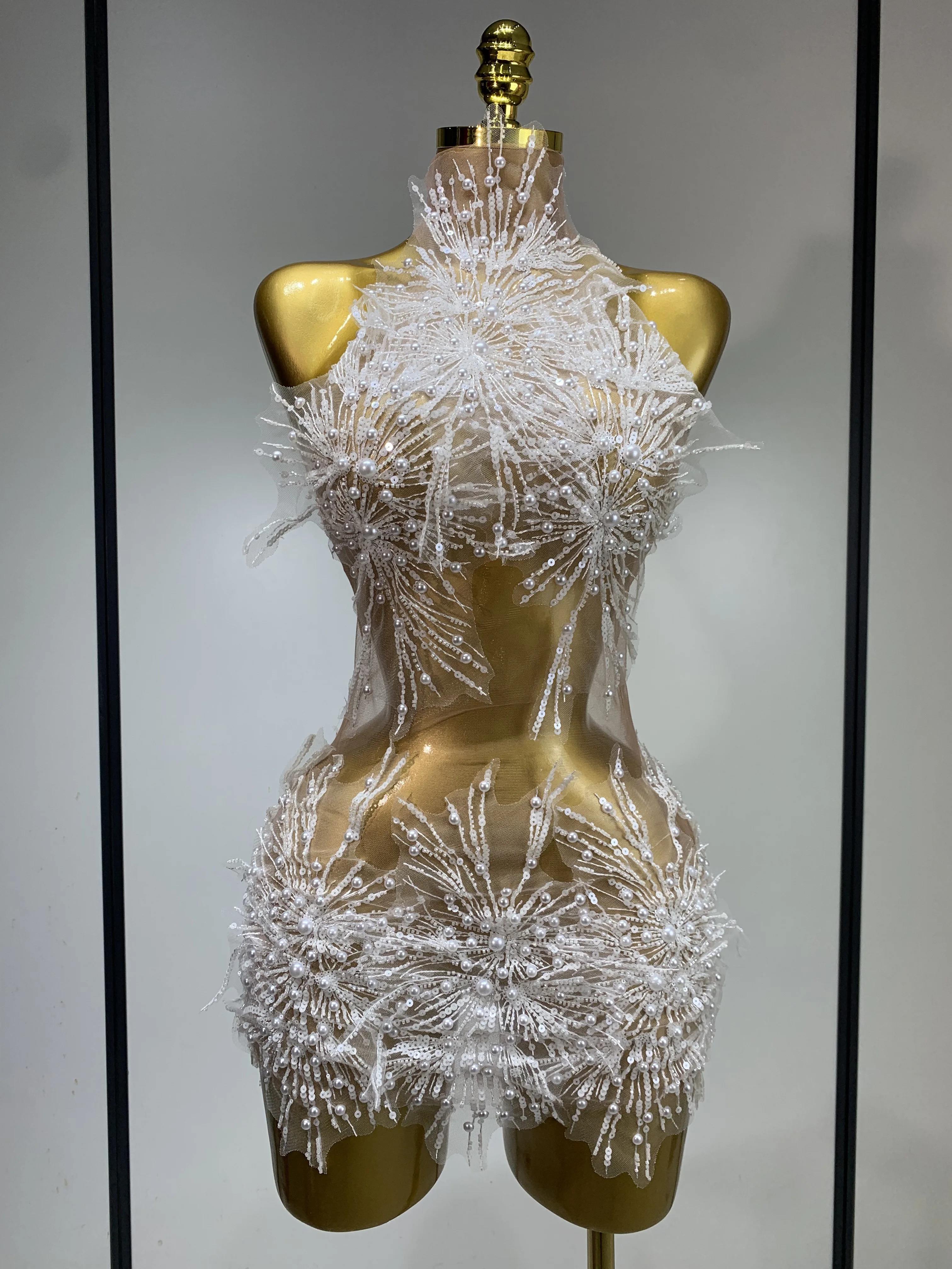 Women Sexy Mesh See Through Pearl Lace Party Mini Dress Celebrate Birthday Photo Shoot Wear Performance Stage Costume