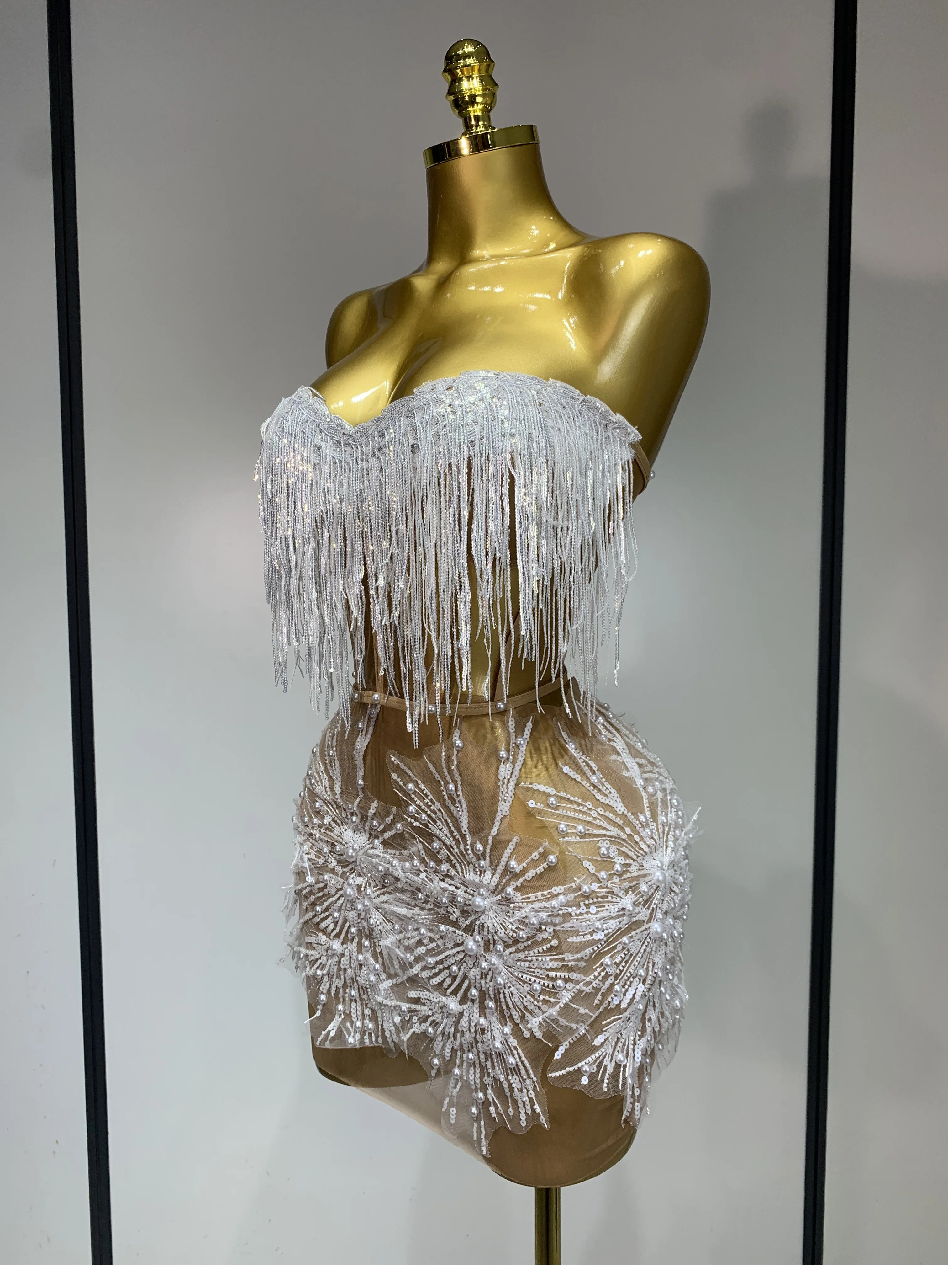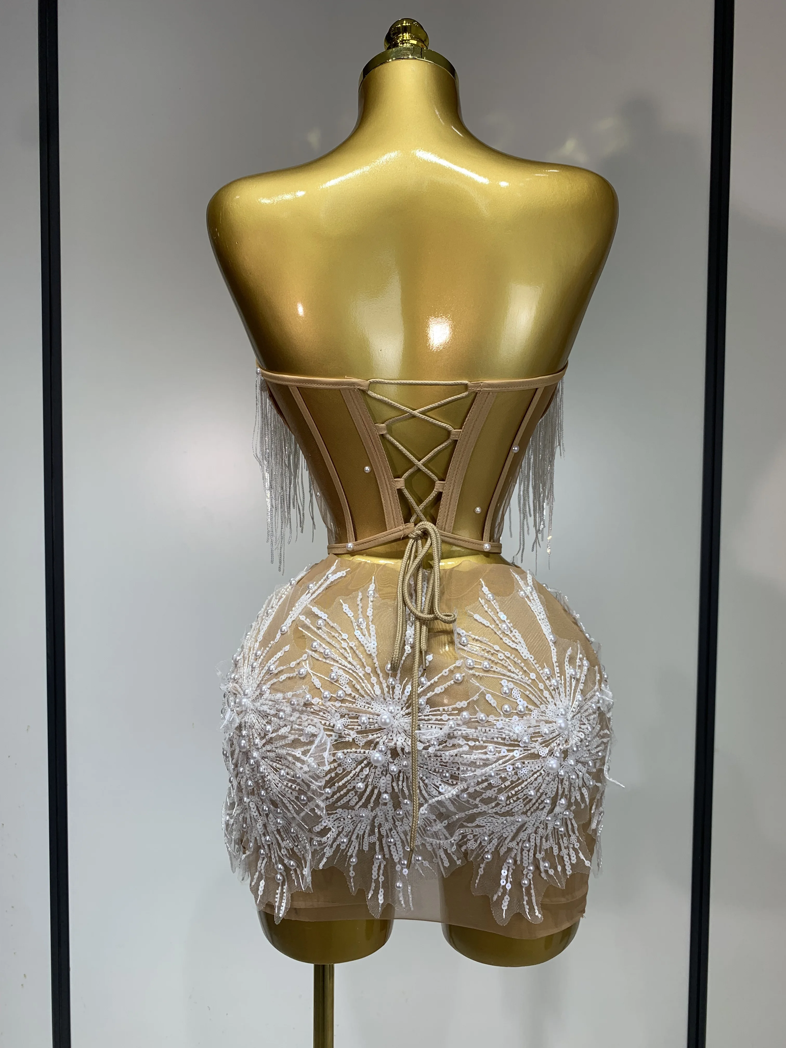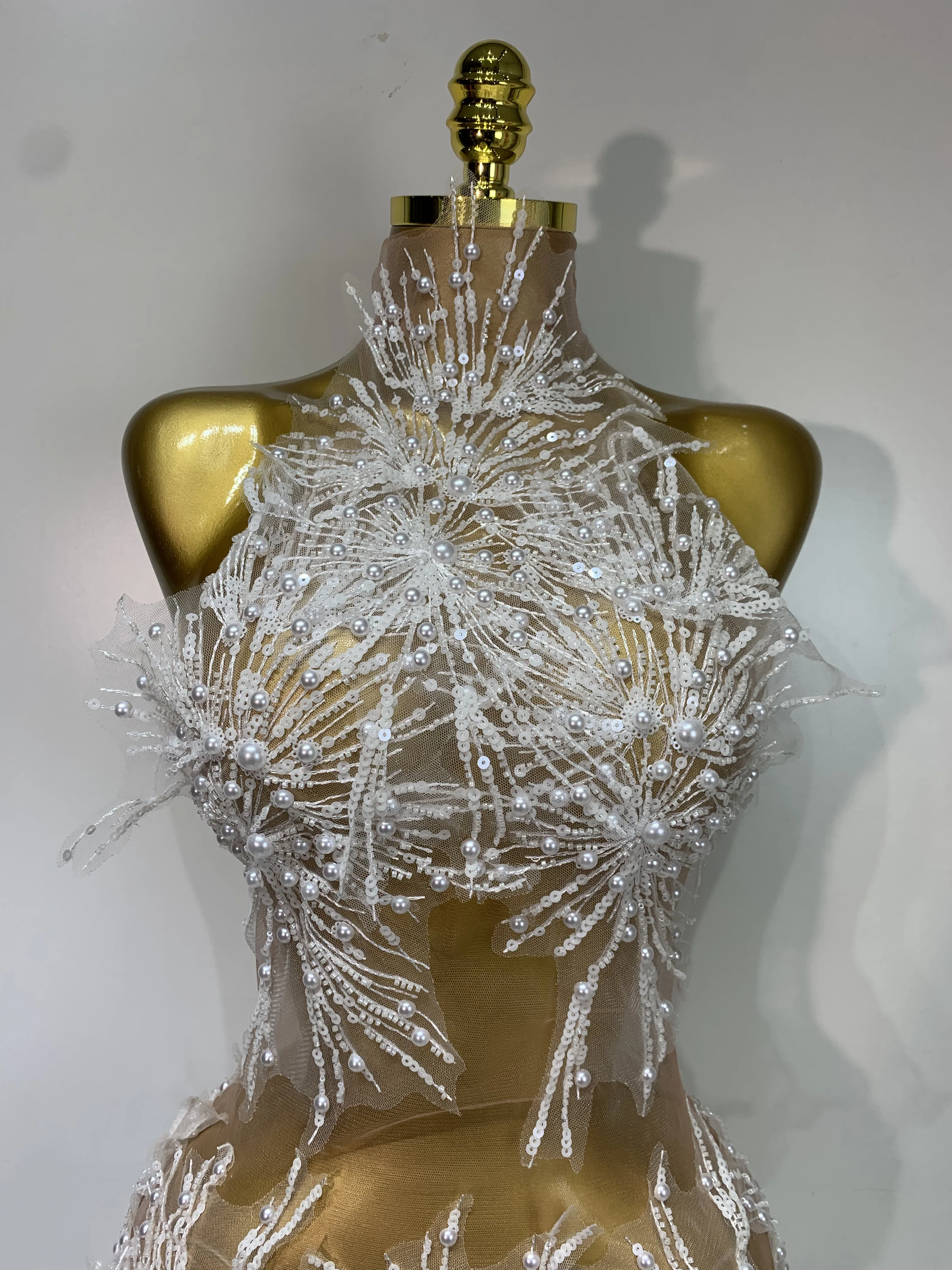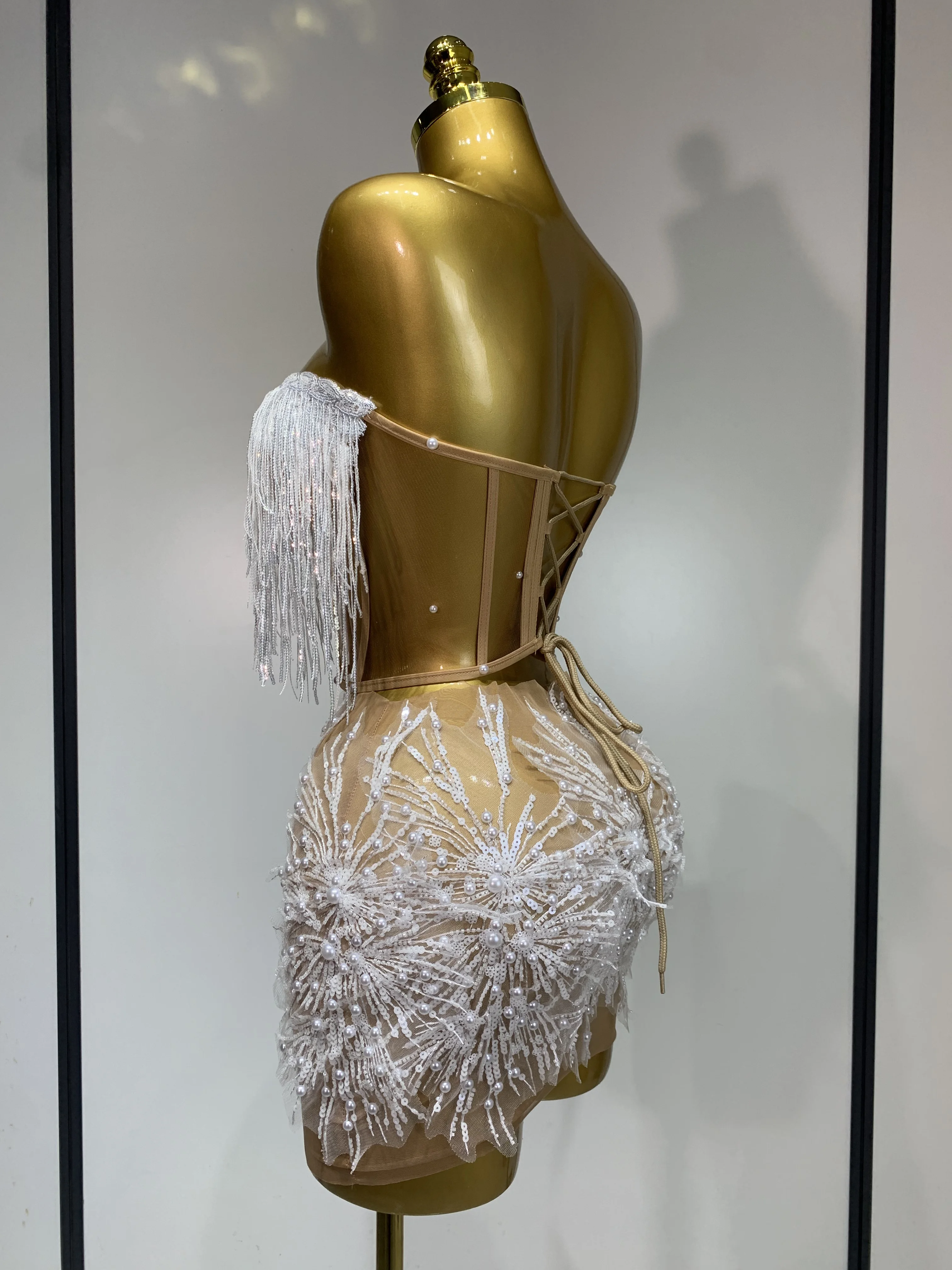 Women Sexy Mesh See Through Pearl Lace Party Mini Dress Celebrate Birthday Photo Shoot Wear Performance Stage Costume