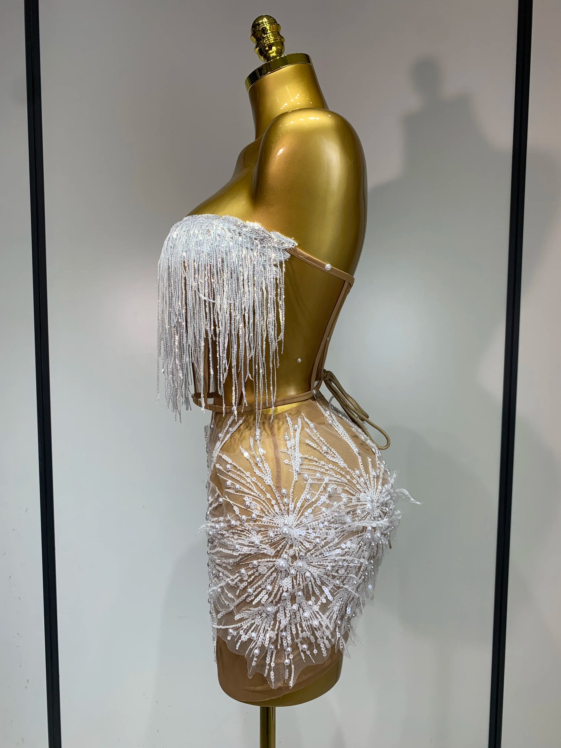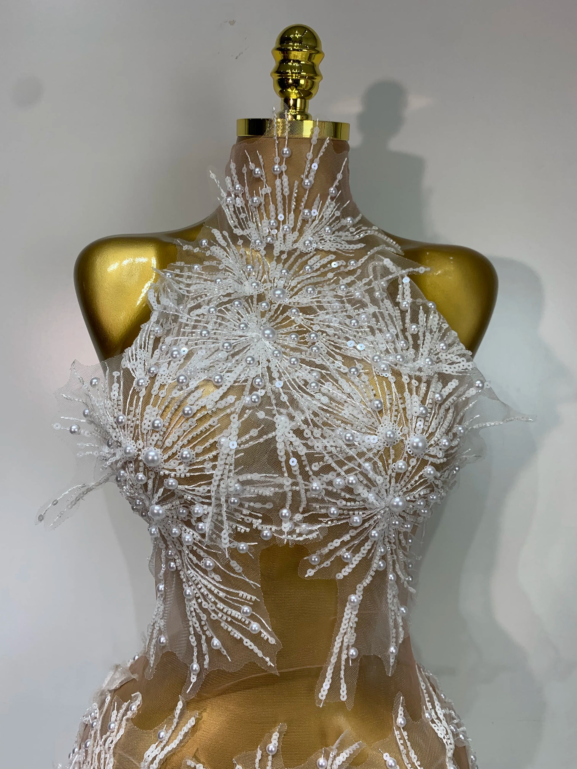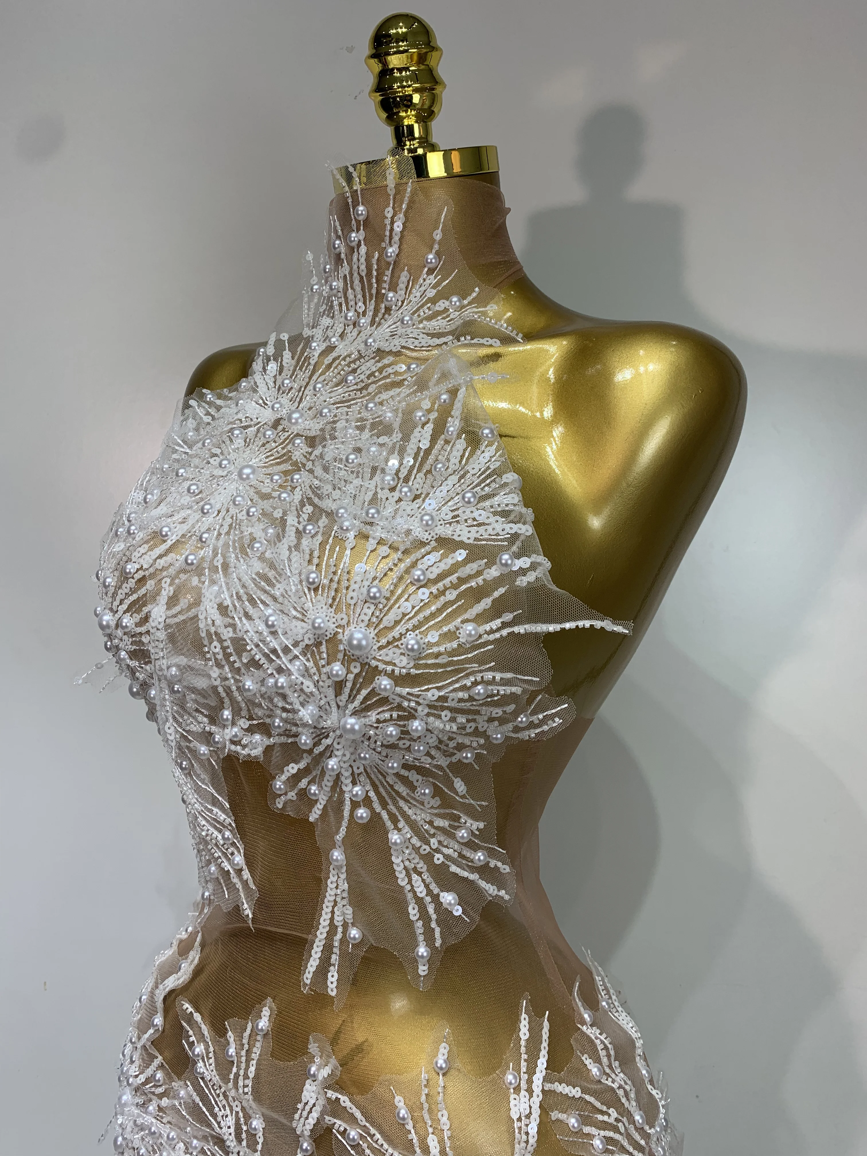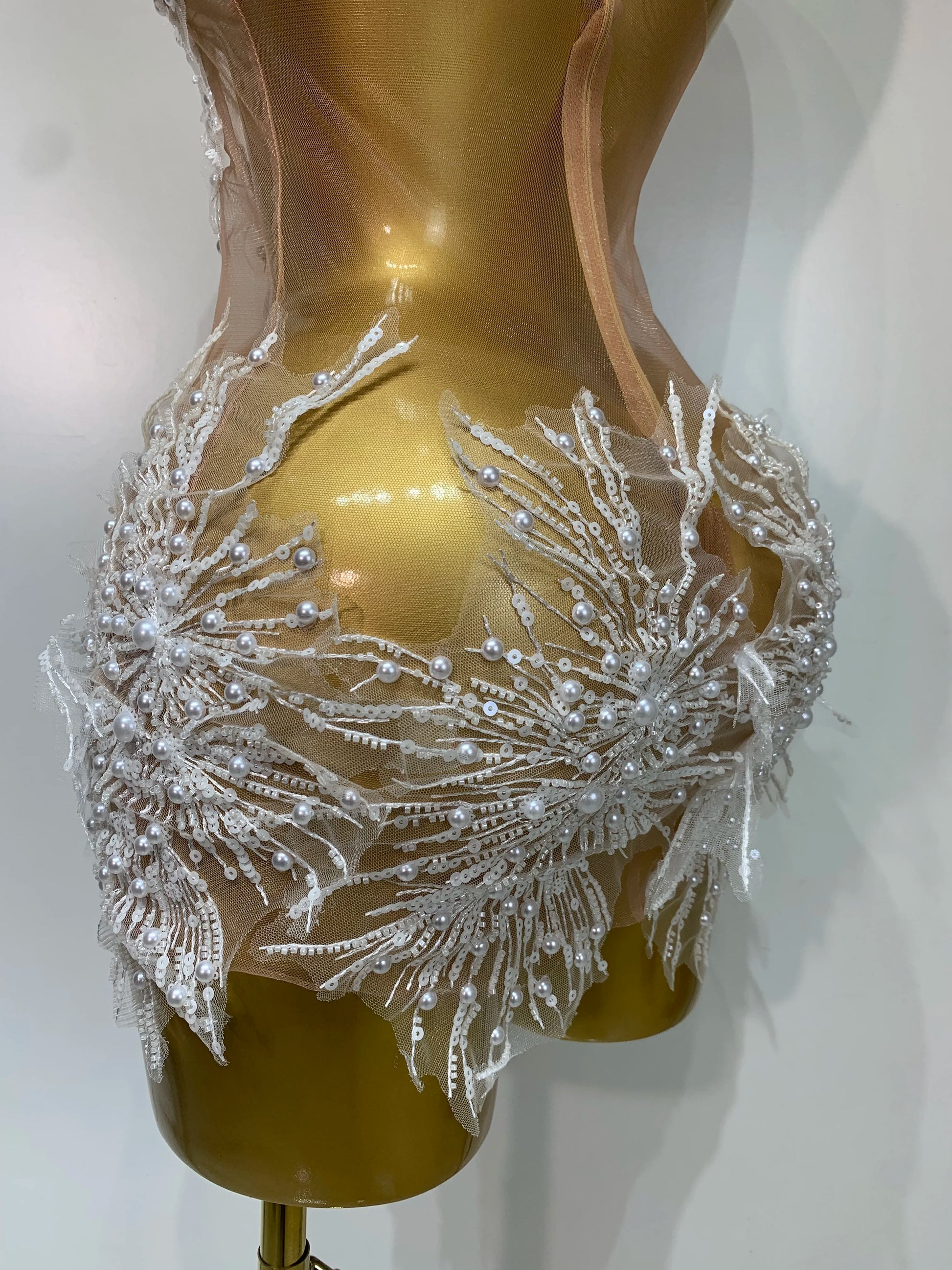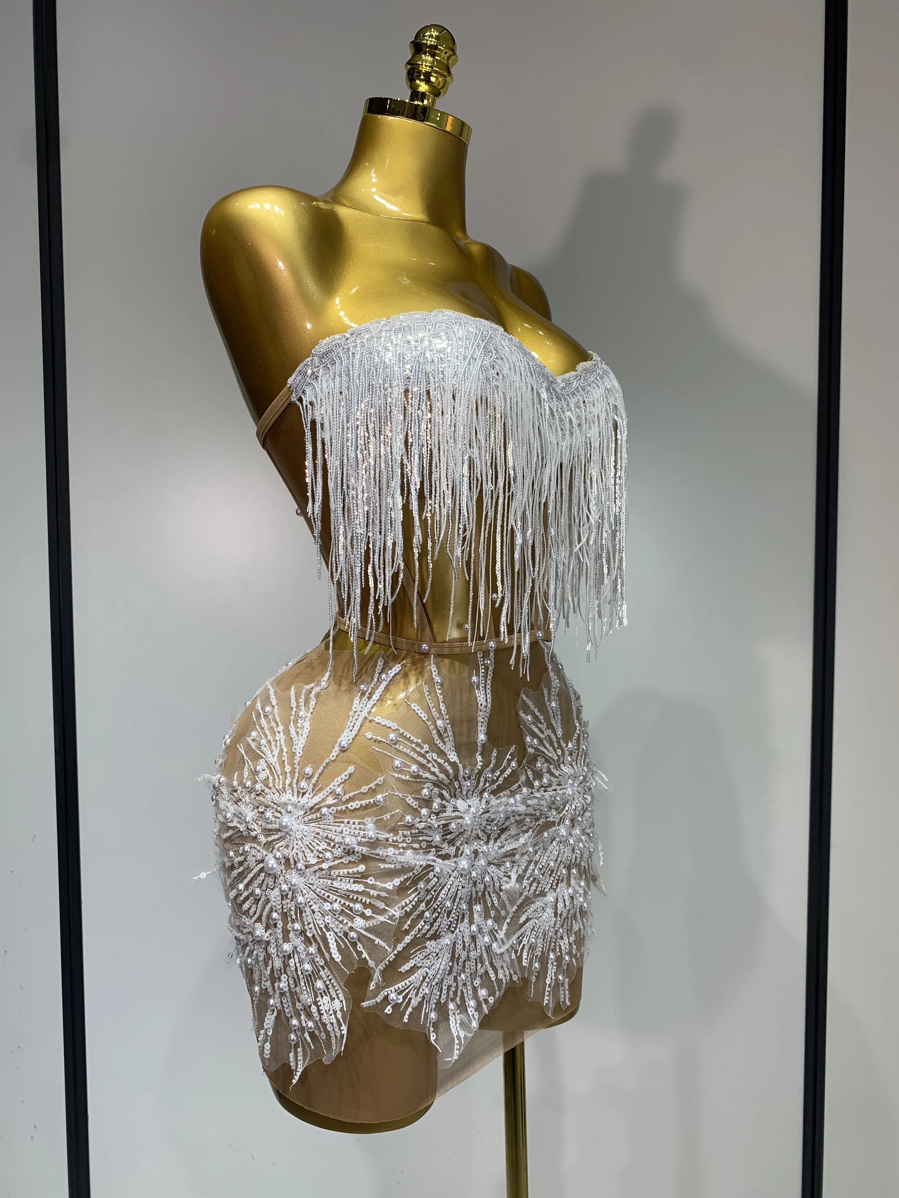 Women Sexy Mesh See Through Pearl Lace Party Mini Dress Celebrate Birthday Photo Shoot Wear Performance Stage Costume