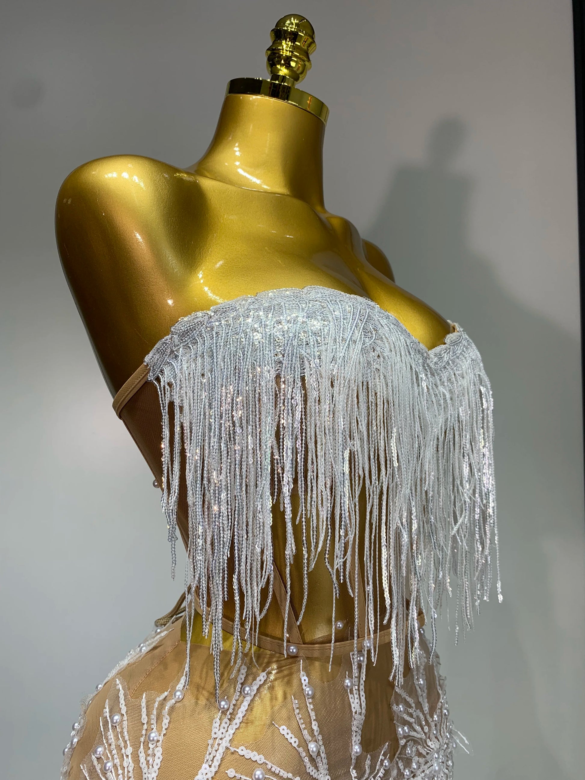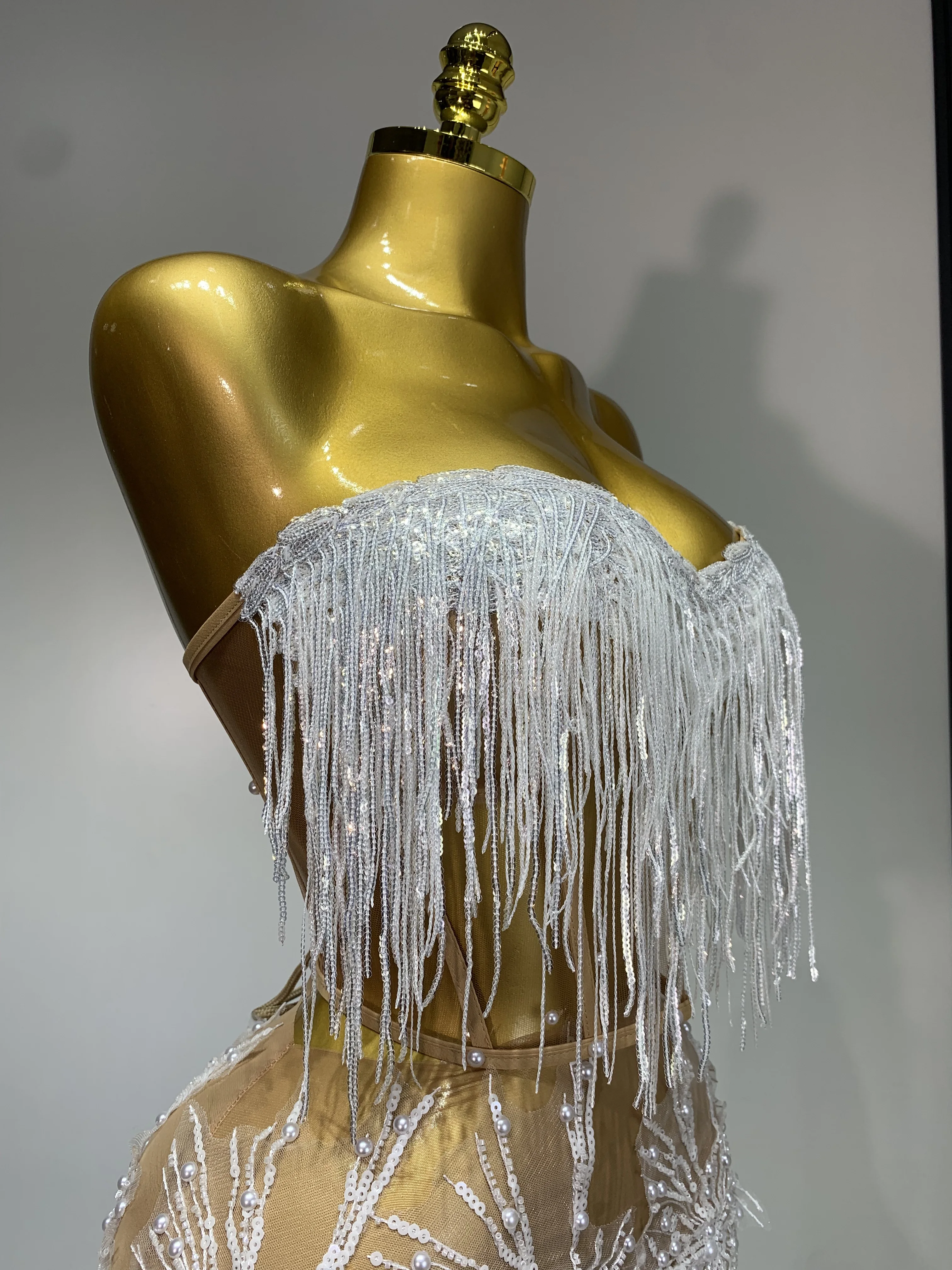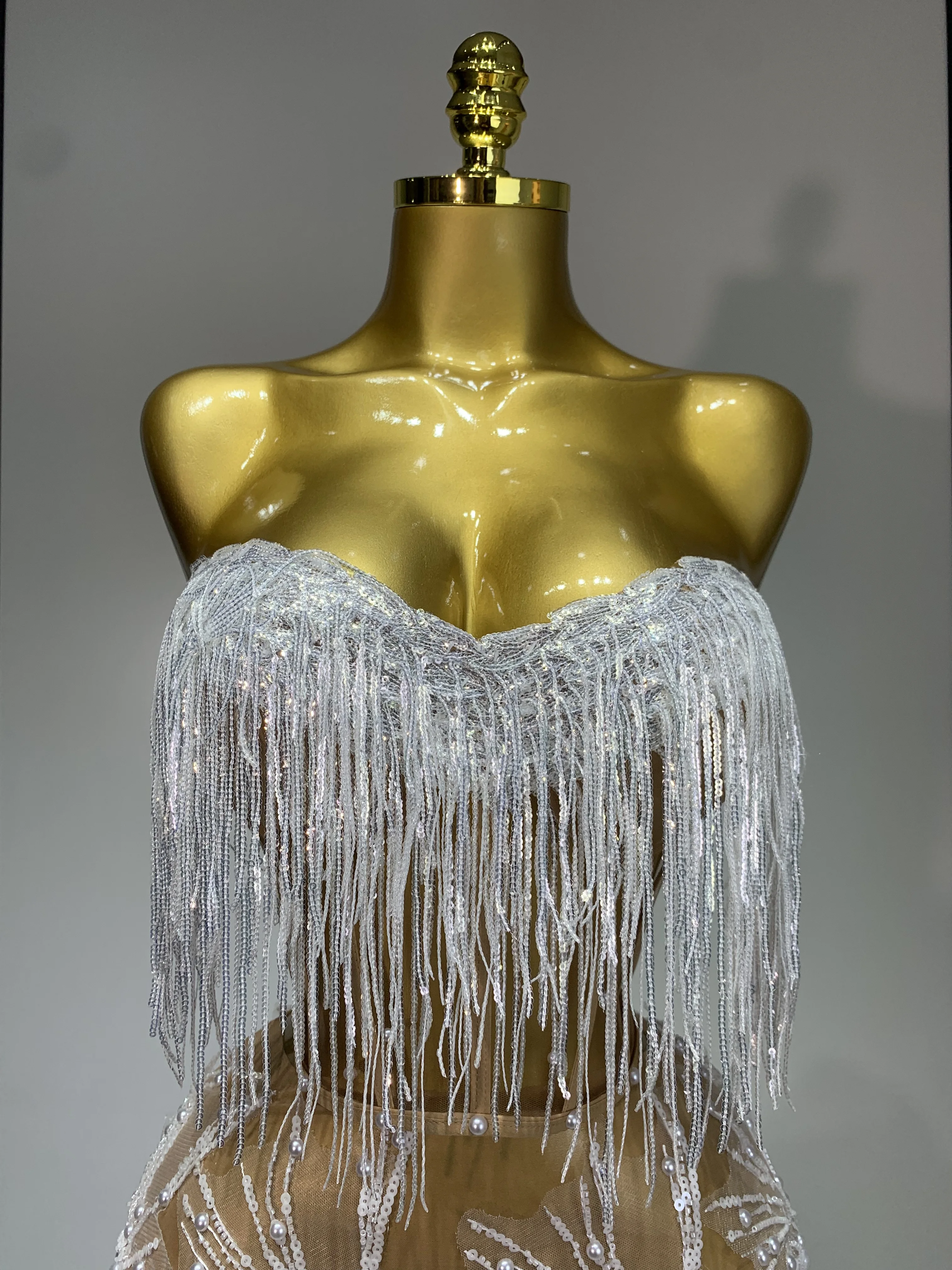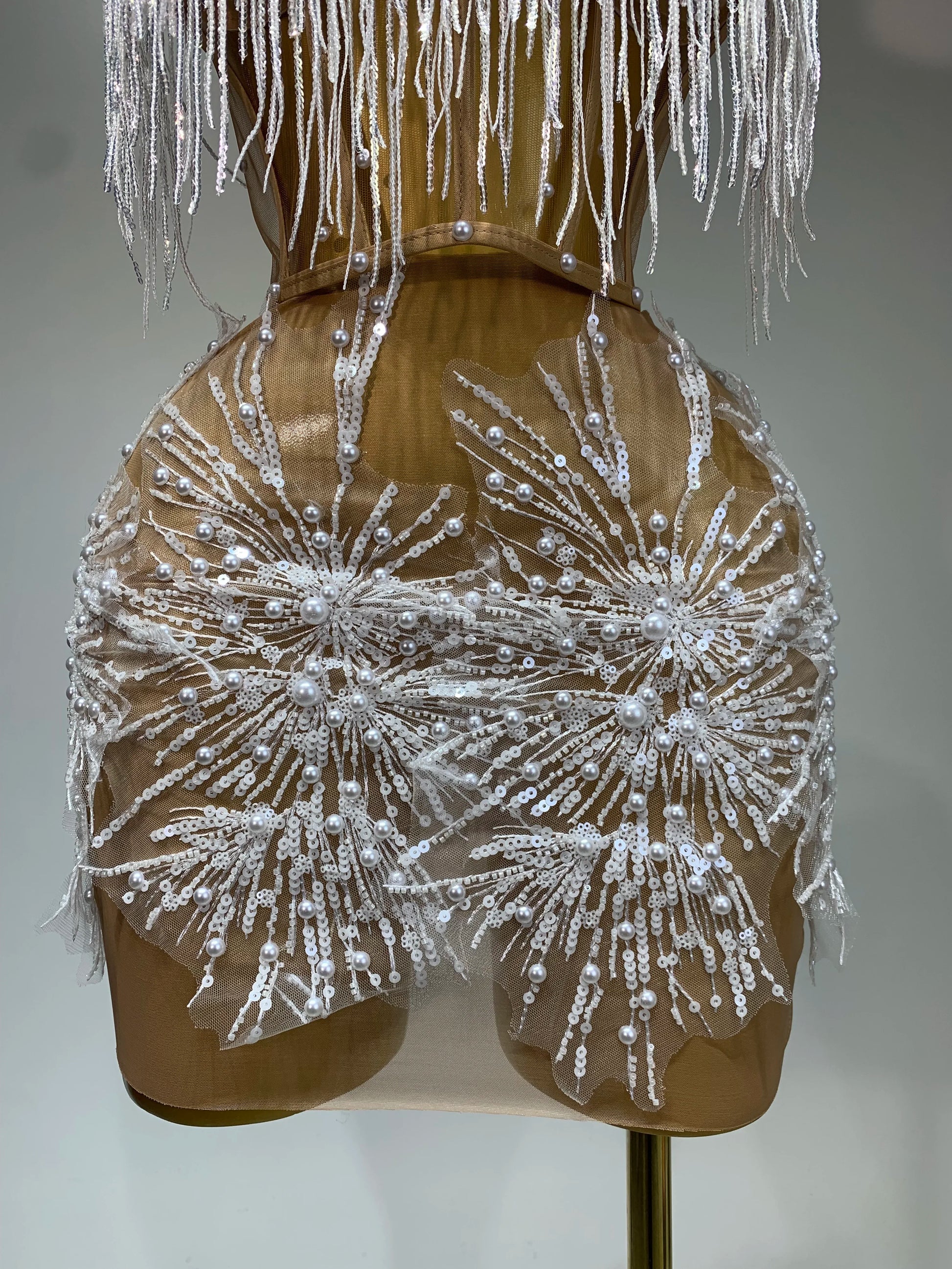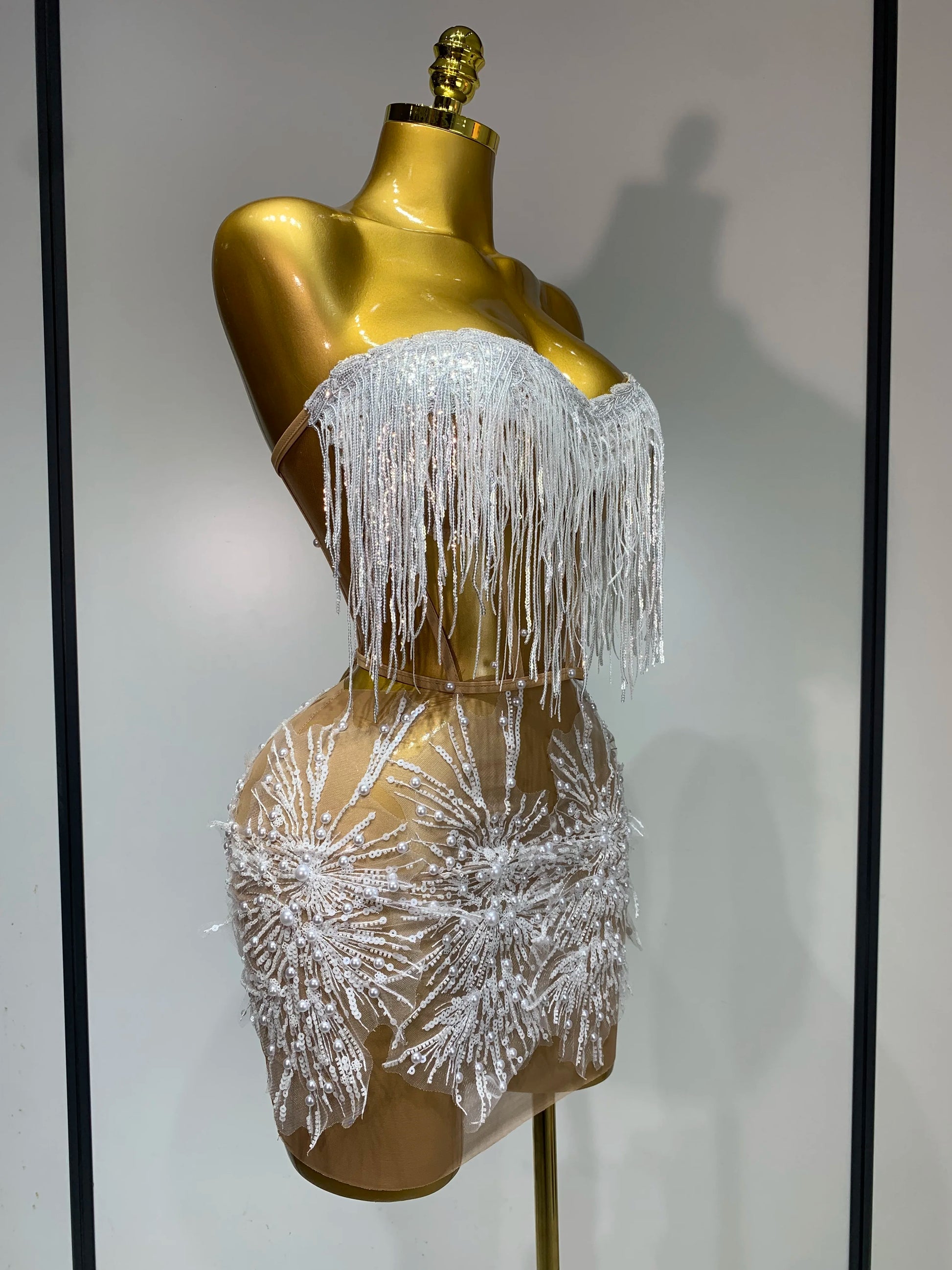 Women Sexy Mesh See Through Pearl Lace Party Mini Dress Celebrate Birthday Photo Shoot Wear Performance Stage Costume