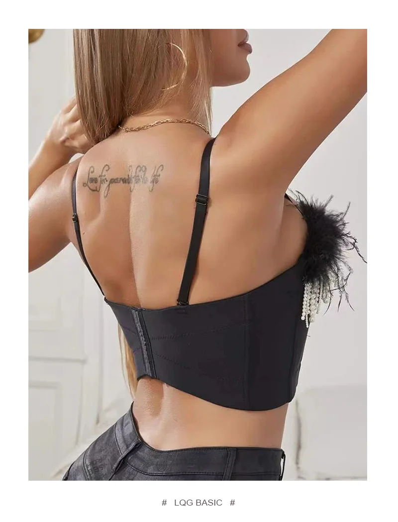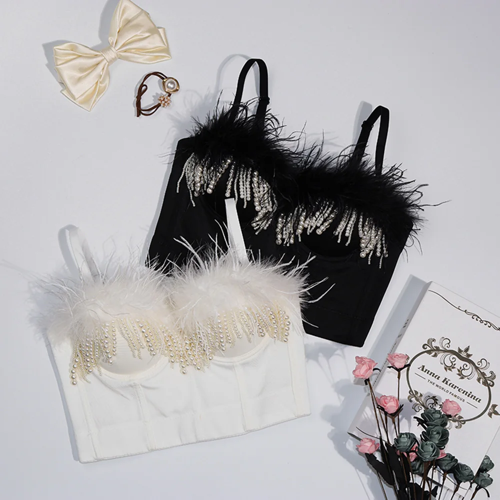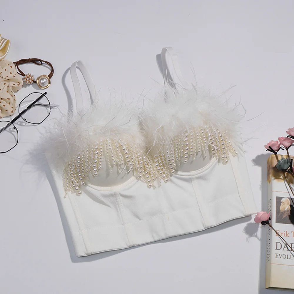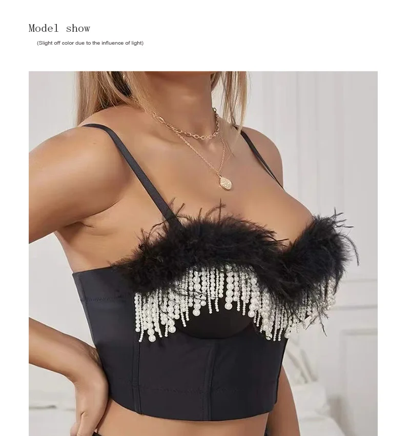 Women Sexy Nail bead embroidery Feathers spaghetti strap camisole tops teen girls Camisoles for Girls