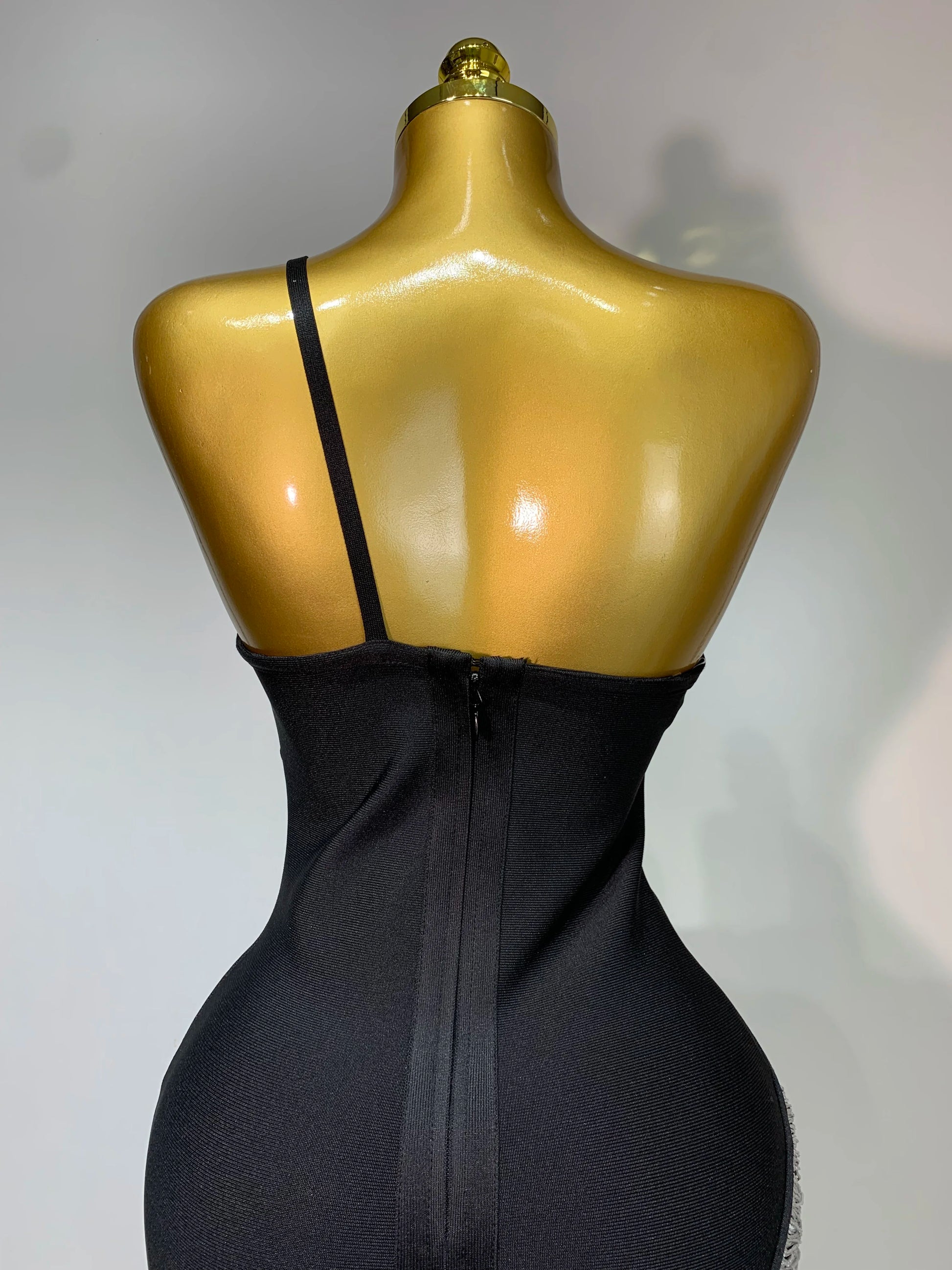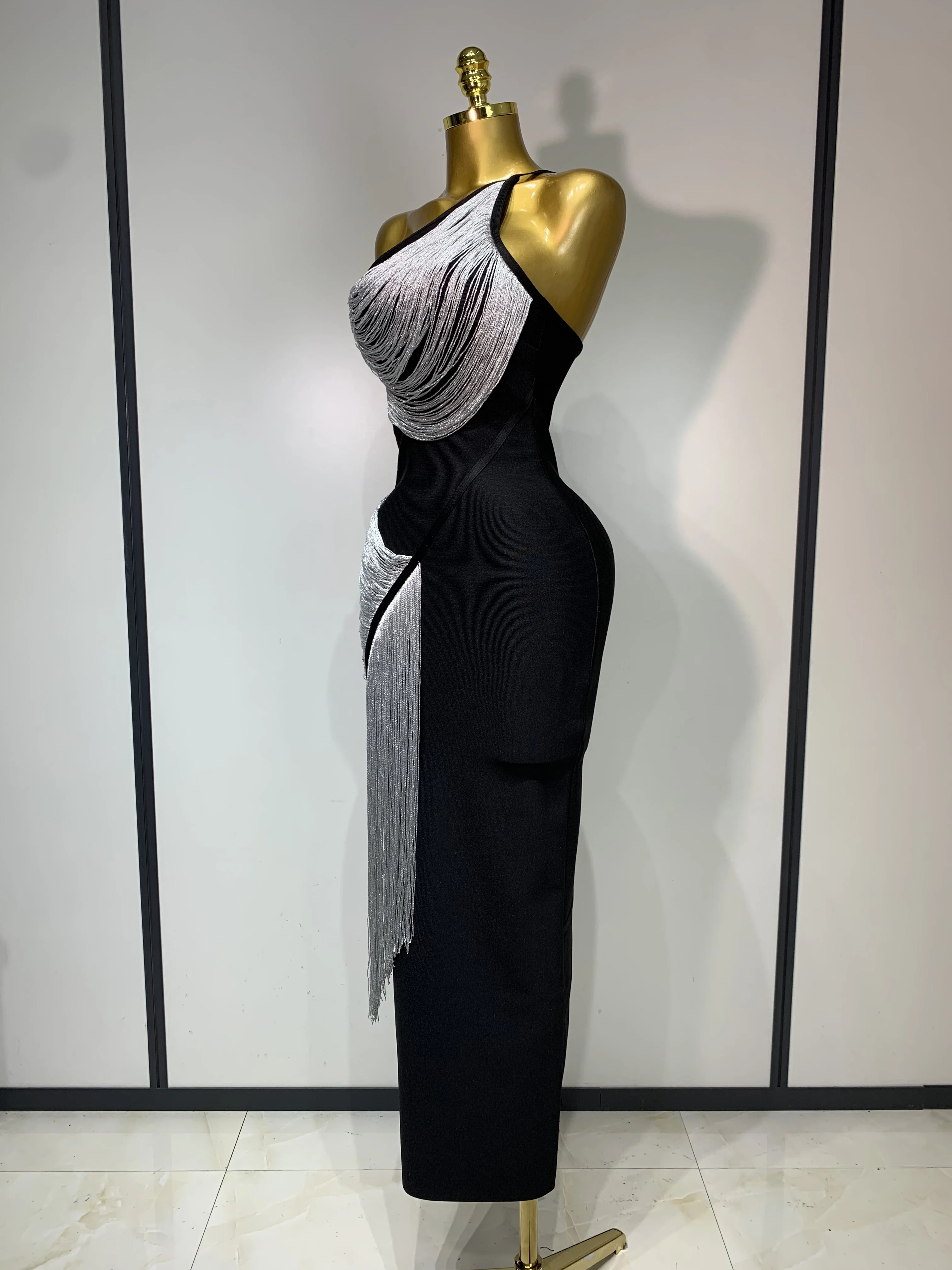 Women Sexy Slanted Collar Silver Tassel Bandage Dress Women Black Sleeveless Bodycon Dresses Evening Party Club Birthday Gowns