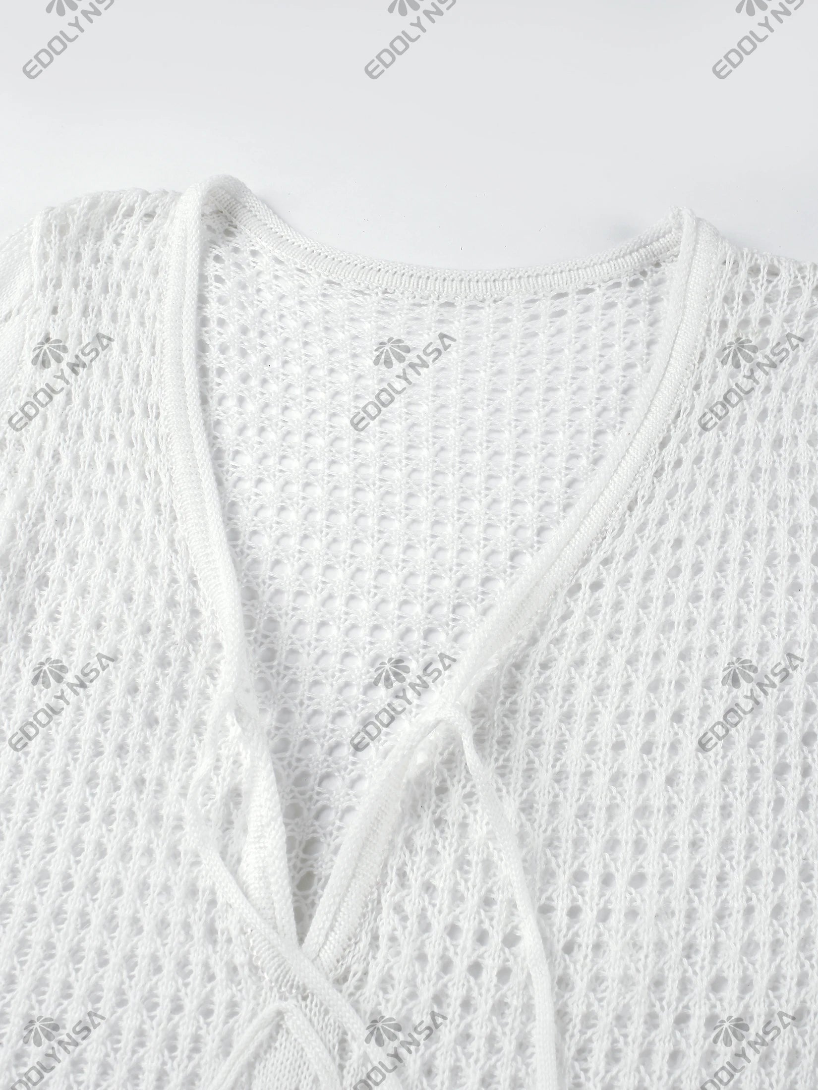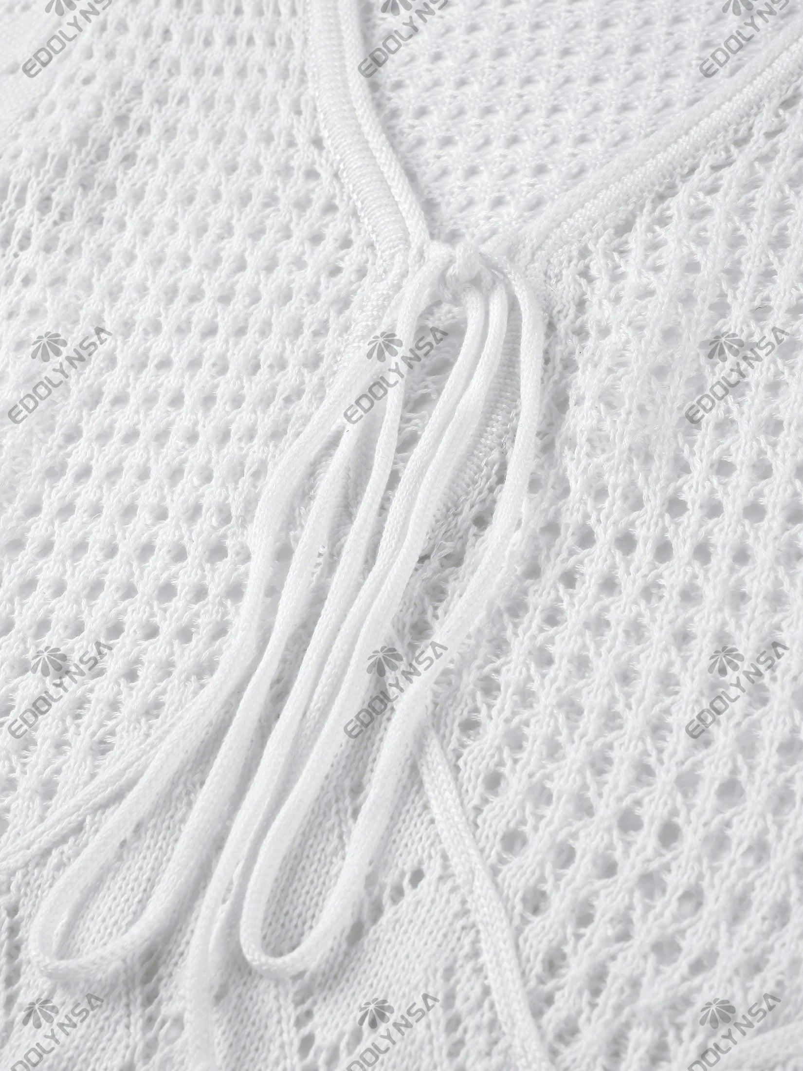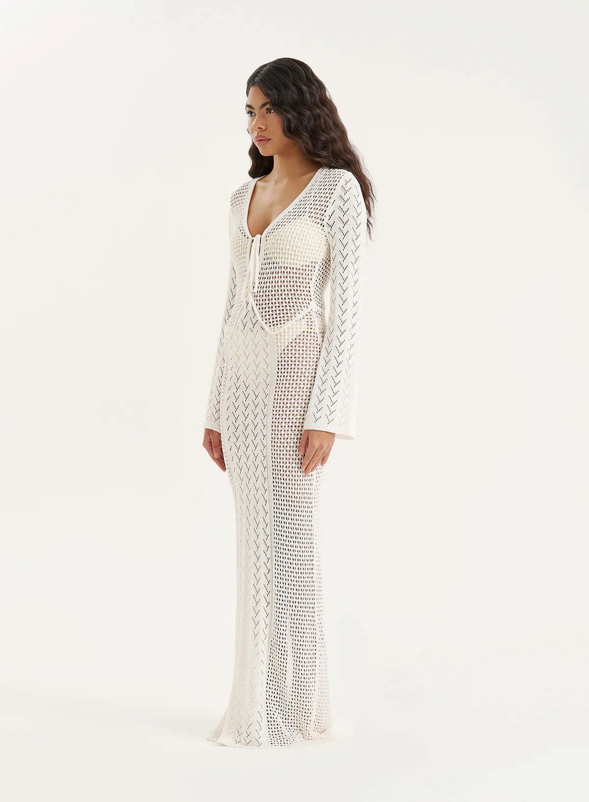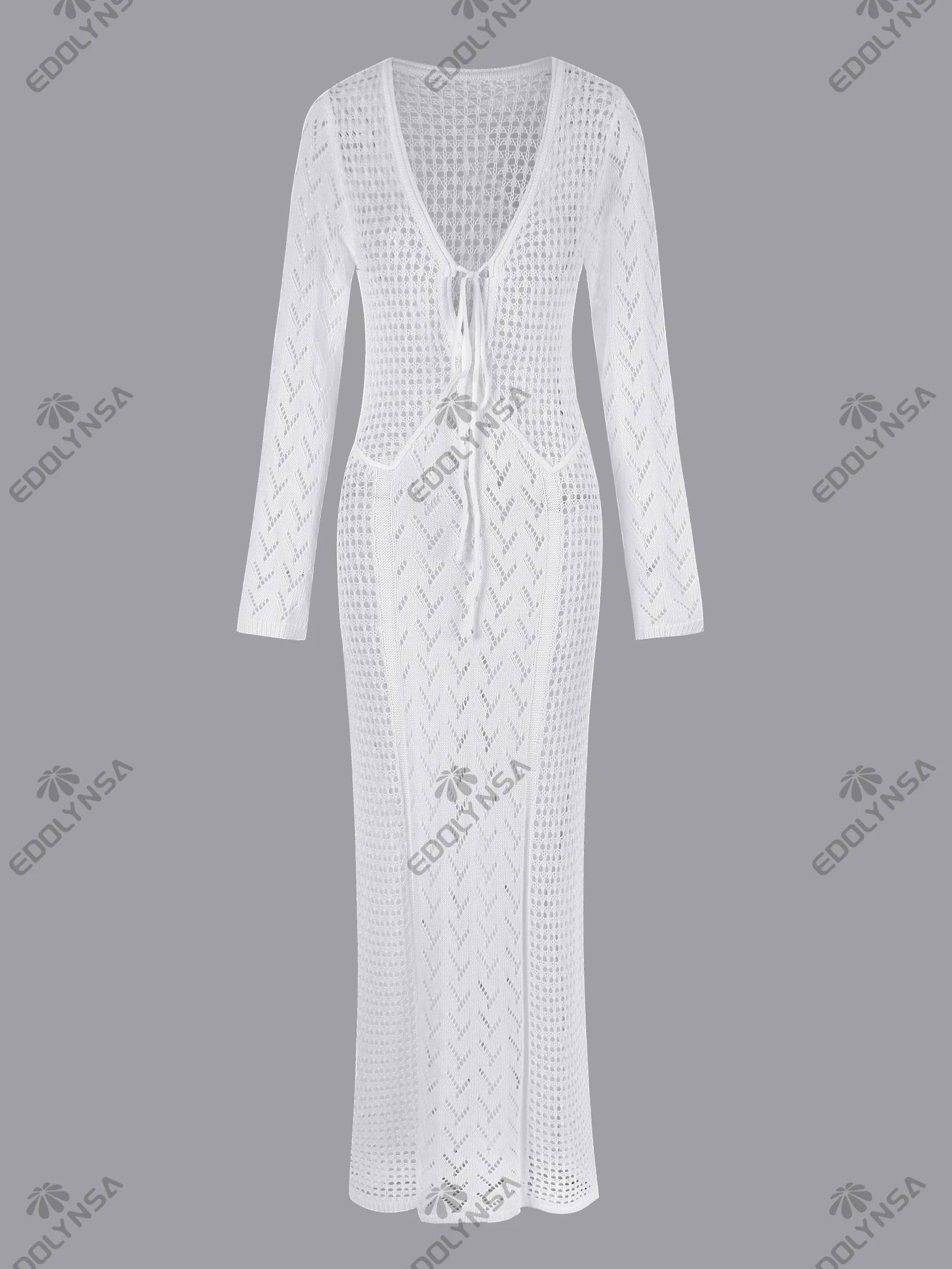 Women Sexy White Knit Swimsuit Cover Up Deep V-neck Tie Hollow Out Long Sleeve Beach Maxi Dress 2025 Summer Holiday Outfit K186