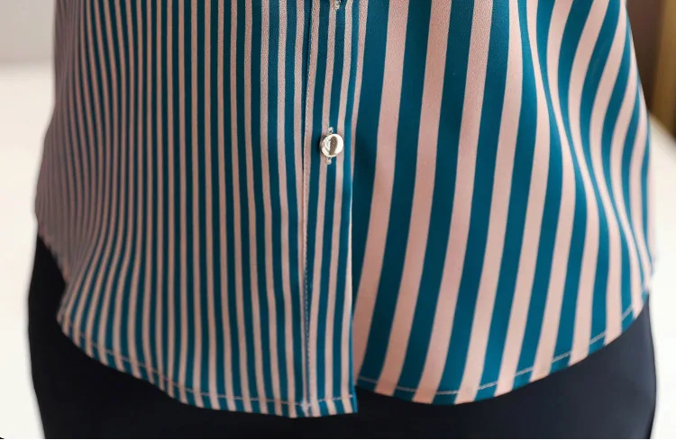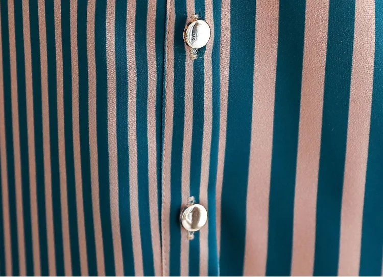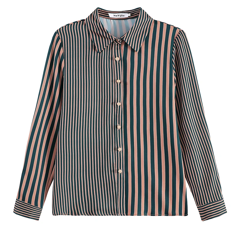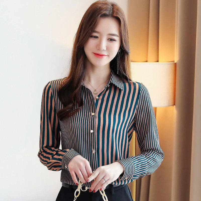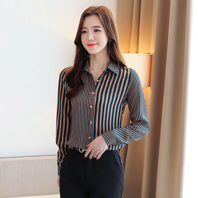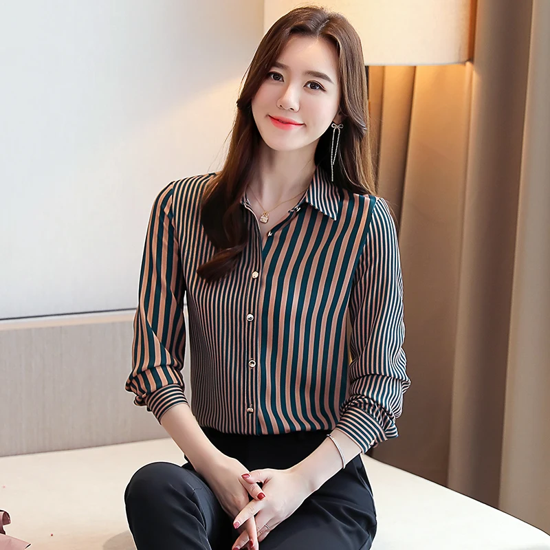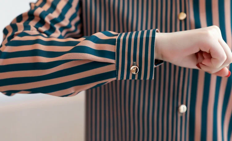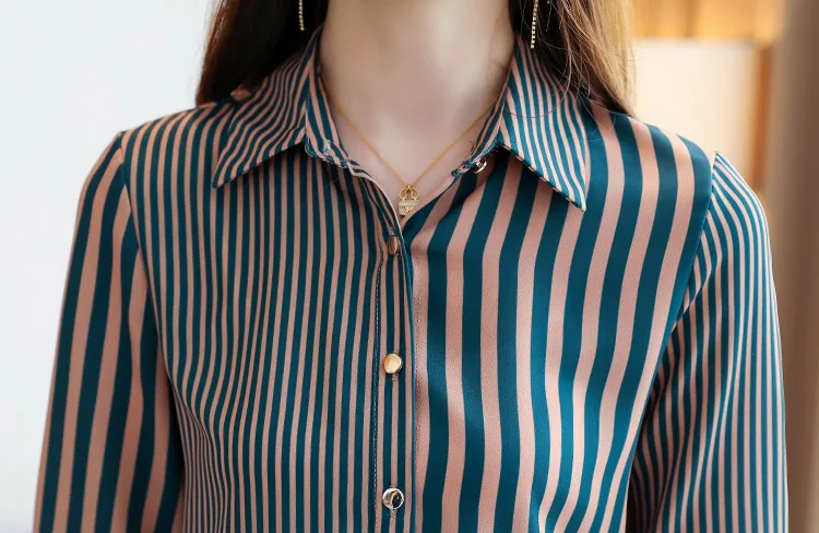 Women Shirt Casual Polo Neckline Single Breasted Striped Slim Blouse Ladies Work Shirts