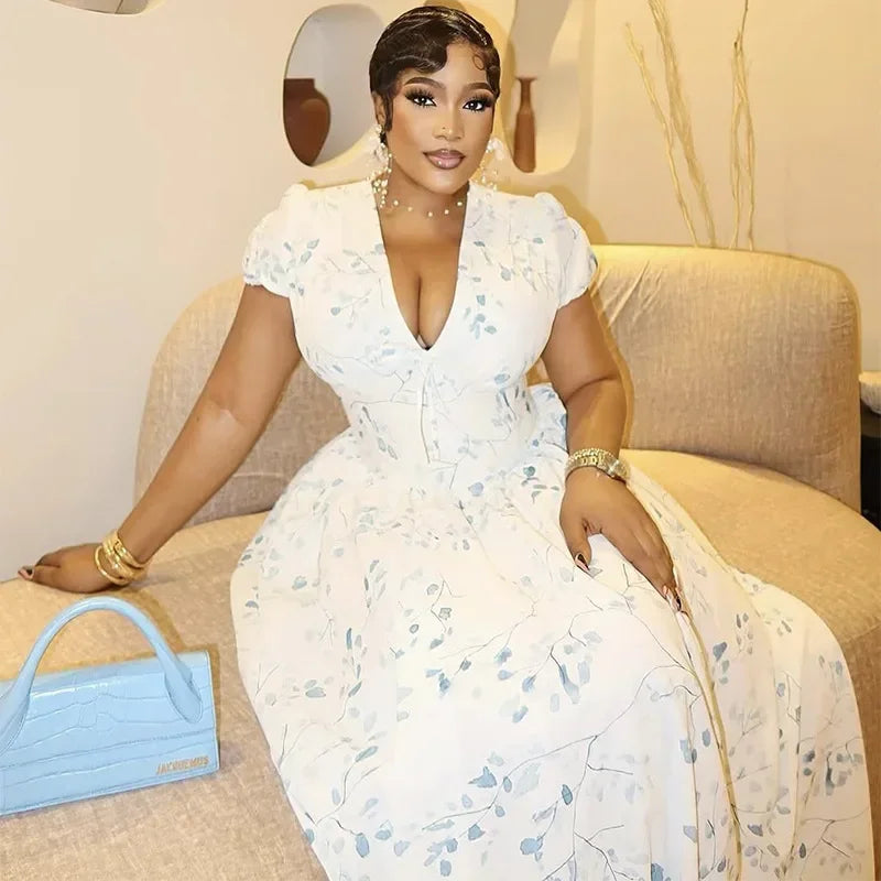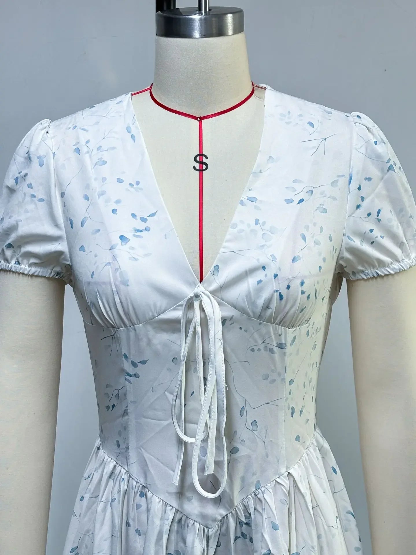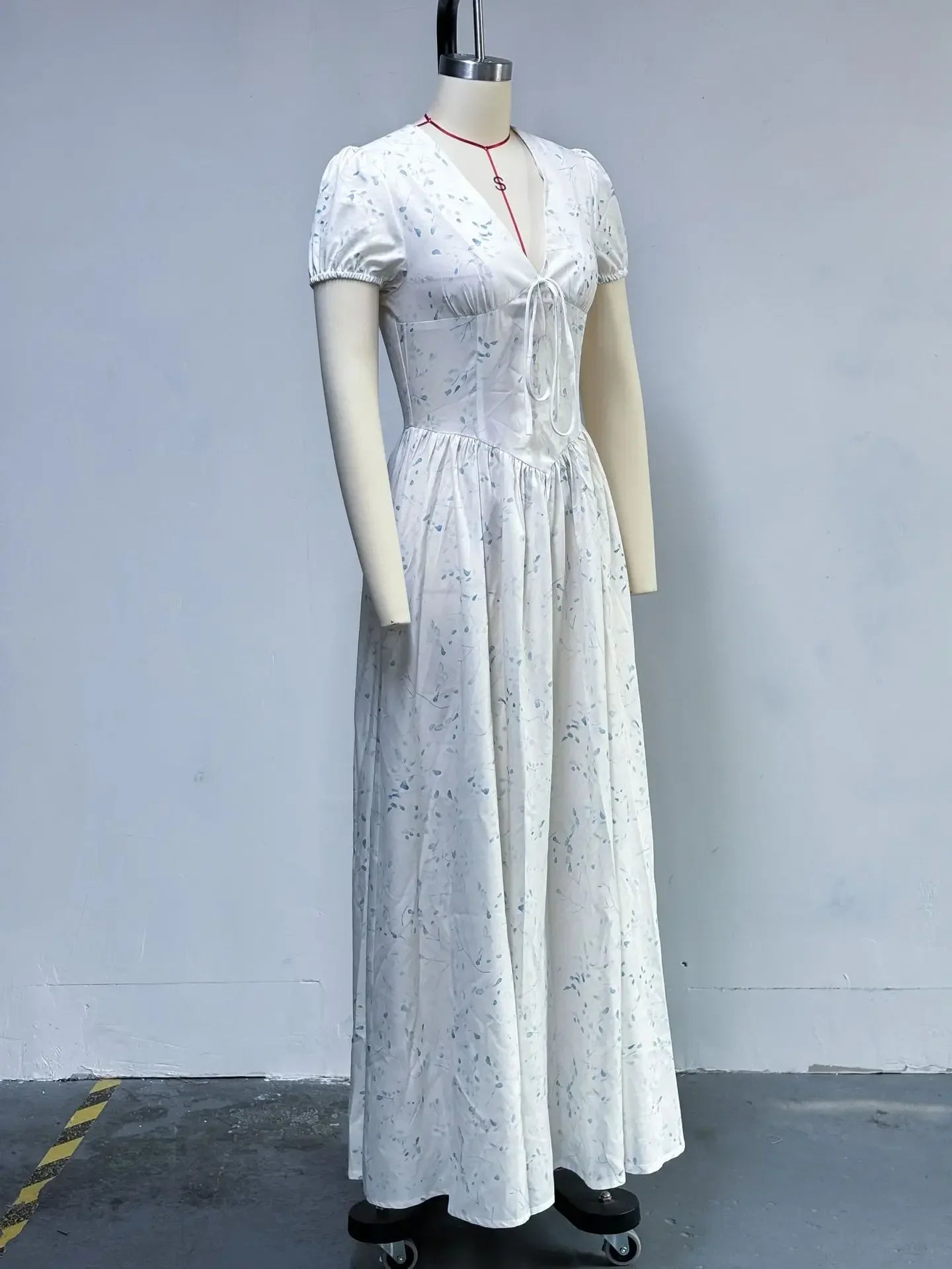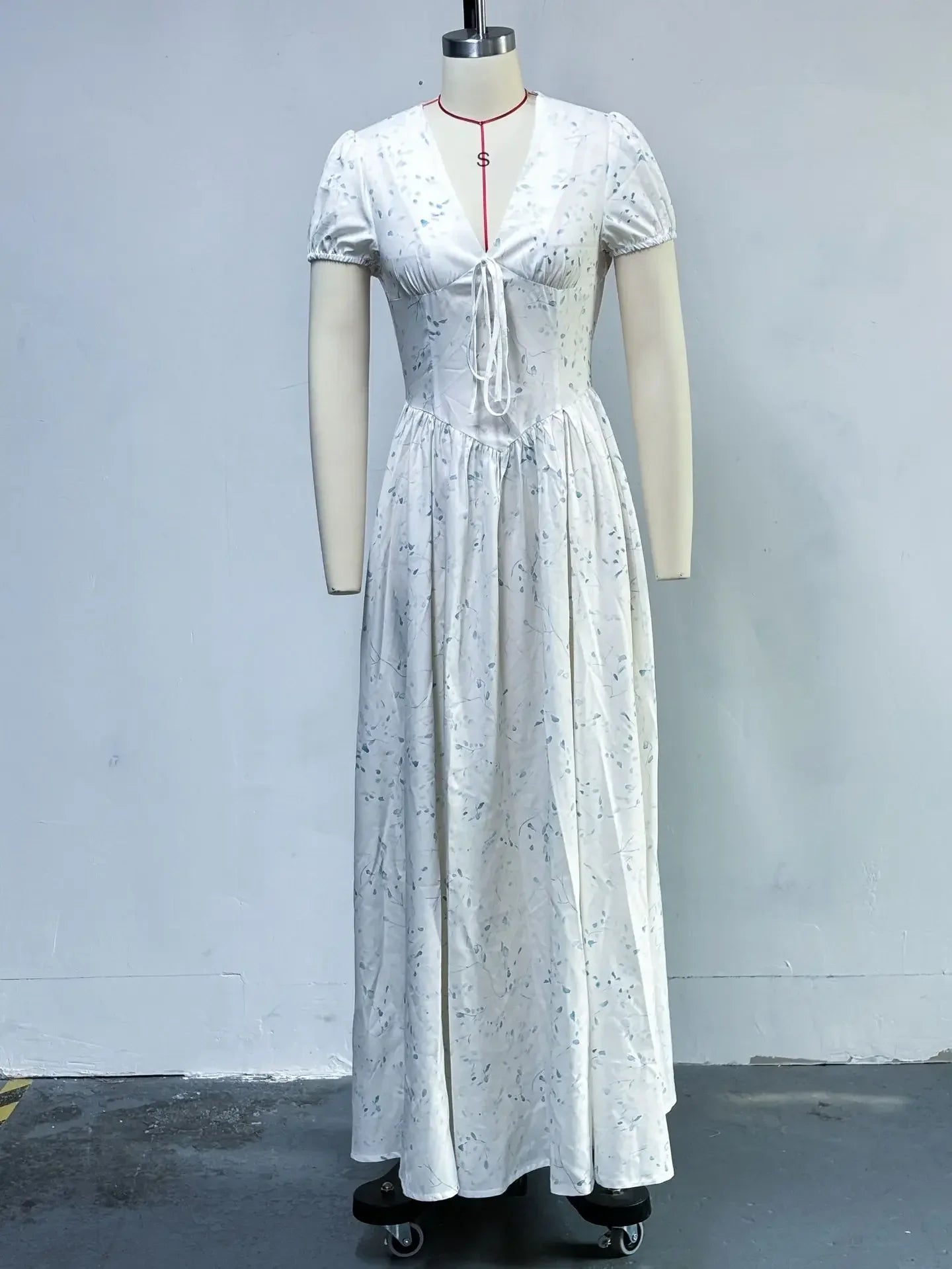 Women Short Sleeve Print V-neck Elegant Long Pleated Dress 2025 Sweet Holiday Beach Evening Sexy Party Dresses Vestidos
