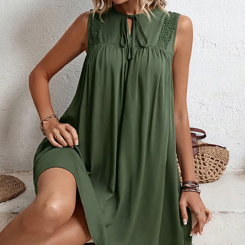 Women Soild Colour Casual V Neck Lace Up Sleeveless Mini Dress Loose Summer Beach Dresses