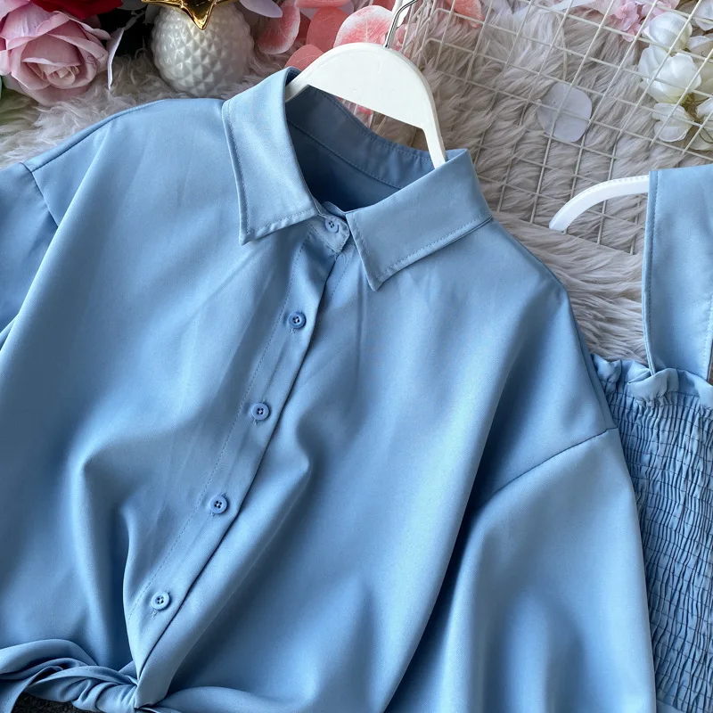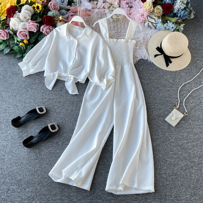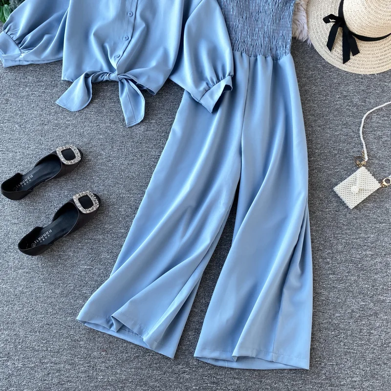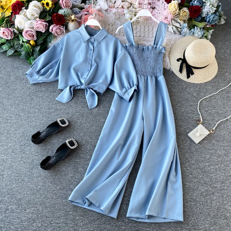 Women Spring Summer Solid Thin Coat+jumpsuits Two Pieces Sets Half Sleeve Jacket Top Jumpsuit Beach Set Suits Wide Leg Pants Set