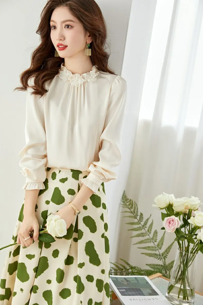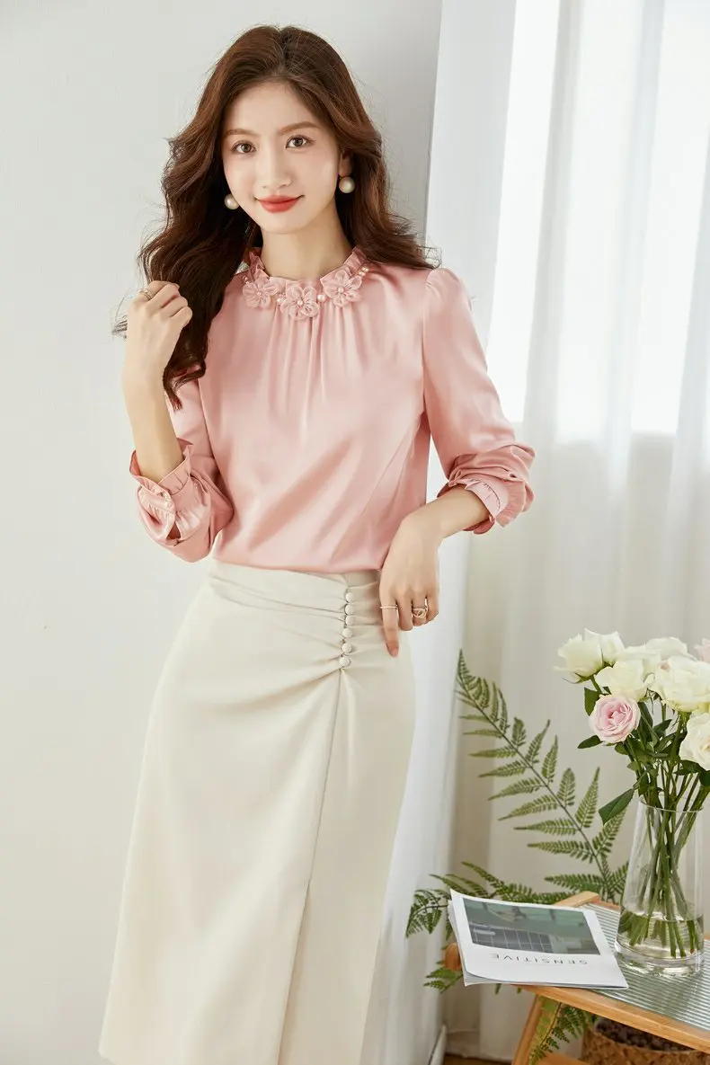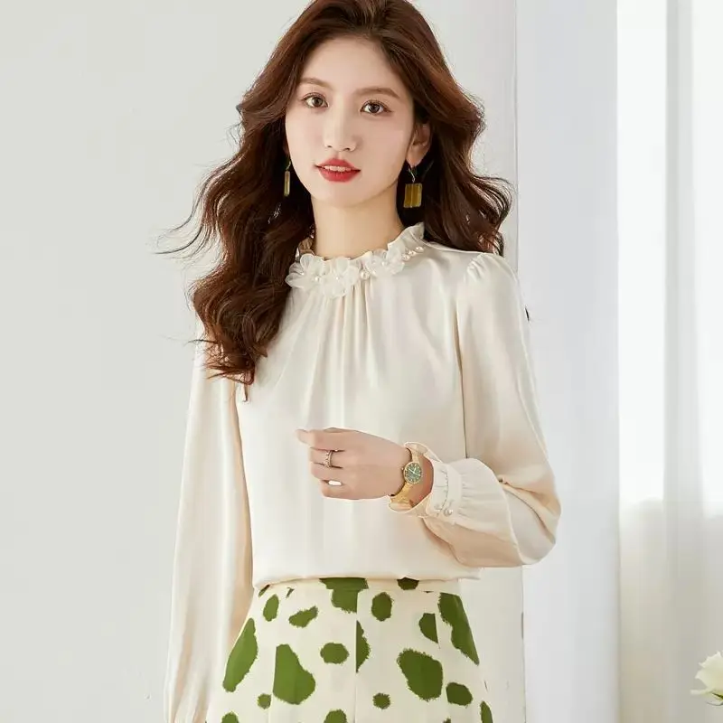 Women Stand Collar Petal Satin Shirts Long Sleeve Office Lady Elegant Spring Casual Pleated Lace Tops Pullover Blouse Shirt