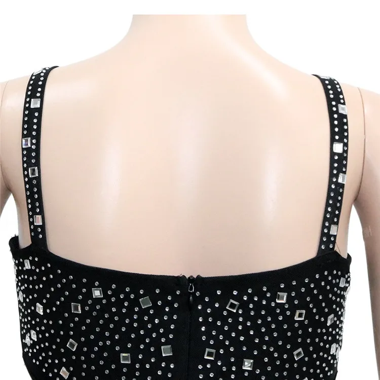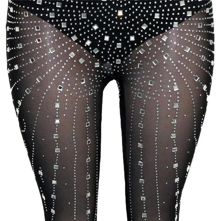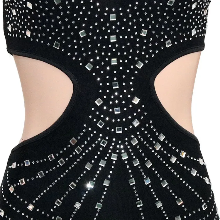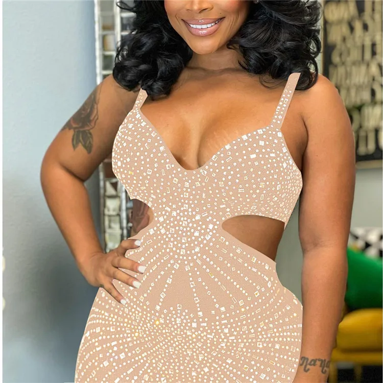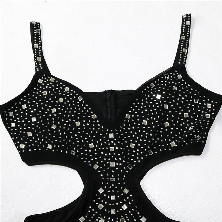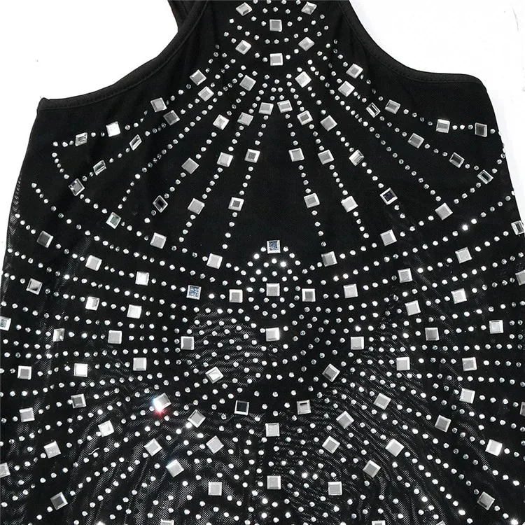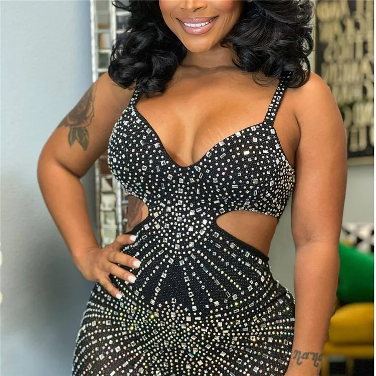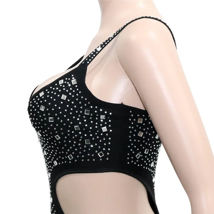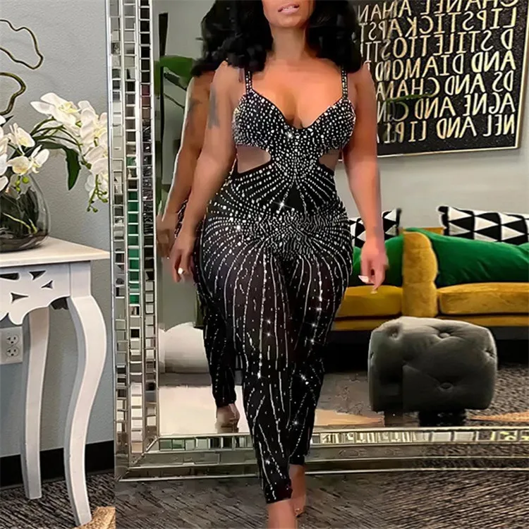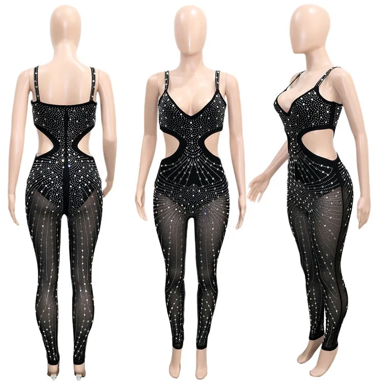 Women Summer Patchwork Hollow Out Rhinestones Sleeveless Tight Clubwear Sexy Overalls
