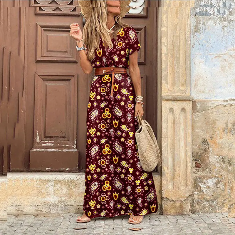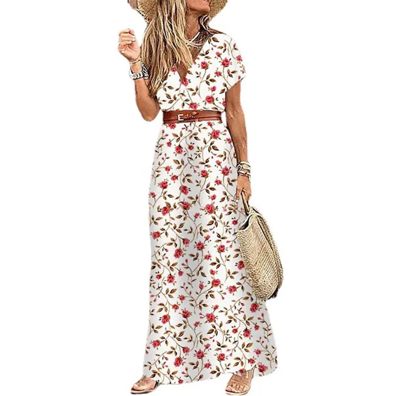 Women Summer Sexy Short Sleeve Print Casual Long Maxi Elegant Lady Beach Dress